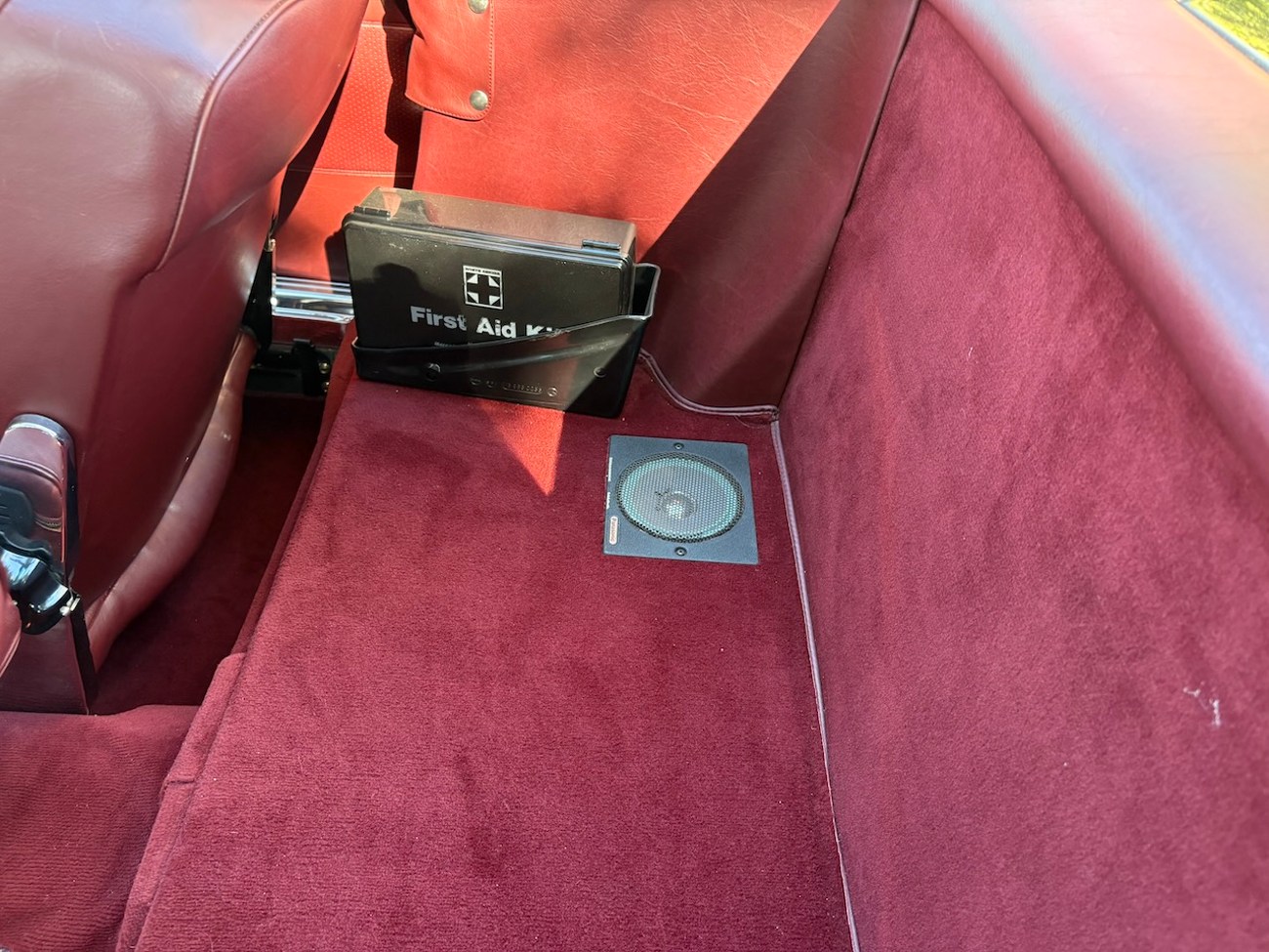 The cabin is upholstered in Medium Red Leather (277) across the seats, door cards, armrest, and head rests. Matching red carpets are shown with OEM red velour floor mats. The center console is trimmed in burl wood where controls are mounted for the automatic climate control along with the digital head unit. The dashboard wears a black cap with no blemishes. Aftermarket speakers are mounted in the rear parcel shelf.