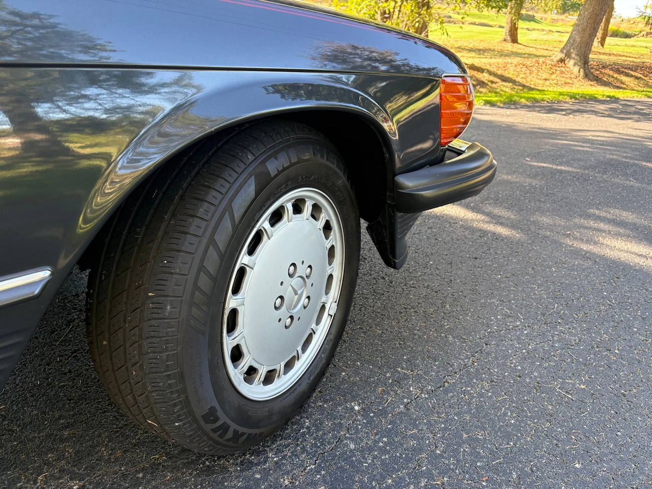This 560SL wears original silver-painted 15x7” Gullideckel wheels wrapped in Michelin MXV4 measuring 205/65 on all four corners. The wheels show well without any major blemishes and feature original painted center caps.