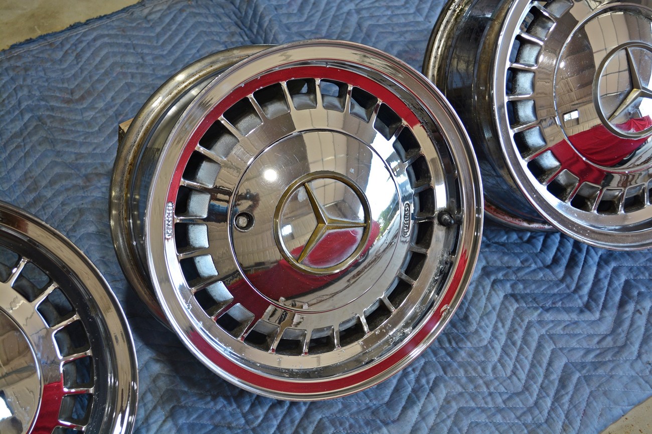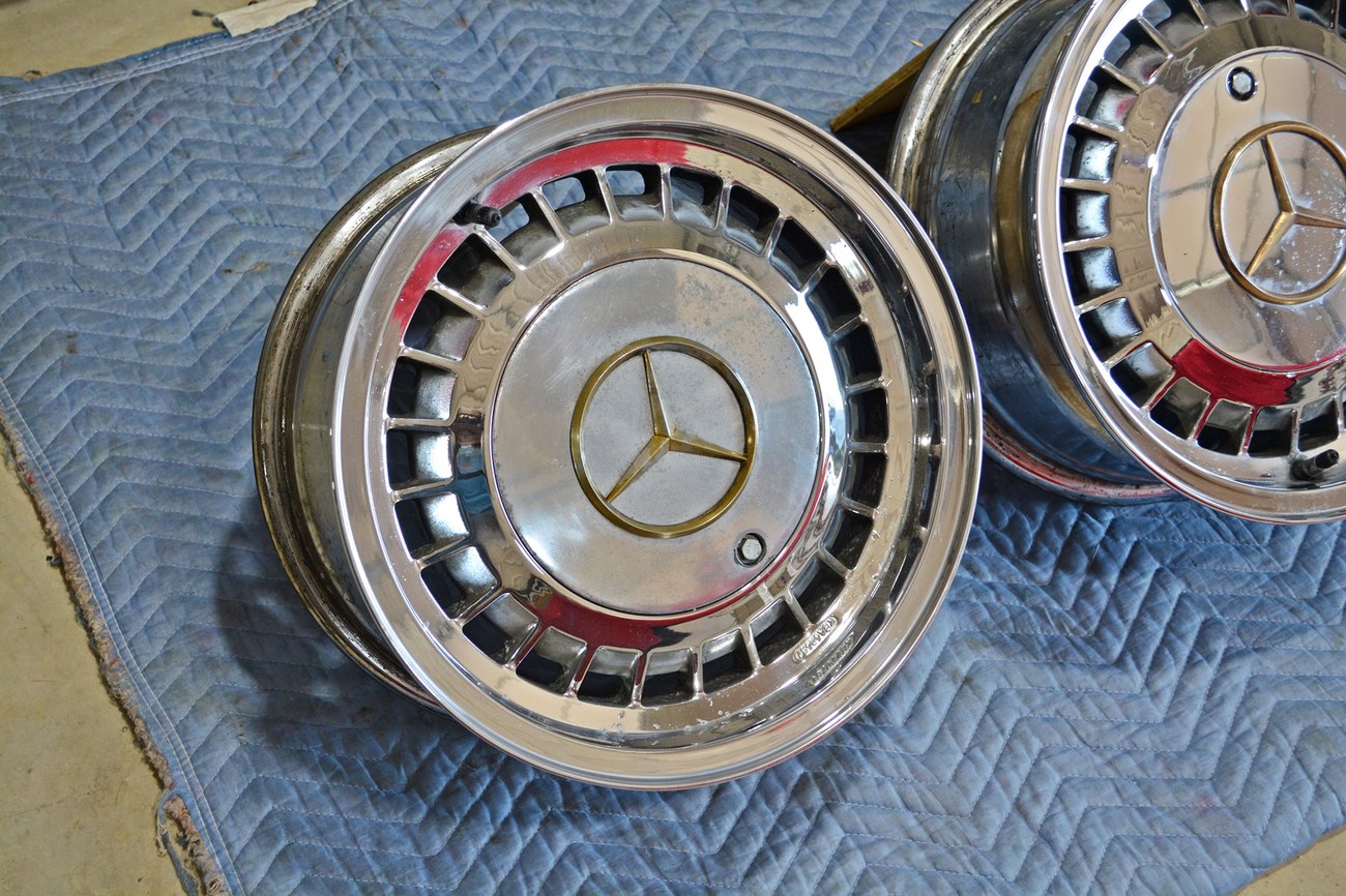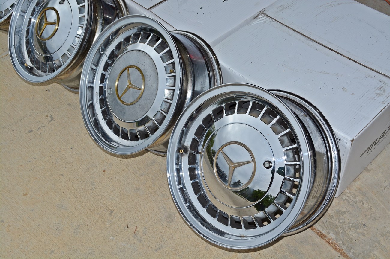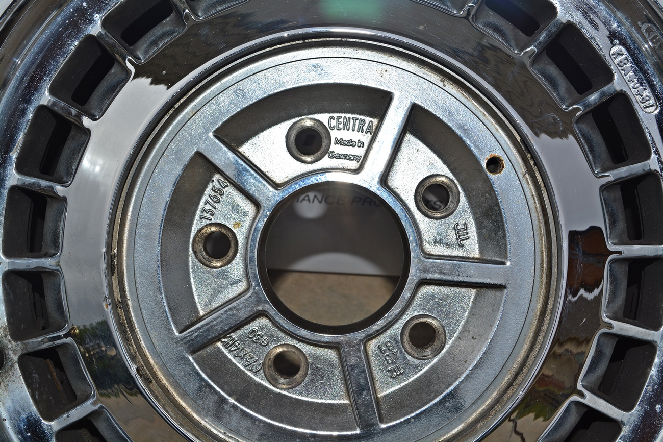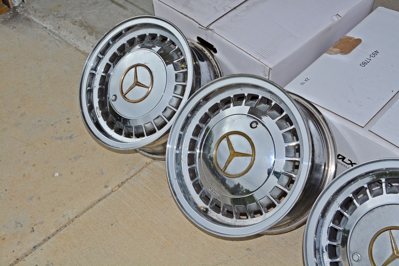 These authentic Centra wheels are commonly found on various classic Mercedes-Benz models including the W126, C126, W116 and R107. The faces are finished in their original chrome. Some wear and pitting can be seen on each of the wheels. The center caps are included and feature the Mercedes-Benz star centered on each. Up close photos of each face are provided in the gallery detailing condition.