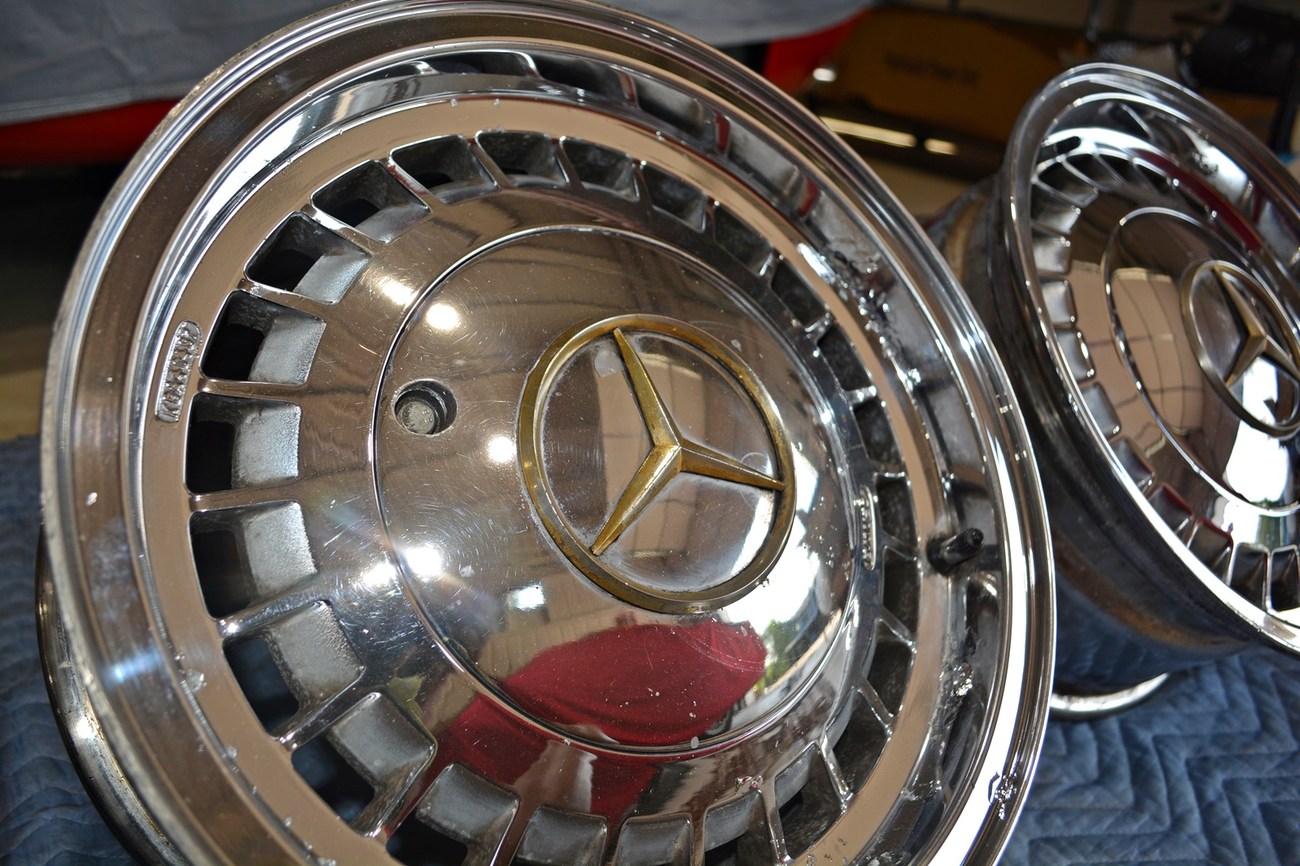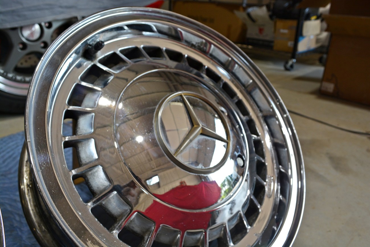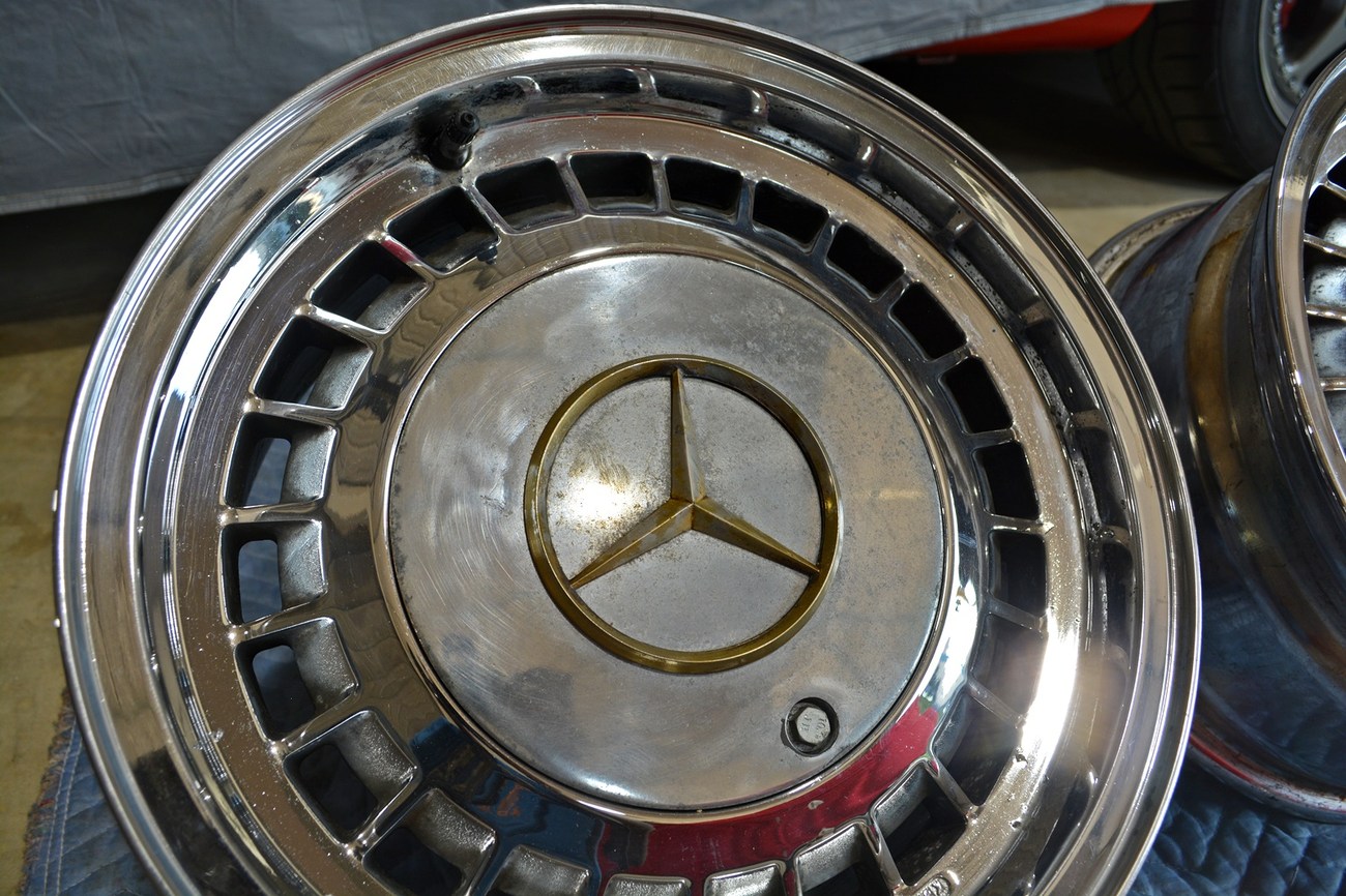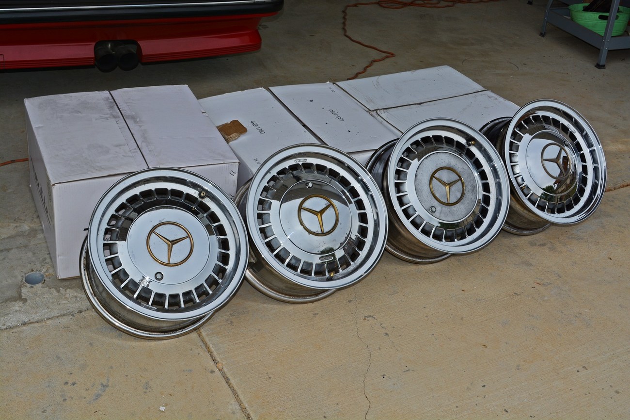 These authentic Centra wheels are commonly found on various classic Mercedes-Benz models including the W126, C126, W116 and R107. The faces are finished in their original chrome. Some wear and pitting can be seen on each of the wheels. The center caps are included and feature the Mercedes-Benz star centered on each. Up close photos of each face are provided in the gallery detailing condition.