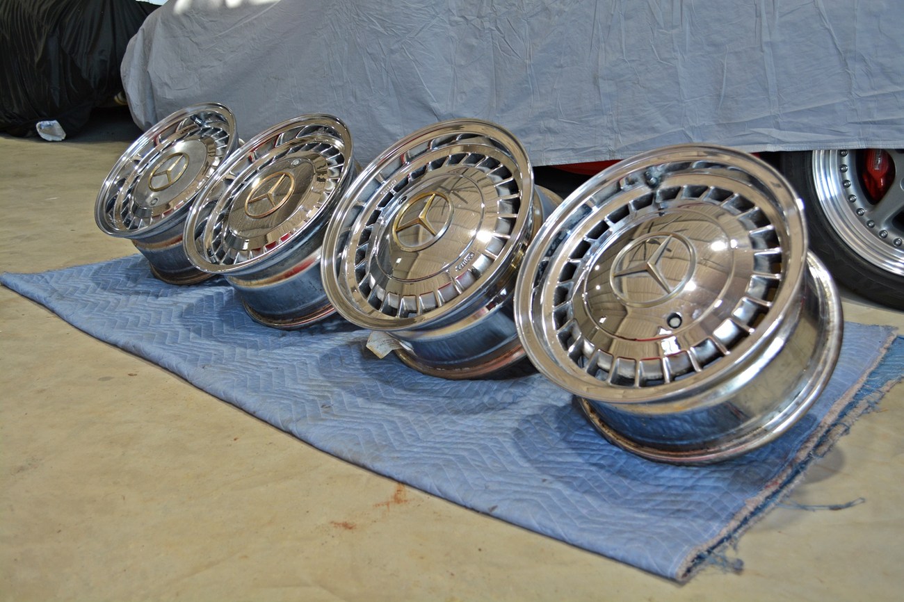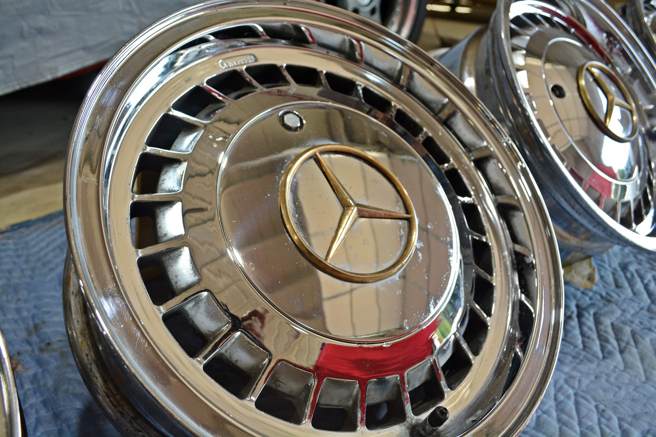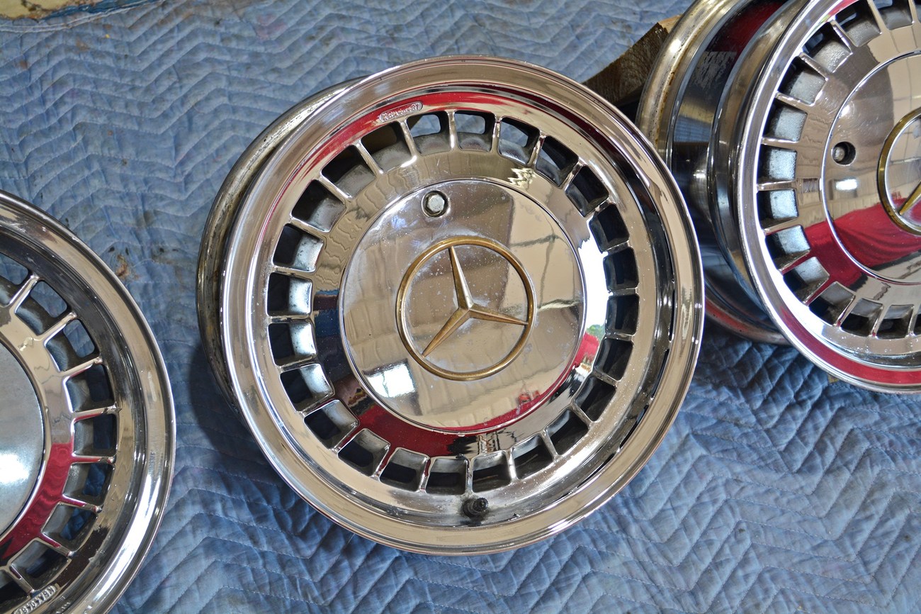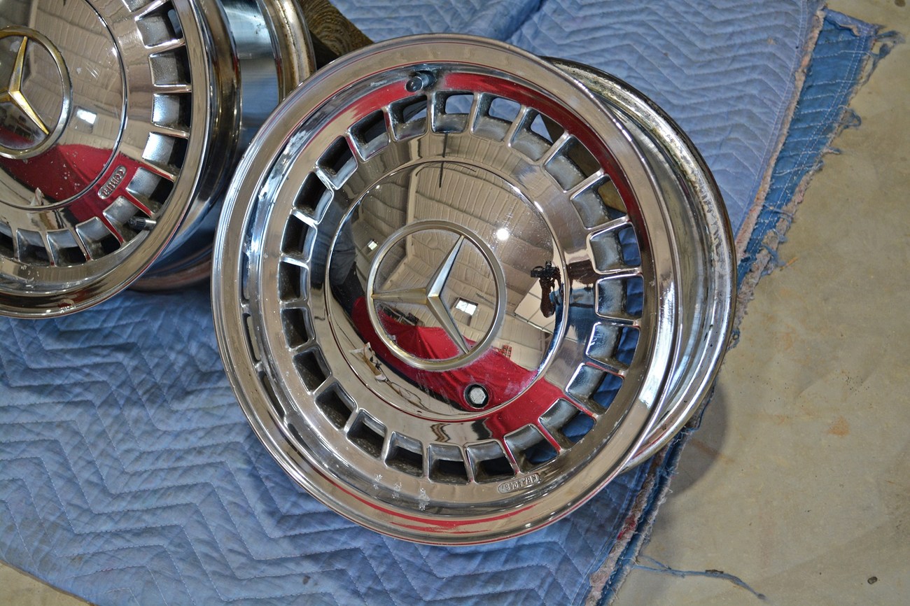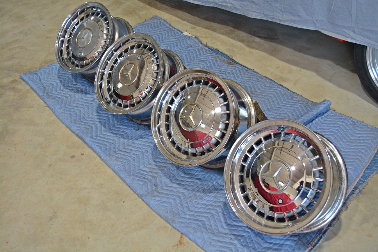 These authentic Centra wheels are commonly found on various classic Mercedes-Benz models including the W126, C126, W116 and R107. The faces are finished in their original chrome. Some wear and pitting can be seen on each of the wheels. The center caps are included and feature the Mercedes-Benz star centered on each. Up close photos of each face are provided in the gallery detailing condition.