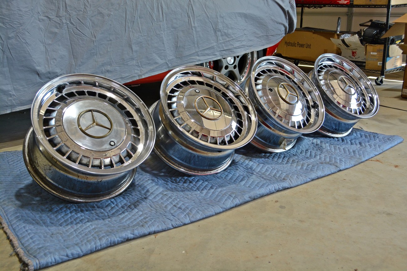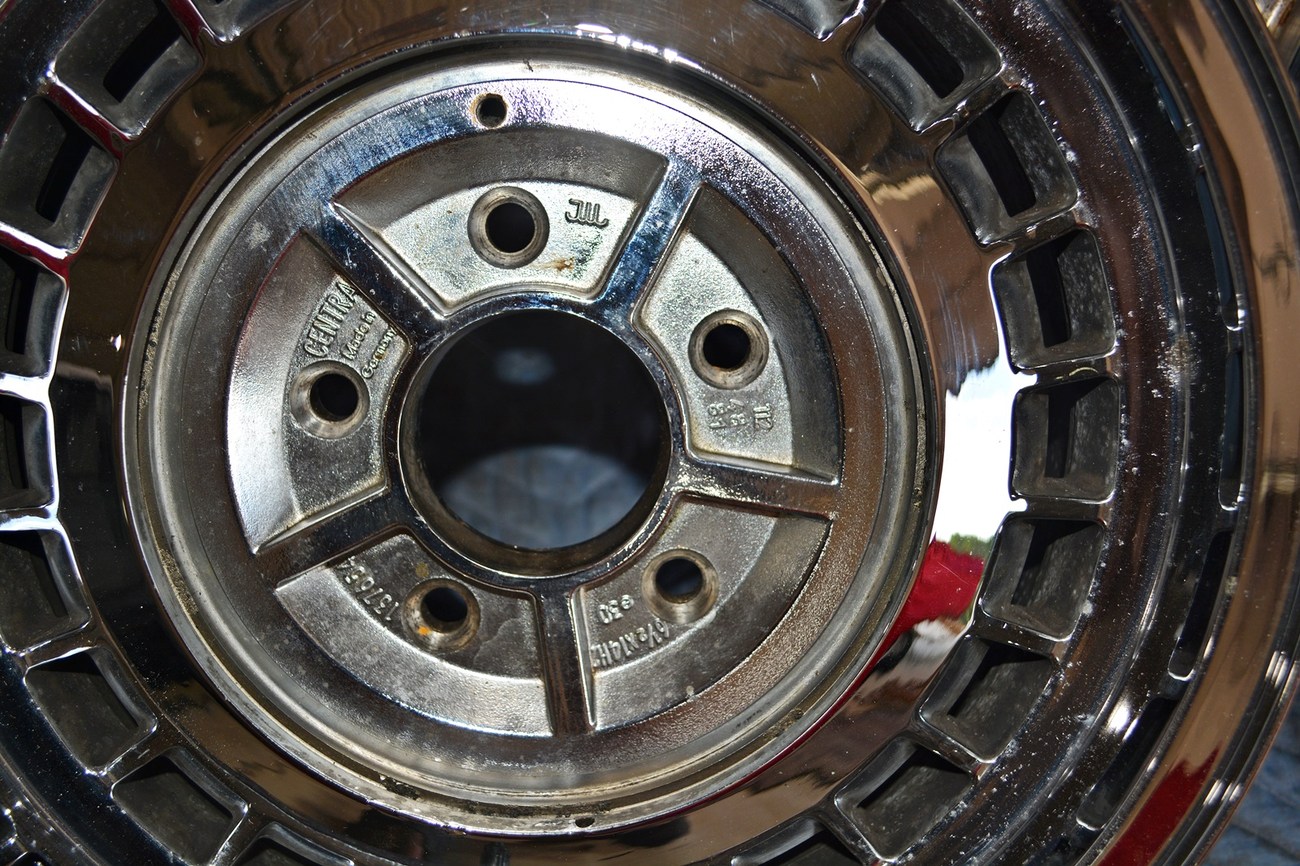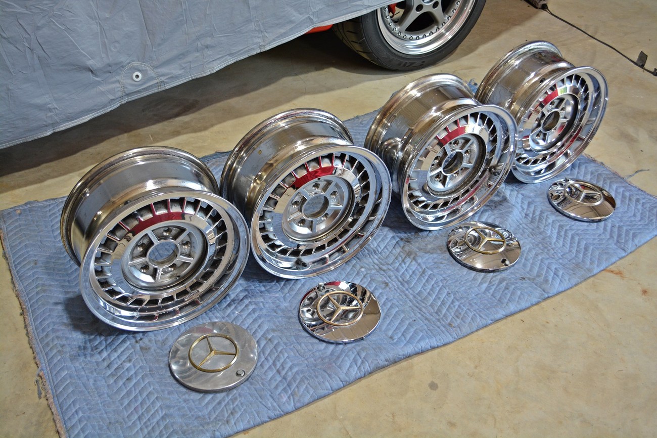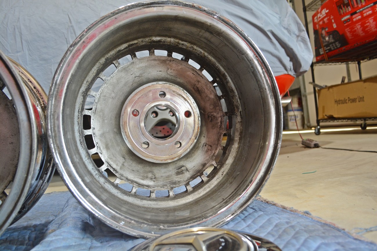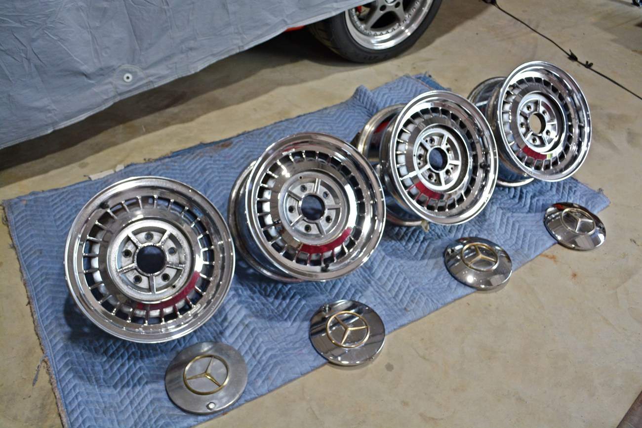 These authentic Centra wheels are commonly found on various classic Mercedes-Benz models including the W126, C126, W116 and R107. The faces are finished in their original chrome. Some wear and pitting can be seen on each of the wheels. The center caps are included and feature the Mercedes-Benz star centered on each. Up close photos of each face are provided in the gallery detailing condition.
