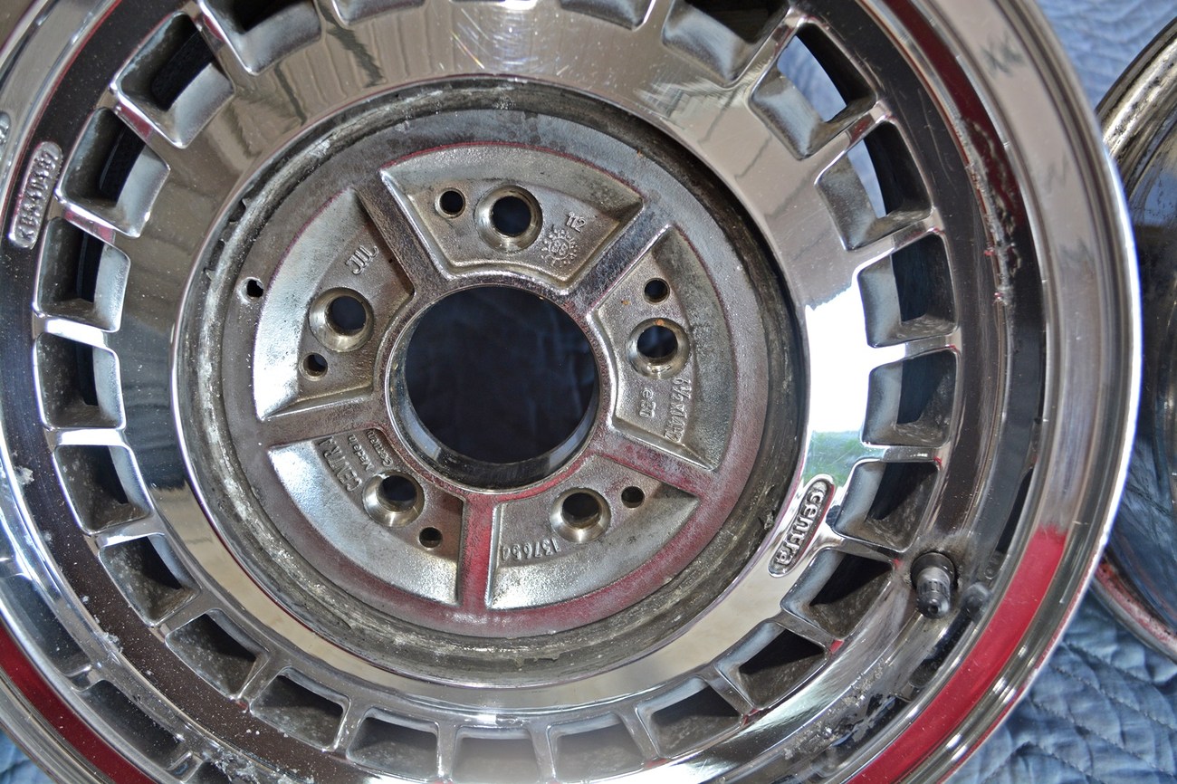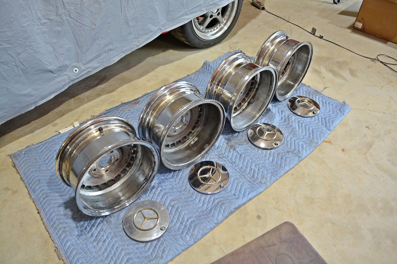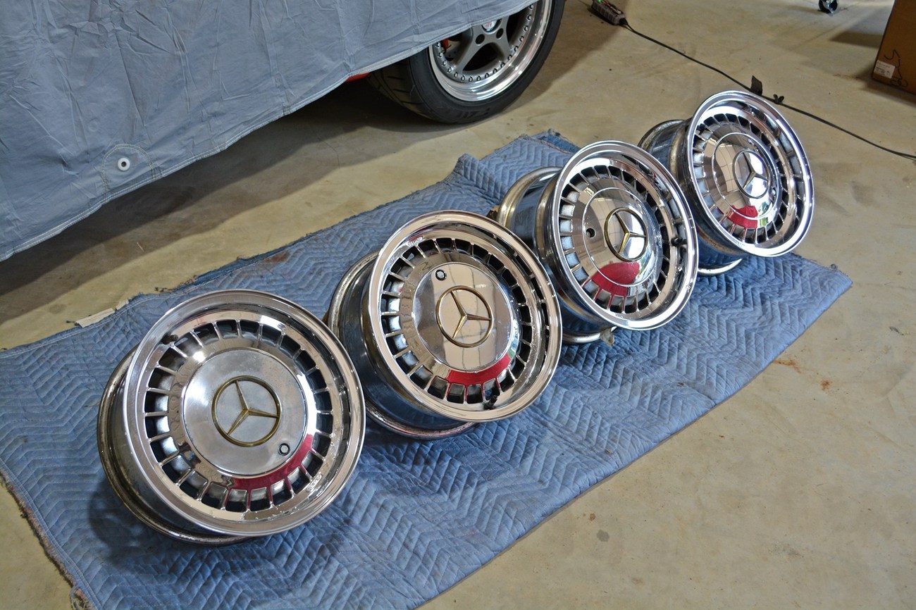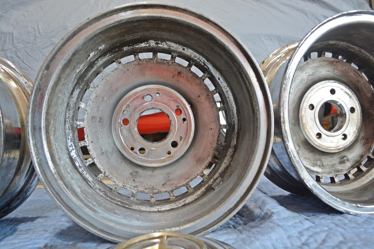 These authentic Centra wheels are commonly found on various classic Mercedes-Benz models including the W126, C126, W116 and R107. The faces are finished in their original chrome. Some wear and pitting can be seen on each of the wheels. The center caps are included and feature the Mercedes-Benz star centered on each. Up close photos of each face are provided in the gallery detailing condition.