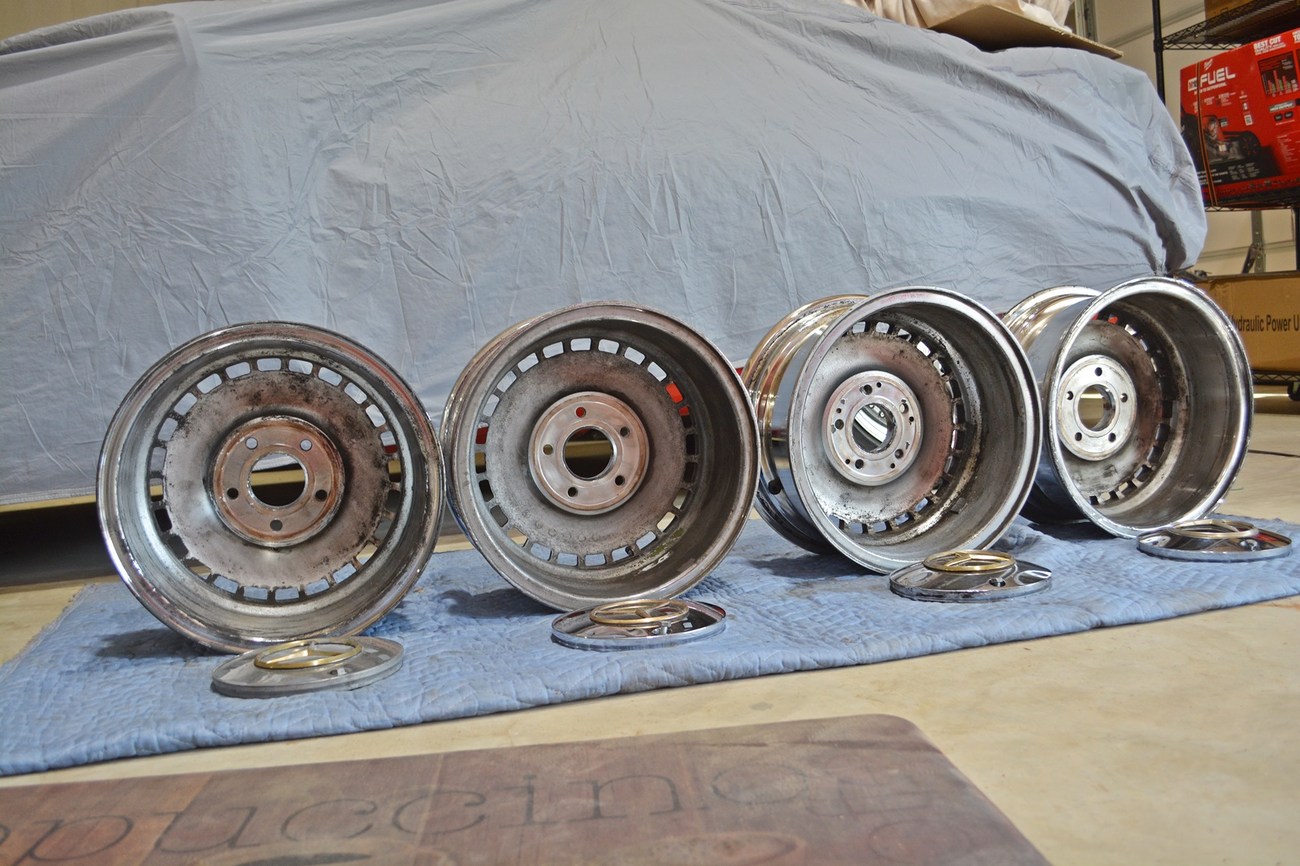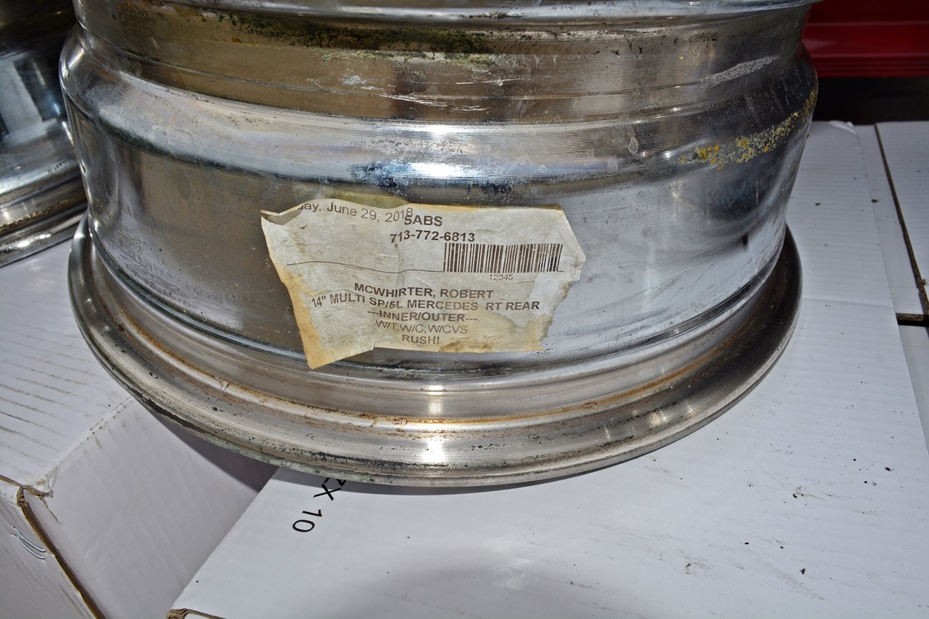 These 14″ Centra T31 (Type 31) wheels measure 6.5″ wide on all around and were manufactured in Germany for use on Mercedes-Benz vehicles. The faces are finished in their original chrome which shows visible pitting and wear. Original Centra center caps are removable and included along with all 4 locking nuts. The wheels fit various Mercedes-Benz models and were most recently used on the seller's W126. Dimensions, offsets, and other manufacturer casting marks are present on each wheel. These Centra wheels are now offered at No Reserve by the seller in Providence Village, Texas with shipping options available.