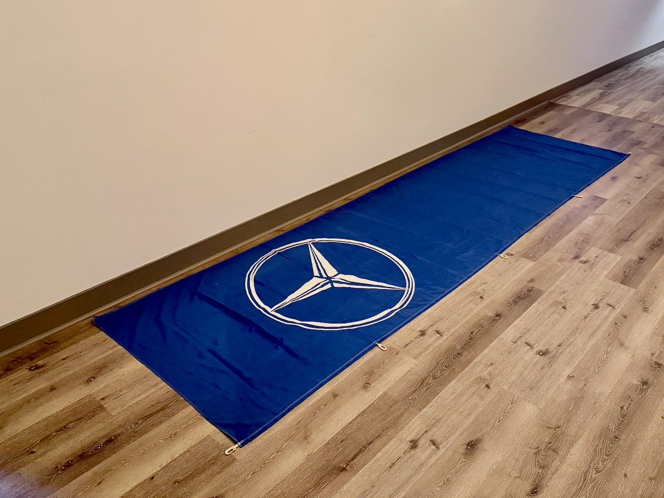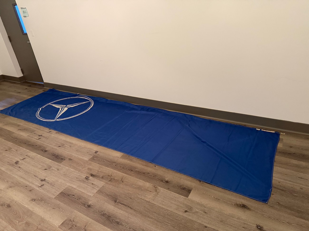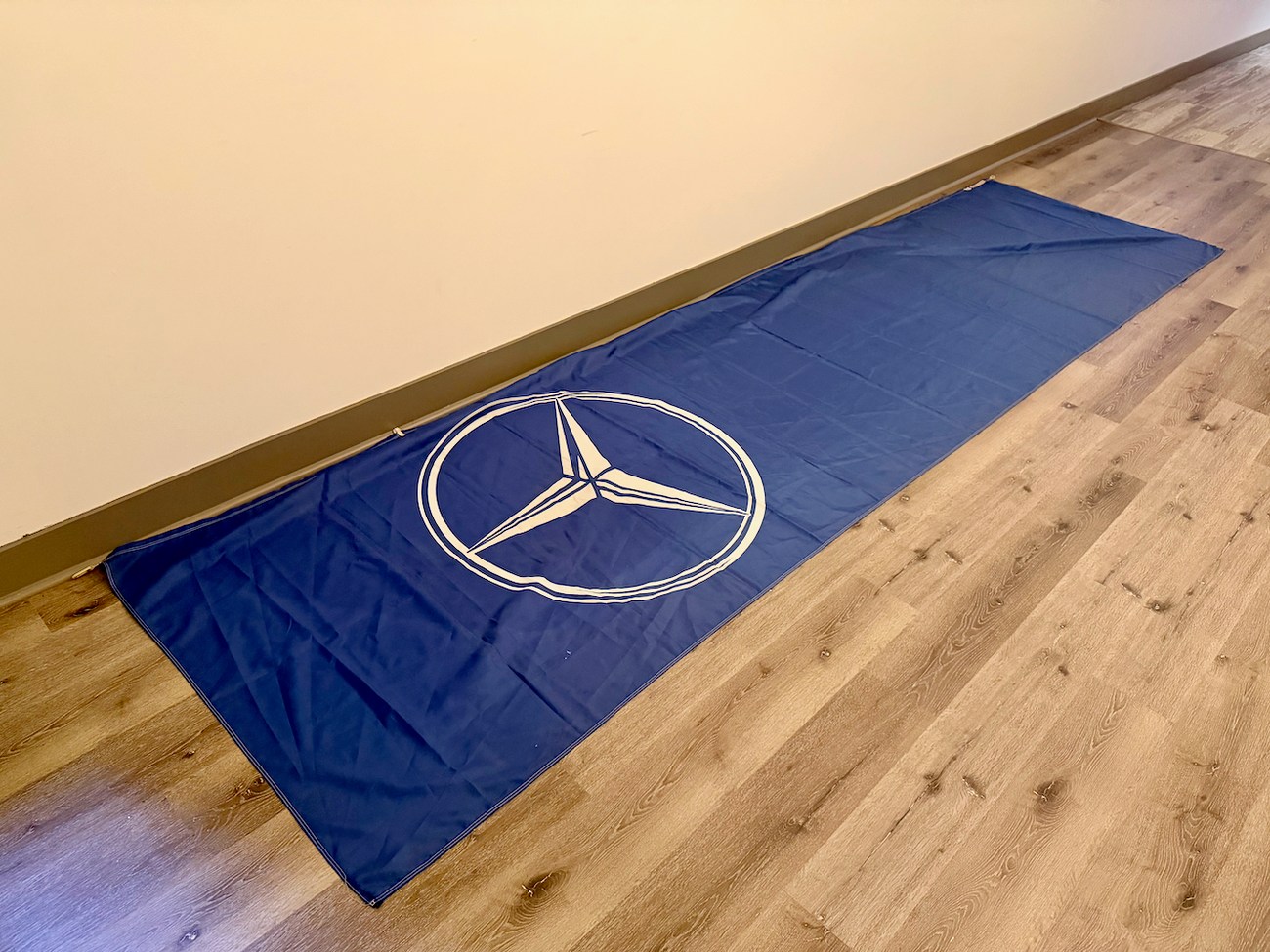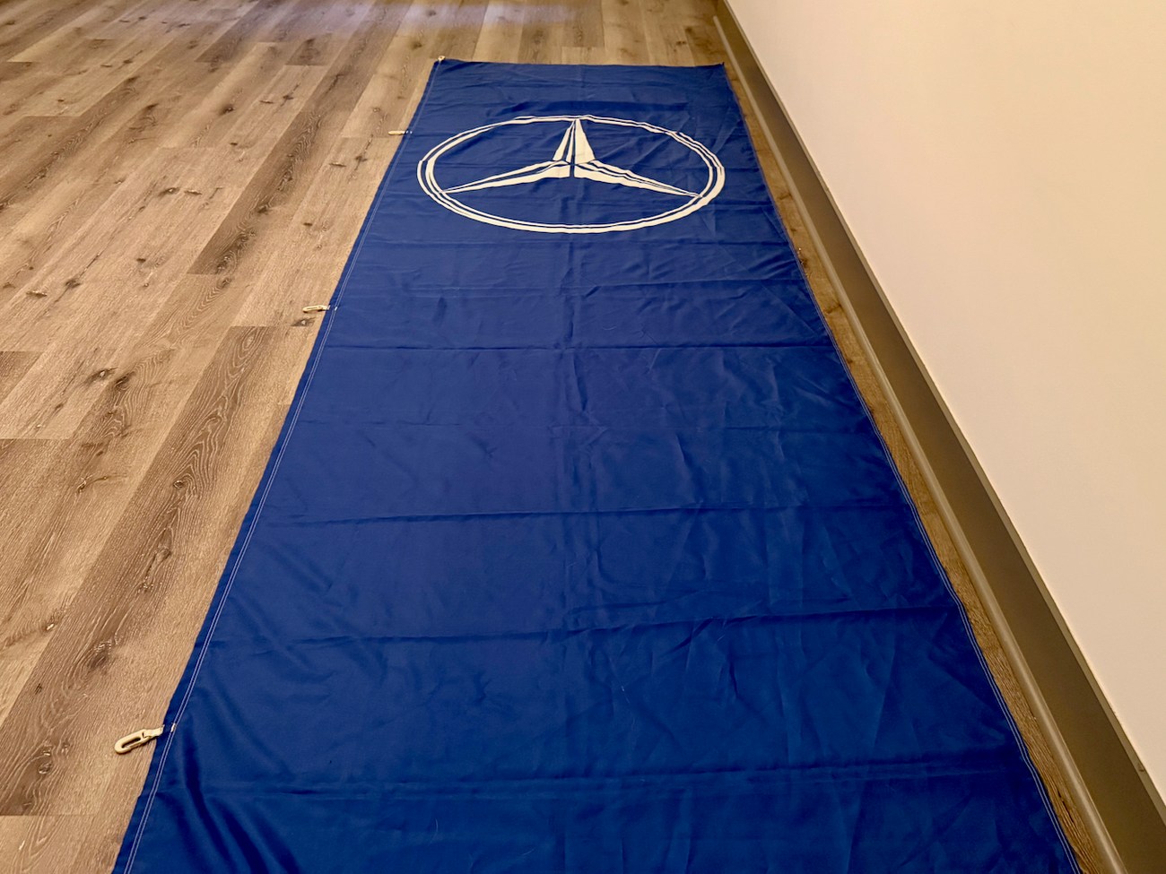 This original Mercedes-Benz dealership banner was saved from a licensed dealer in the Massapequa, New York and measures 14.5' x 3.5' in size. It was reportedly used by the dealership in the 80's to 90's and features the Mercedes-Benz star logo on the upper half with 5 removable clips along one side. The banner is two-sided and shows the same on both sides. This authentic Mercedes-Benz banner is now offered by the seller in Boca Raton, Florida.