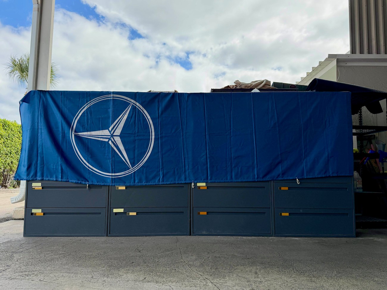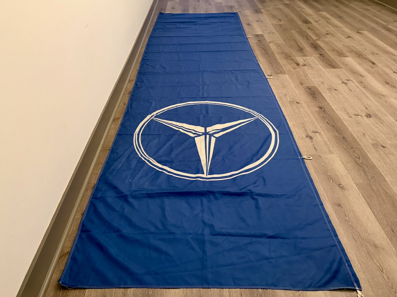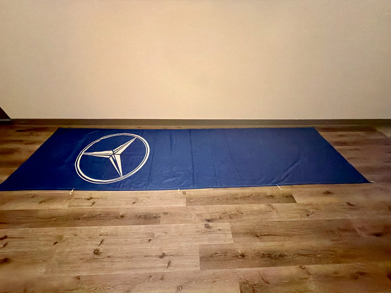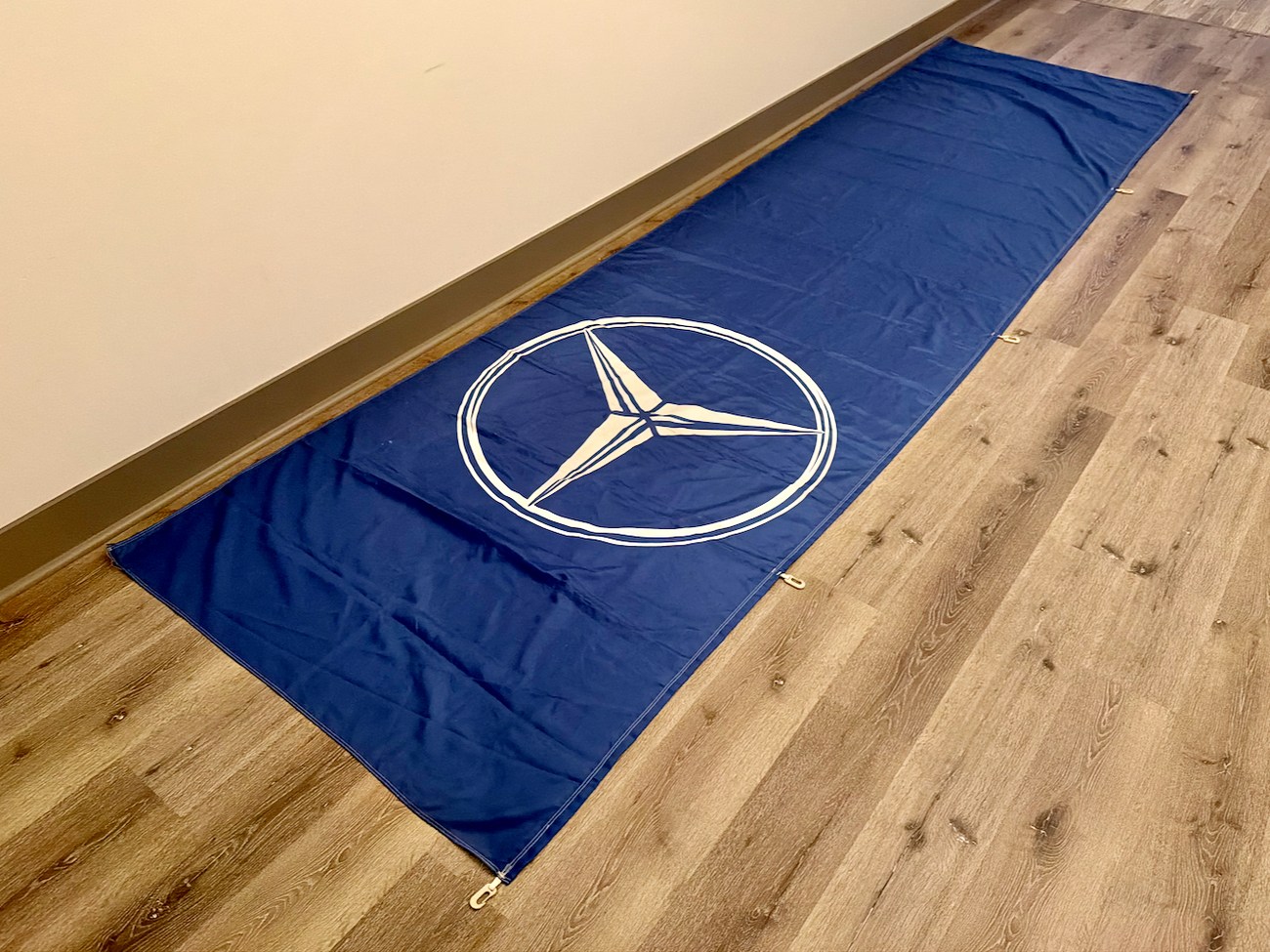 This original Mercedes-Benz dealership banner was saved from a licensed dealer in the Massapequa, New York and measures 14.5' x 3.5' in size. It was reportedly used by the dealership in the 80's to 90's and features the Mercedes-Benz star logo on the upper half with 5 removable clips along one side. The banner is two-sided and shows the same on both sides. This authentic Mercedes-Benz banner is now offered by the seller in Boca Raton, Florida.