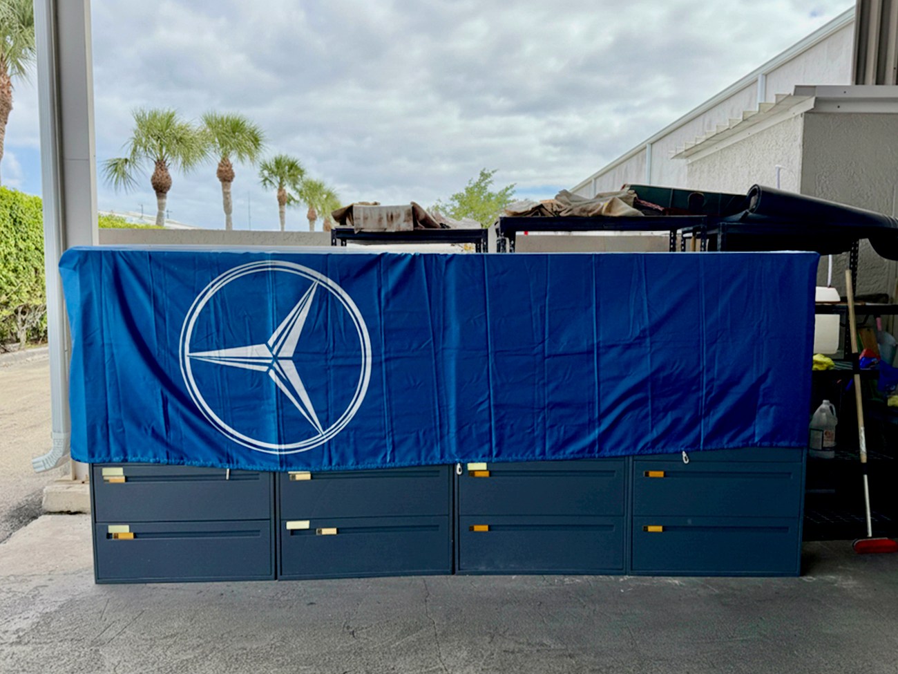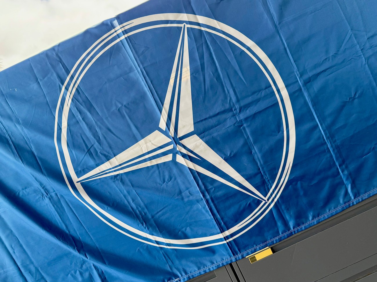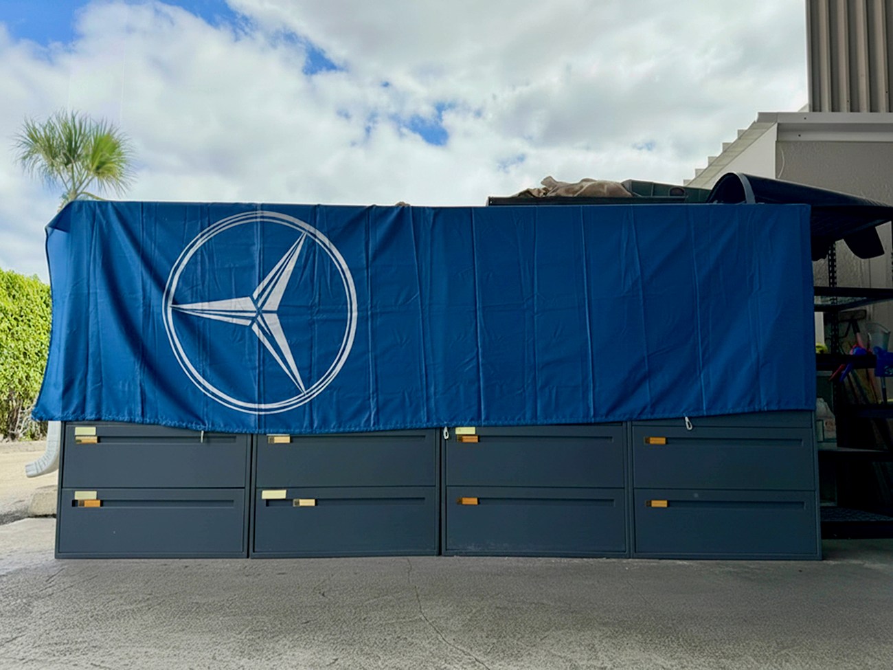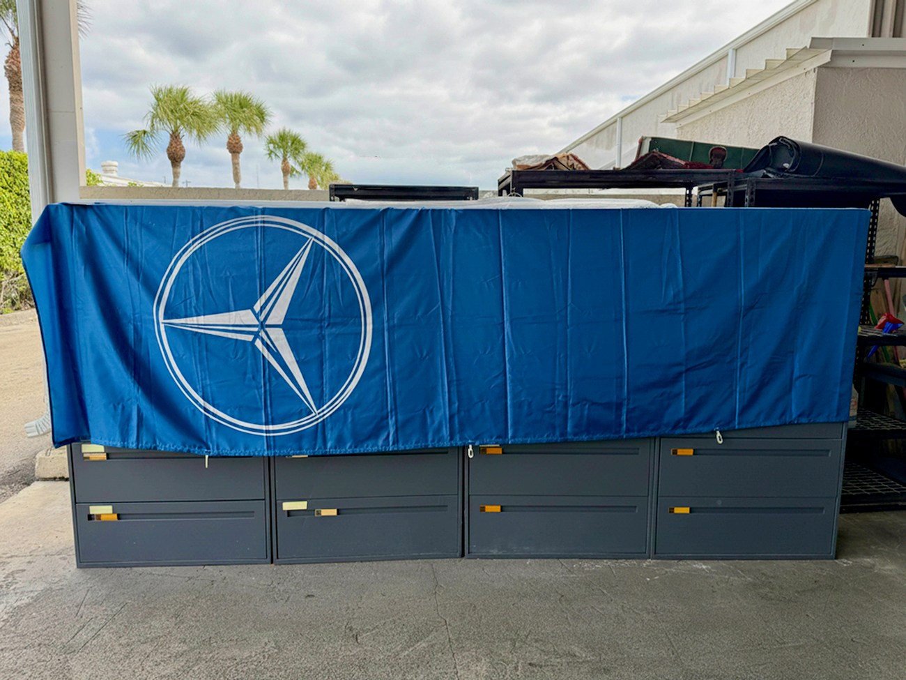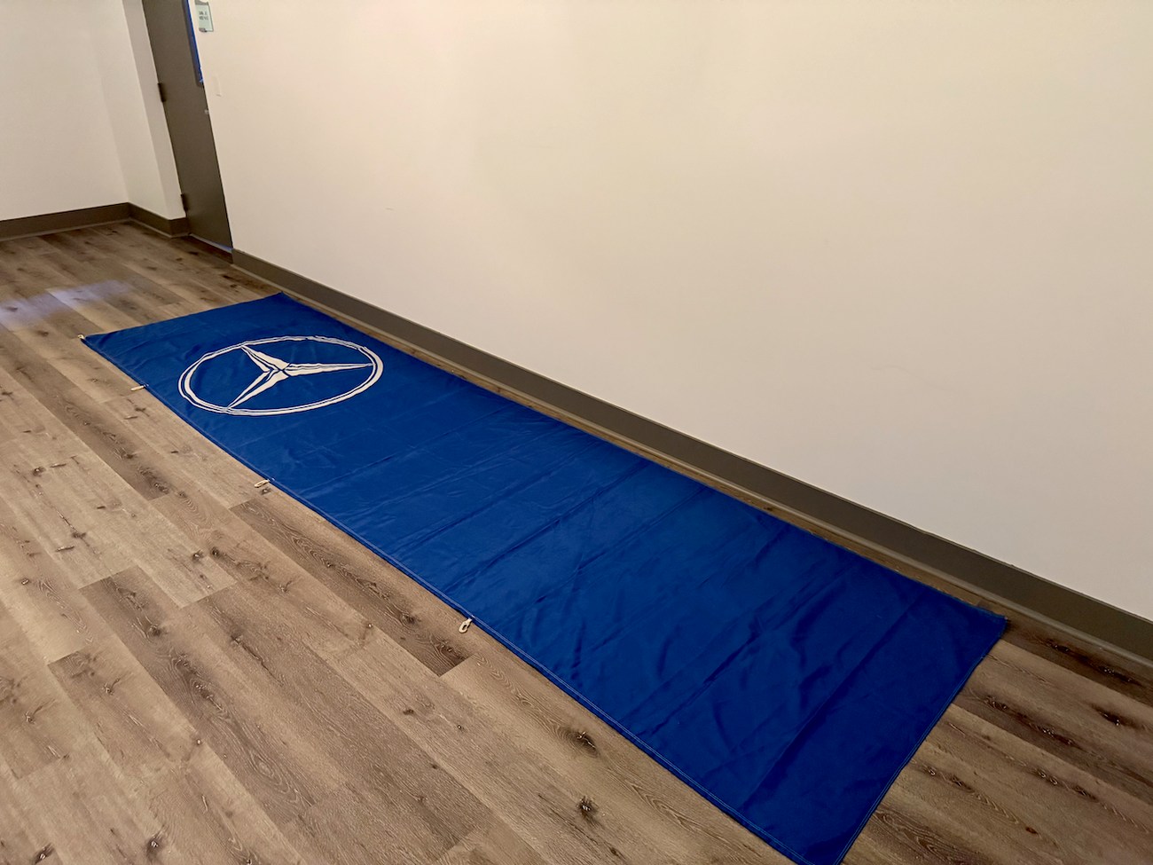 This original Mercedes-Benz dealership banner was saved from a licensed dealer in the Massapequa, New York and measures 14.5' x 3.5' in size. It was reportedly used by the dealership in the 80's to 90's and features the Mercedes-Benz star logo on the upper half with 5 removable clips along one side. The banner is two-sided and shows the same on both sides. This authentic Mercedes-Benz banner is now offered by the seller in Boca Raton, Florida.