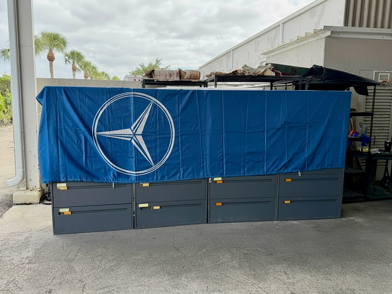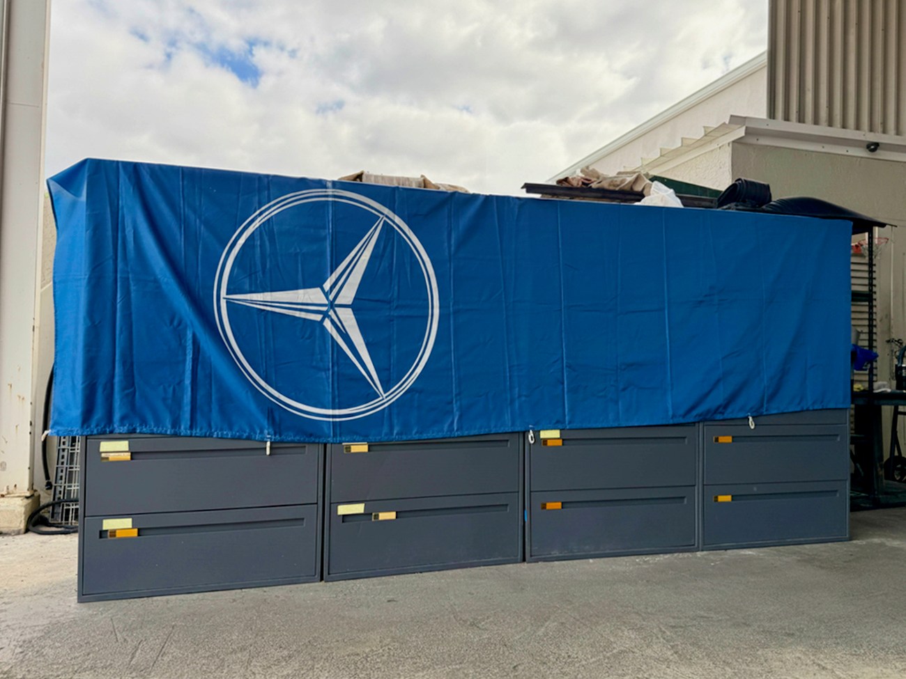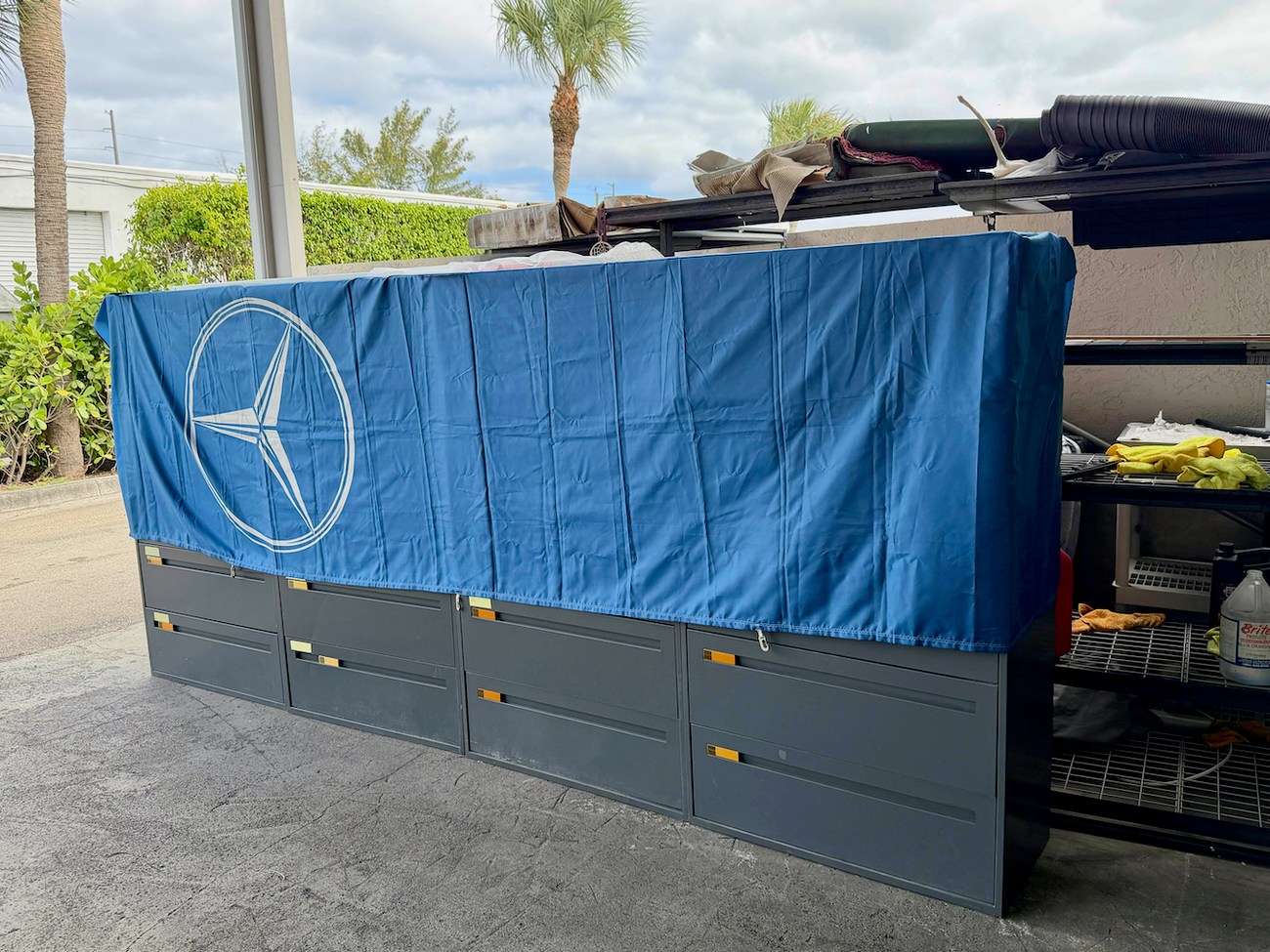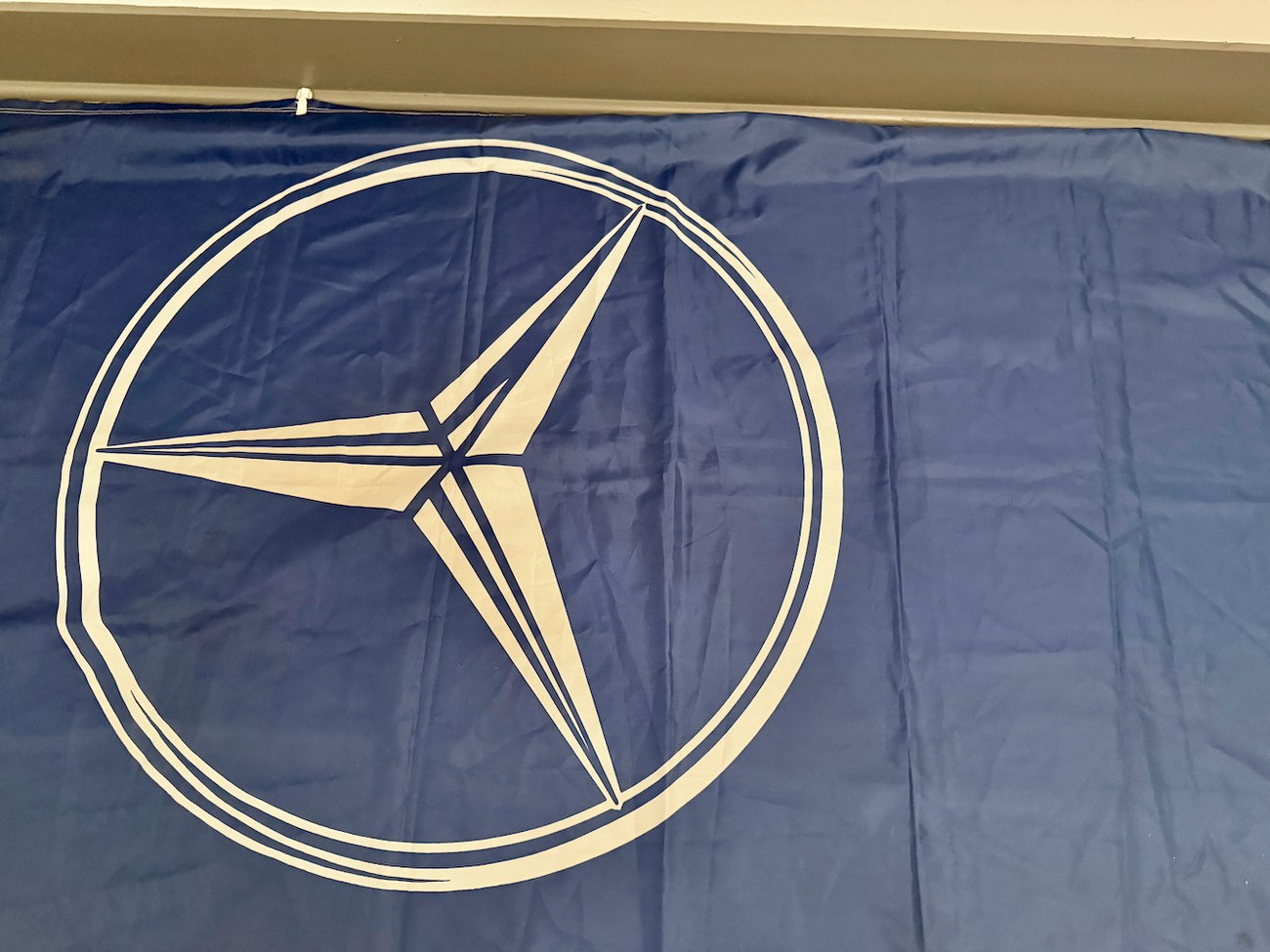 This original Mercedes-Benz dealership banner was saved from a licensed dealer in the Massapequa, New York and measures 14.5' x 3.5' in size. It was reportedly used by the dealership in the 80's to 90's and features the Mercedes-Benz star logo on the upper half with 5 removable clips along one side. The banner is two-sided and shows the same on both sides. This authentic Mercedes-Benz banner is now offered by the seller in Boca Raton, Florida.