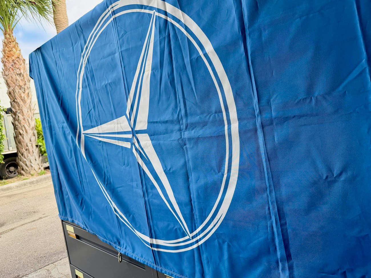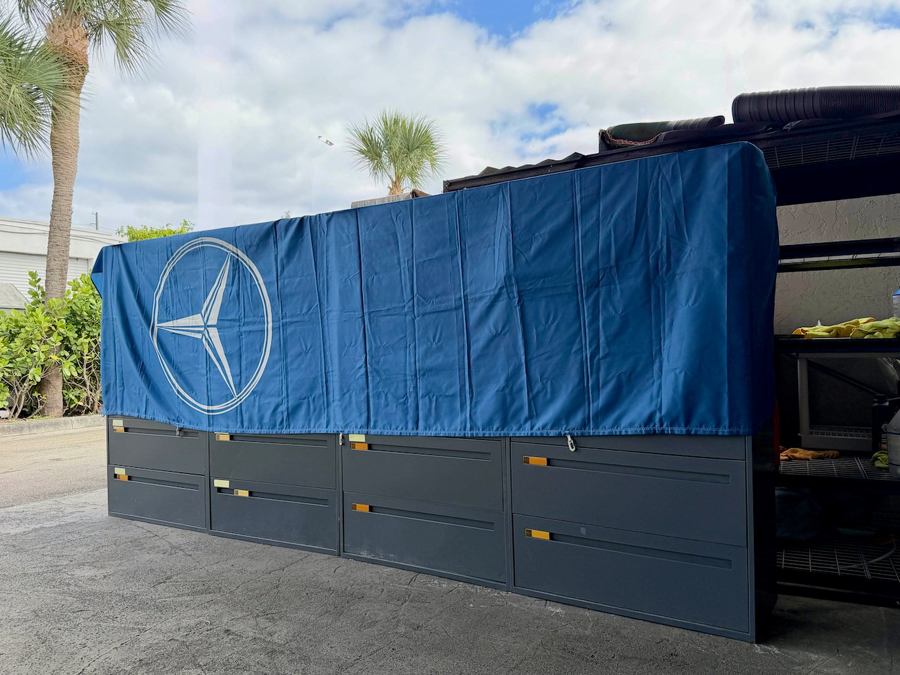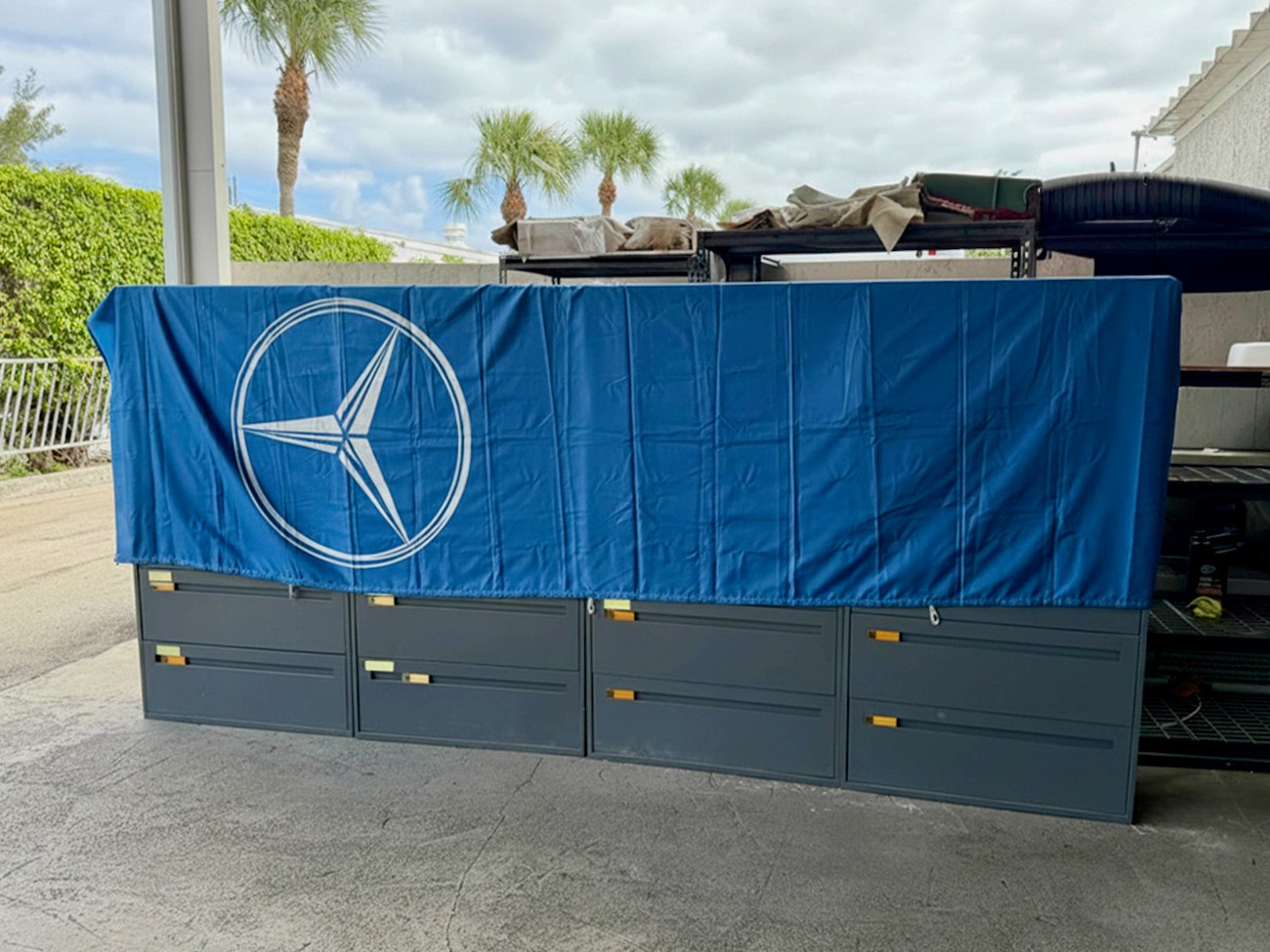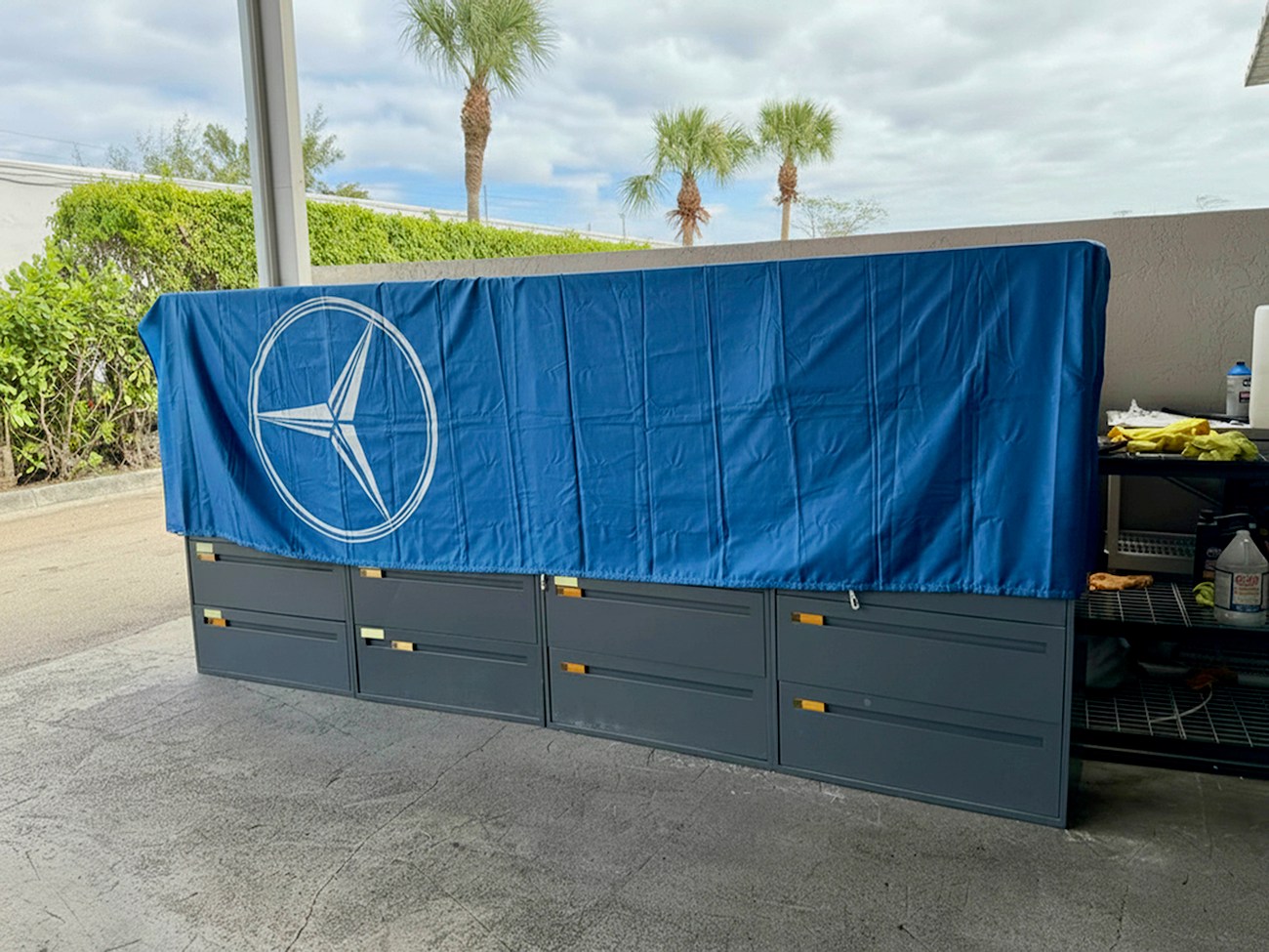 This original Mercedes-Benz dealership banner was saved from a licensed dealer in the Massapequa, New York and measures 14.5' x 3.5' in size. It was reportedly used by the dealership in the 80's to 90's and features the Mercedes-Benz star logo on the upper half with 5 removable clips along one side. The banner is two-sided and shows the same on both sides. This authentic Mercedes-Benz banner is now offered by the seller in Boca Raton, Florida.