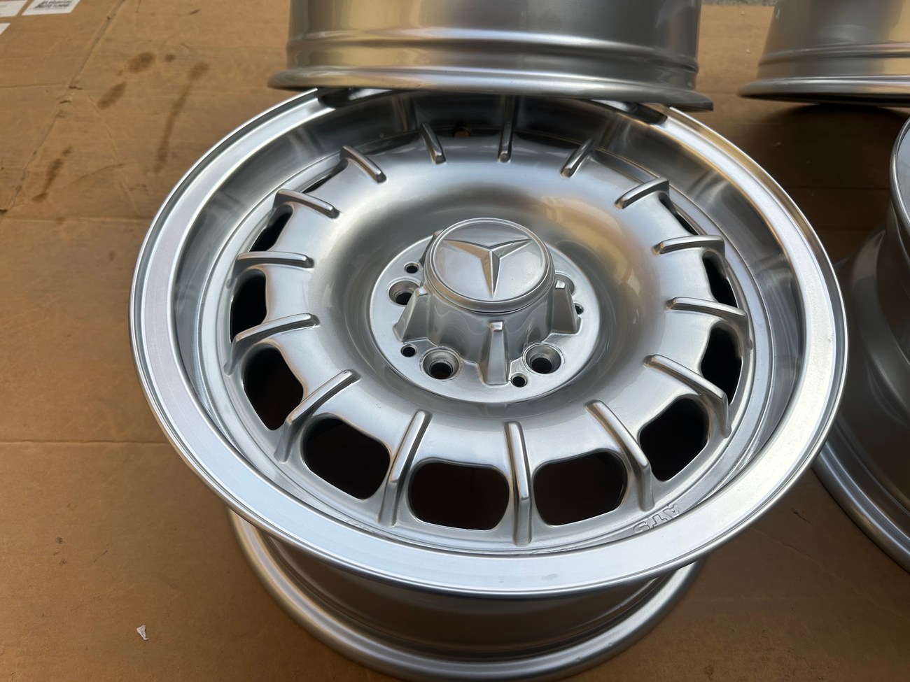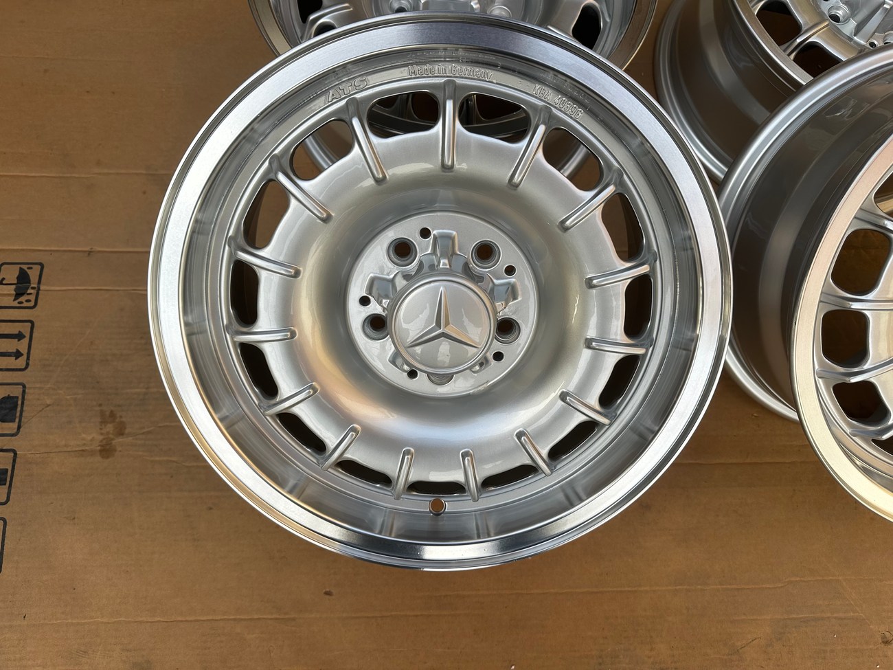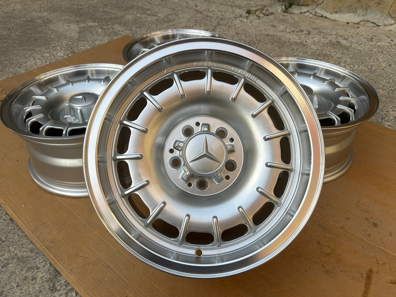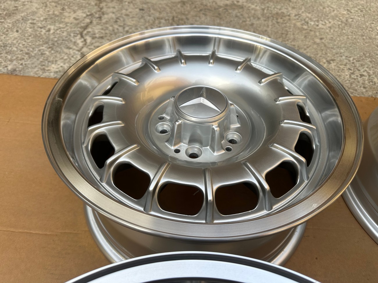 These 15" Mercedes-Benz Bundt wheels measure 7″ wide on all four corners, and were manufactured by ATS in Germany for Mercedes-Benz. The faces are finished in silver with a polished lip and OEM center caps are included. Dimensions, offsets, and other manufacturer casting marks are present on each wheel showing original part number KBA40396. The Bundt wheels can fit a wide variety of Mercedes-Benz models including W116, W123, and W126 chassis cars. Each wheel has been professionally refinished in preparation for the sale and these authentic Bundt wheels are now offered by the seller in Beirut, Lebanon with worldwide shipping options available.