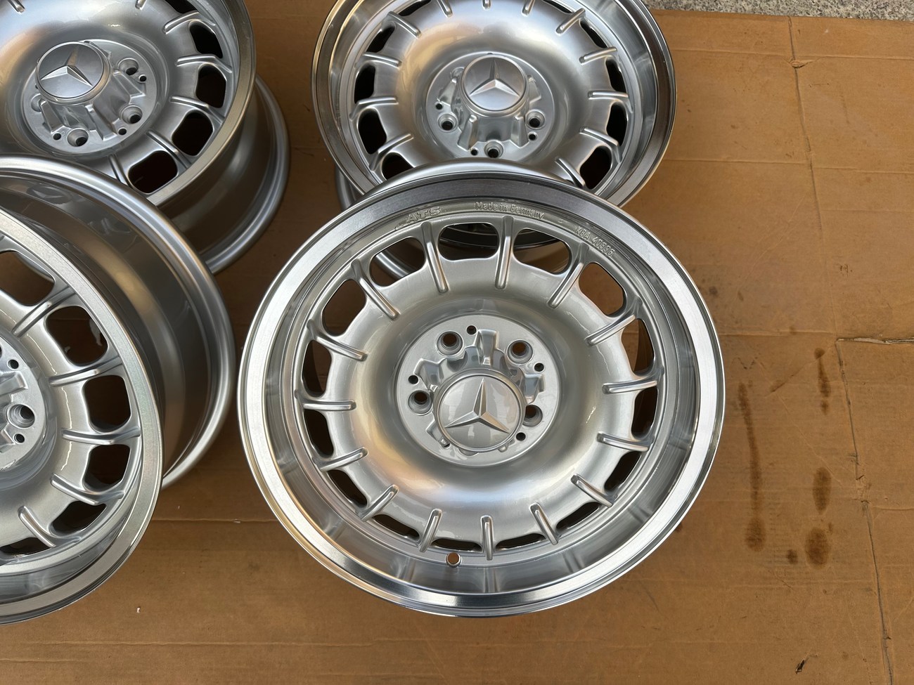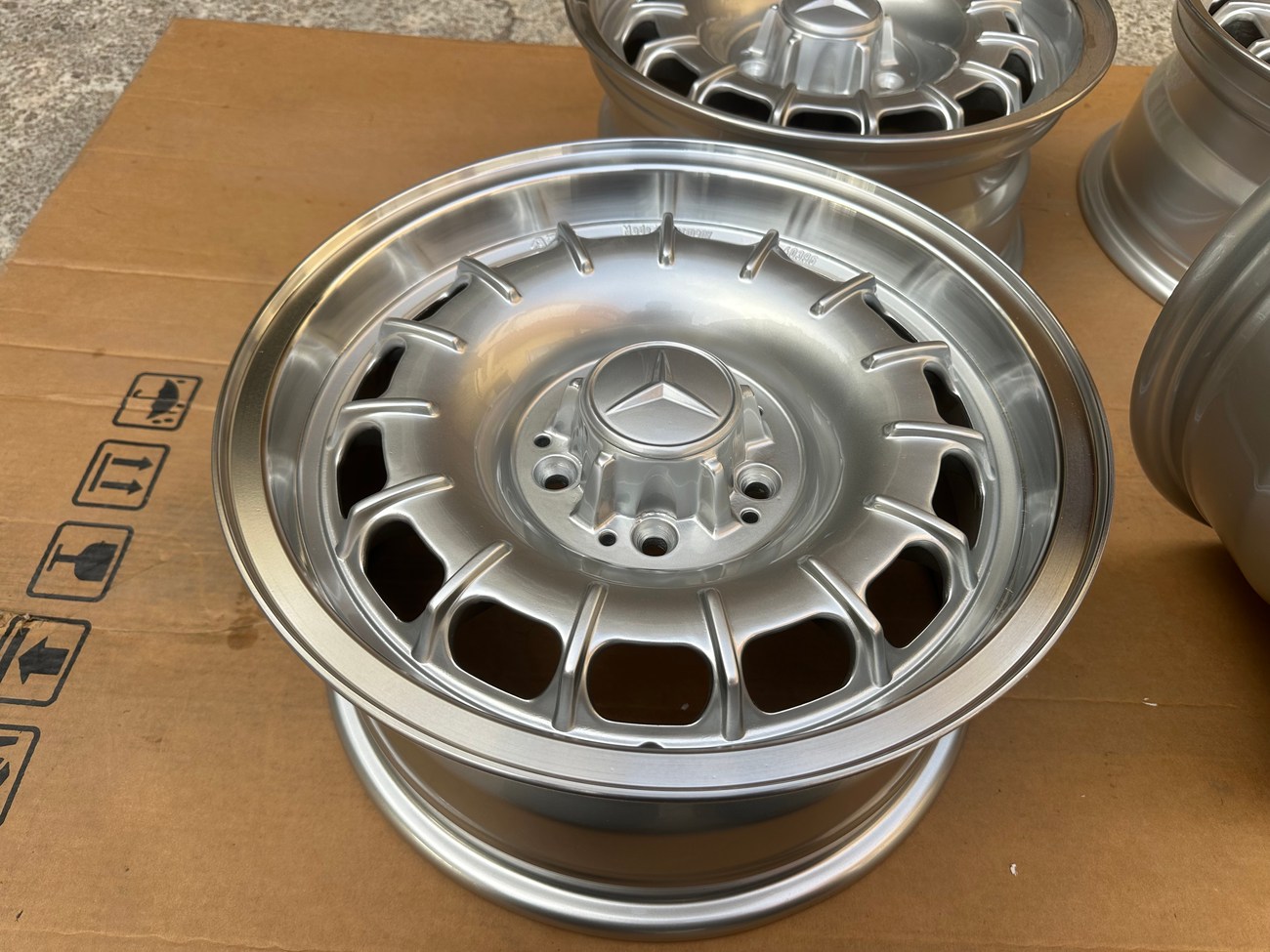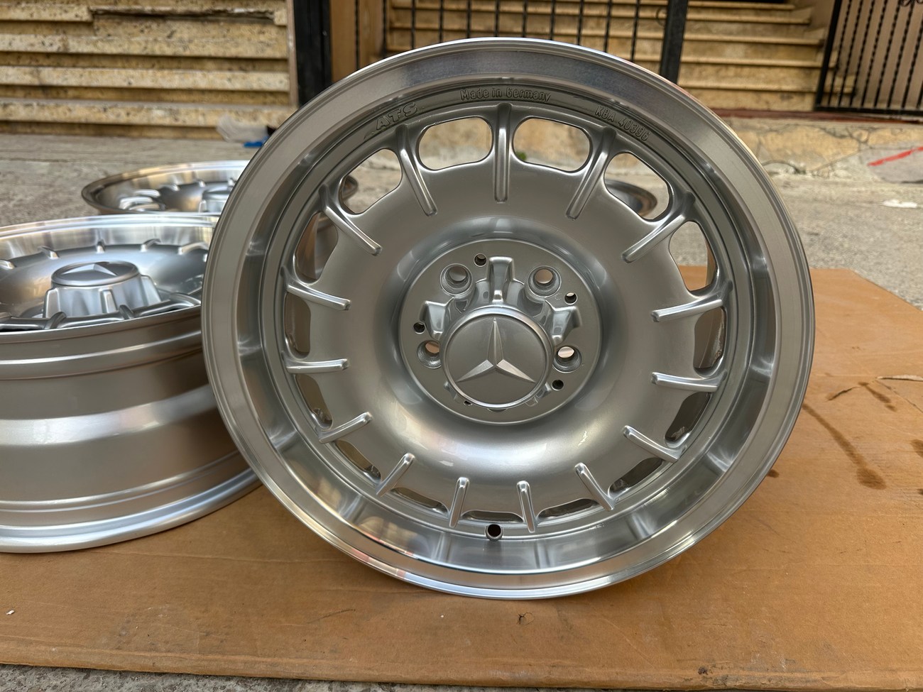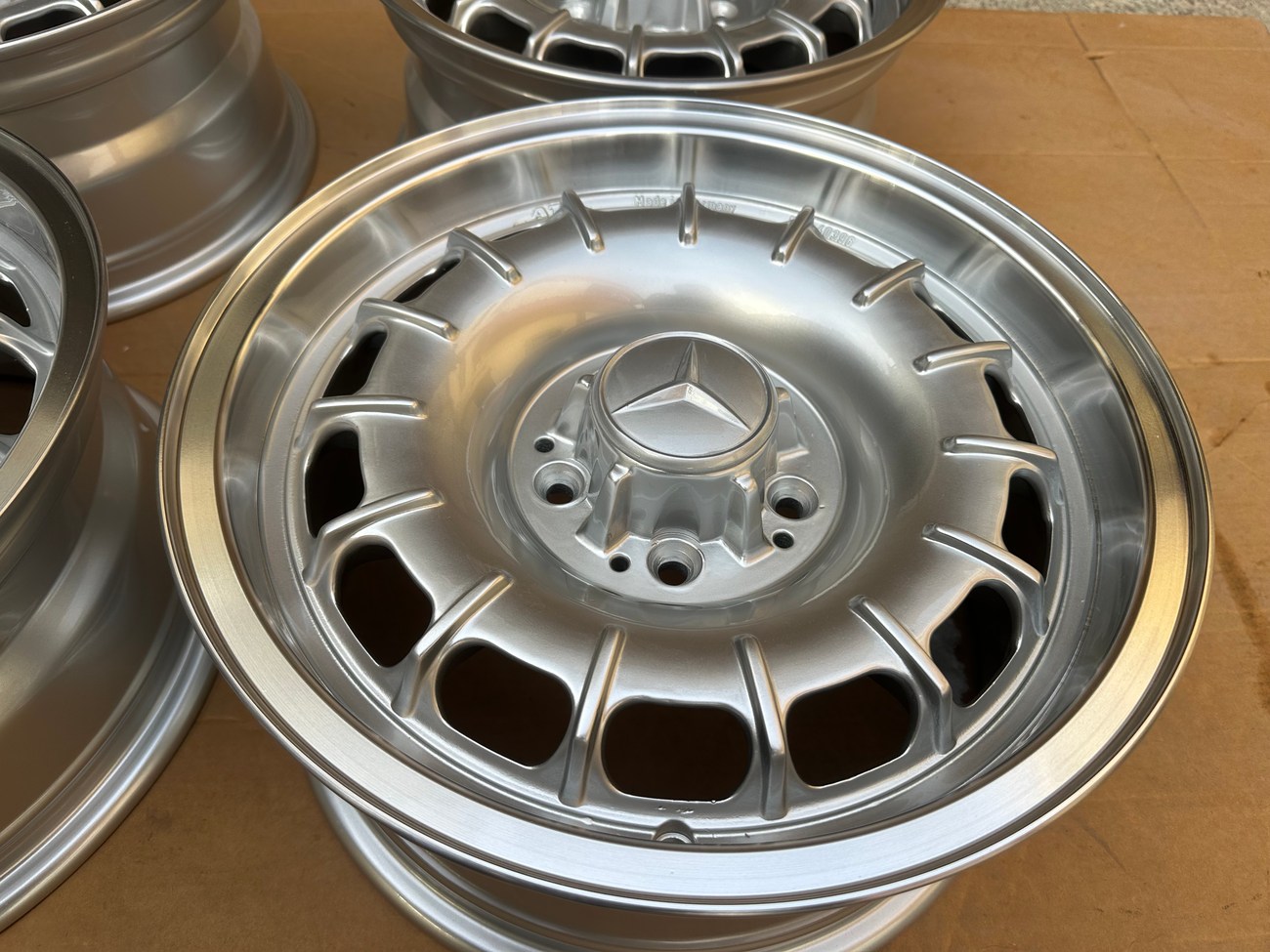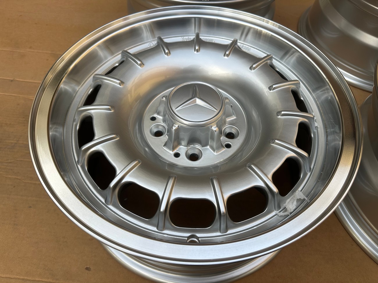 These 15" Mercedes-Benz Bundt wheels measure 7″ wide on all four corners, and were manufactured by ATS in Germany for Mercedes-Benz. The faces are finished in silver with a polished lip and OEM center caps are included. Dimensions, offsets, and other manufacturer casting marks are present on each wheel showing original part number KBA40396. The Bundt wheels can fit a wide variety of Mercedes-Benz models including W116, W123, and W126 chassis cars. Each wheel has been professionally refinished in preparation for the sale and these authentic Bundt wheels are now offered by the seller in Beirut, Lebanon with worldwide shipping options available.