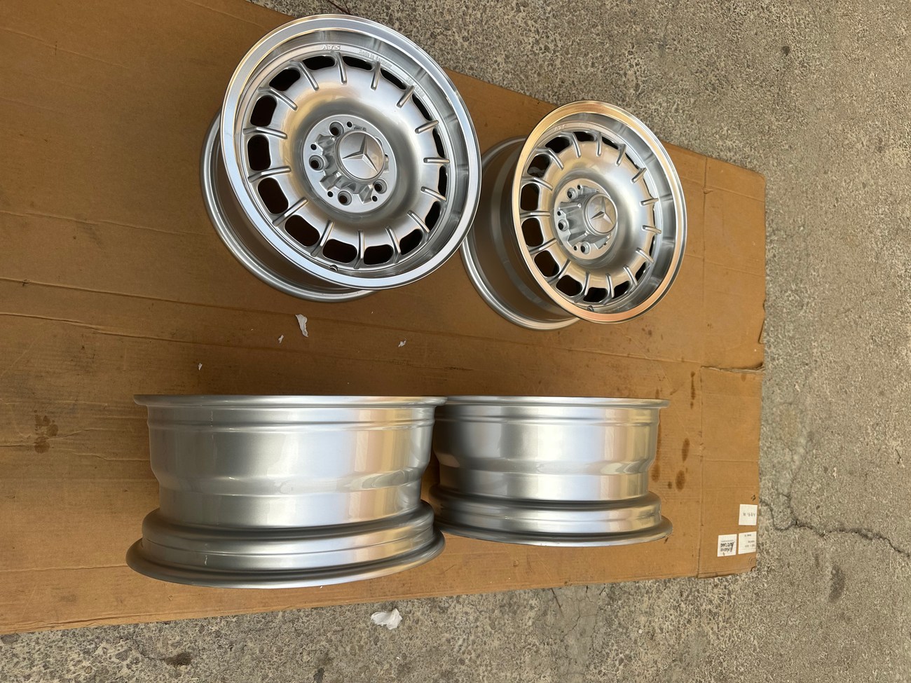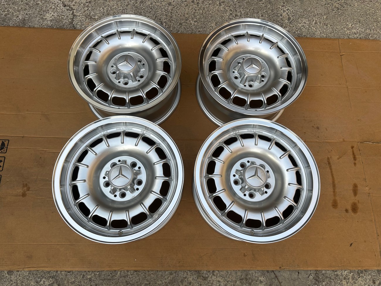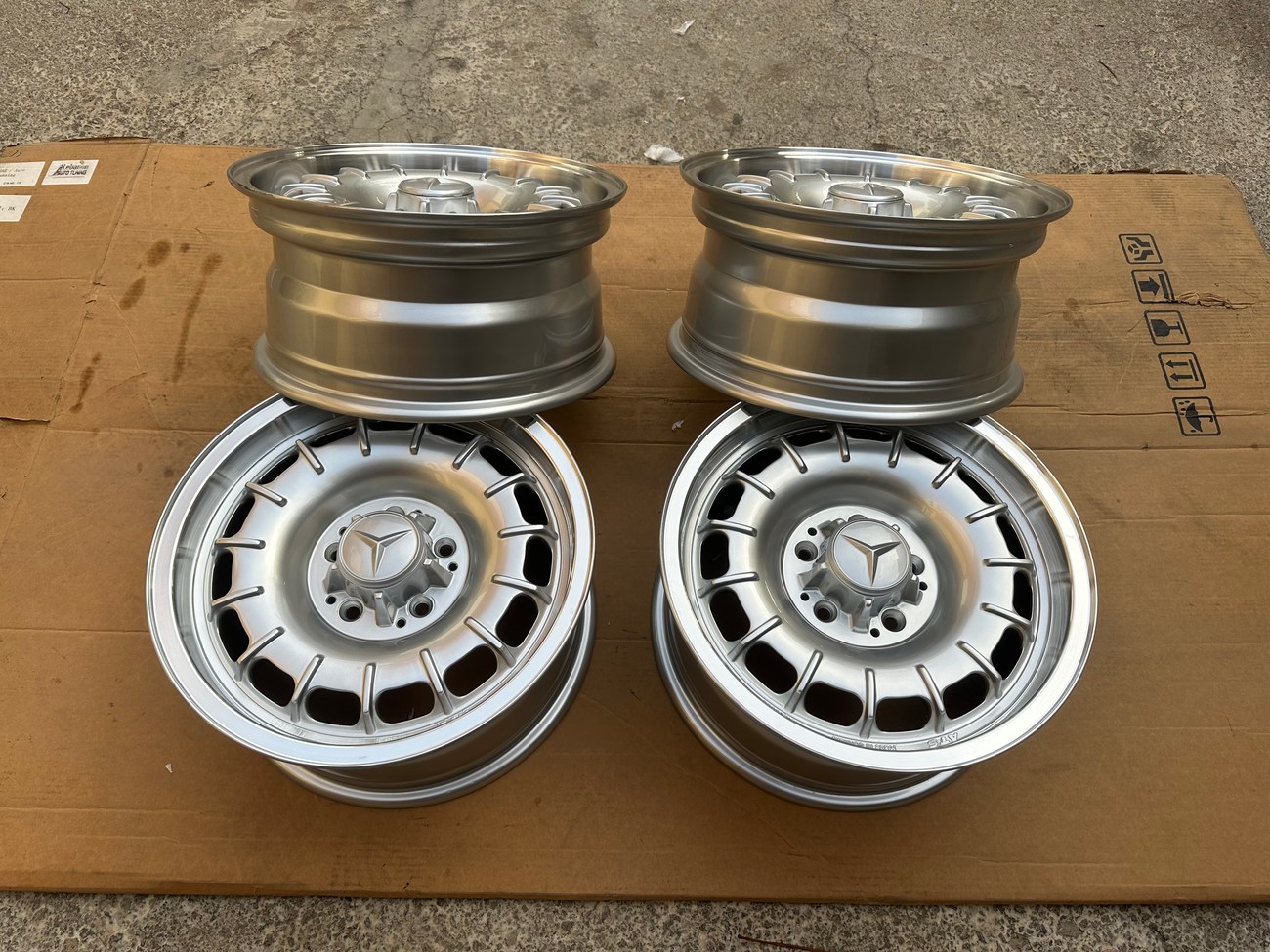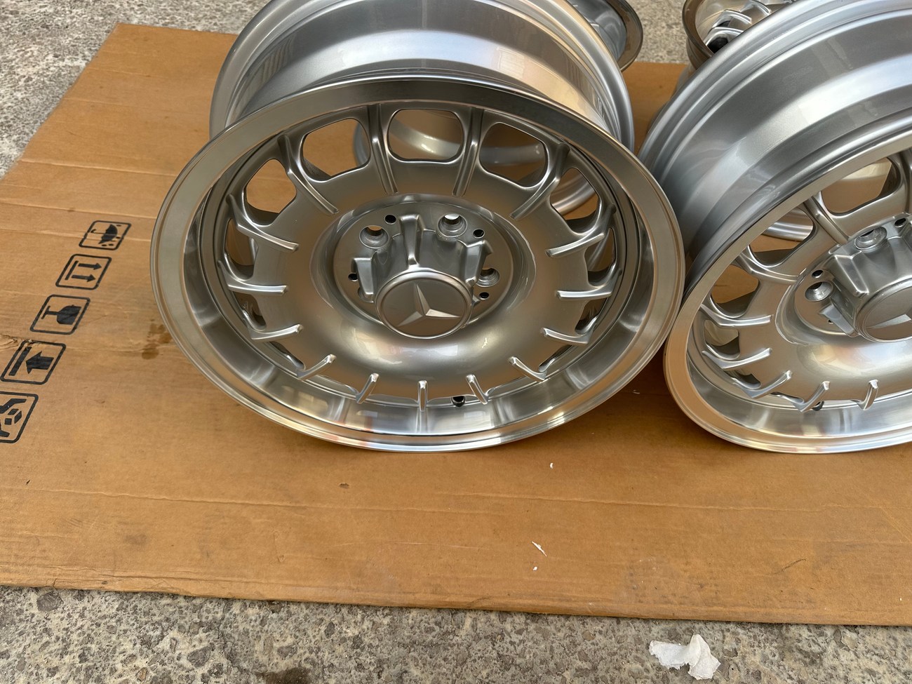 These 15" Mercedes-Benz Bundt wheels measure 7″ wide on all four corners, and were manufactured by ATS in Germany for Mercedes-Benz. The faces are finished in silver with a polished lip and OEM center caps are included. Dimensions, offsets, and other manufacturer casting marks are present on each wheel showing original part number KBA40396. The Bundt wheels can fit a wide variety of Mercedes-Benz models including W116, W123, and W126 chassis cars. Each wheel has been professionally refinished in preparation for the sale and these authentic Bundt wheels are now offered by the seller in Beirut, Lebanon with worldwide shipping options available.