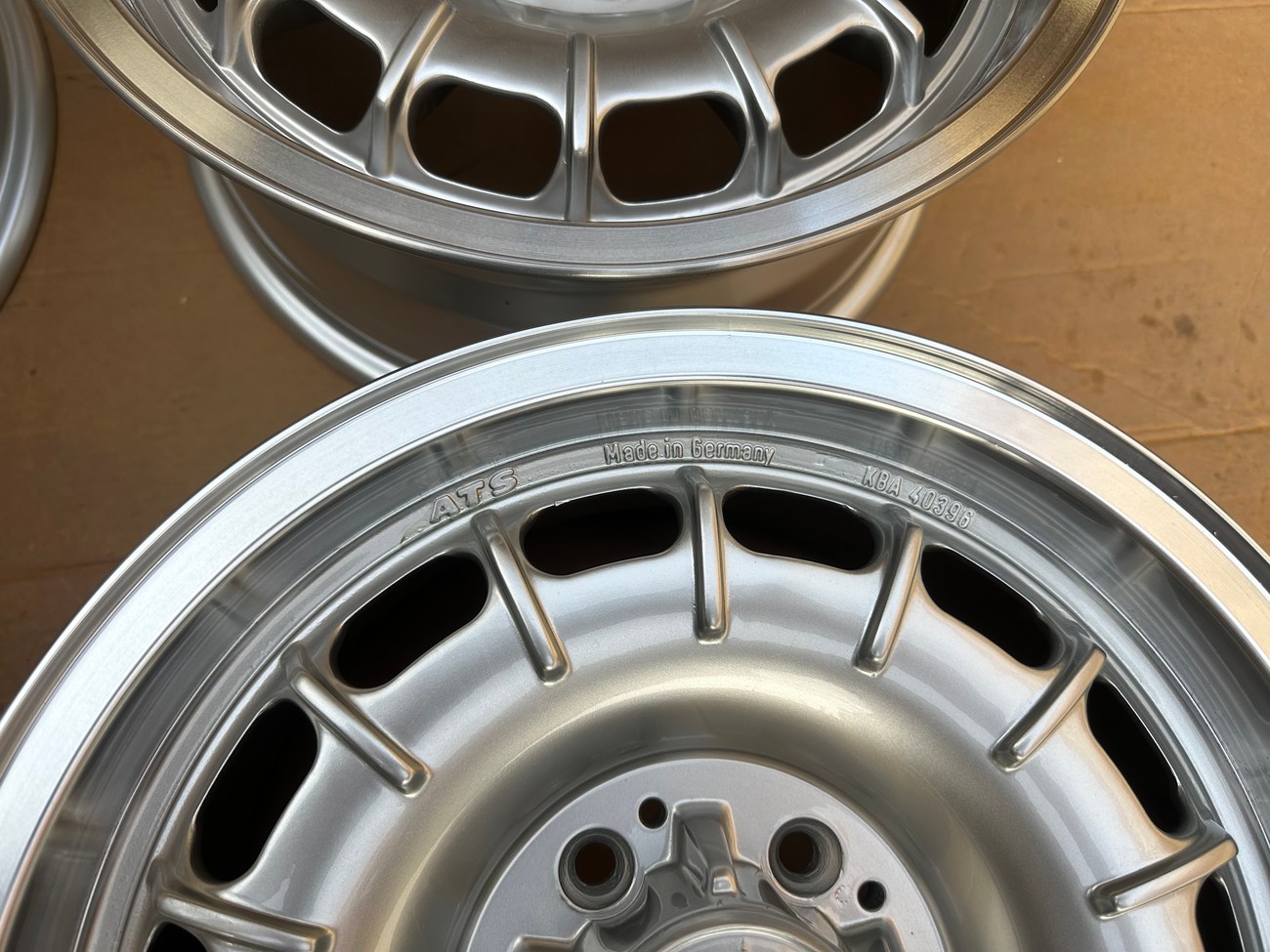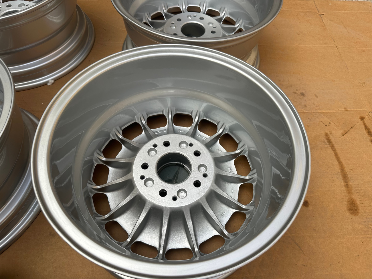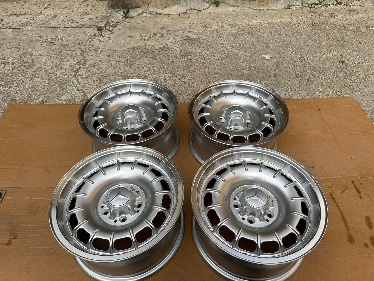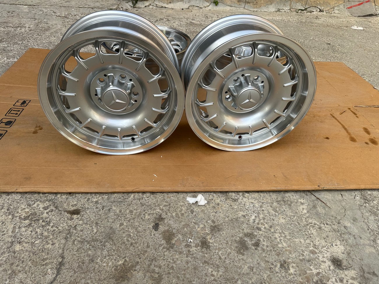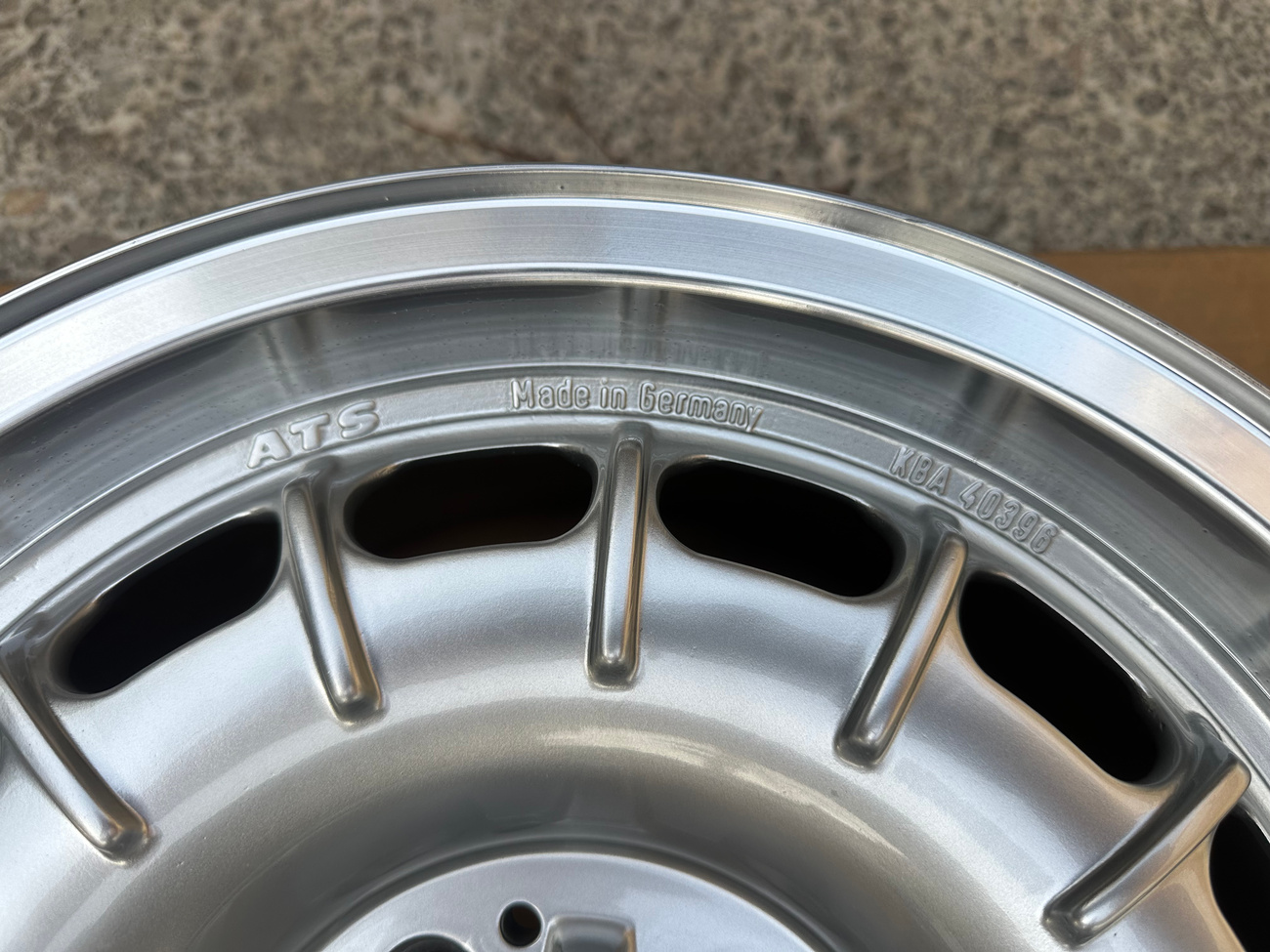 These 15" Mercedes-Benz Bundt wheels measure 7″ wide on all four corners, and were manufactured by ATS in Germany for Mercedes-Benz. The faces are finished in silver with a polished lip and OEM center caps are included. Dimensions, offsets, and other manufacturer casting marks are present on each wheel showing original part number KBA40396. The Bundt wheels can fit a wide variety of Mercedes-Benz models including W116, W123, and W126 chassis cars. Each wheel has been professionally refinished in preparation for the sale and these authentic Bundt wheels are now offered by the seller in Beirut, Lebanon with worldwide shipping options available.