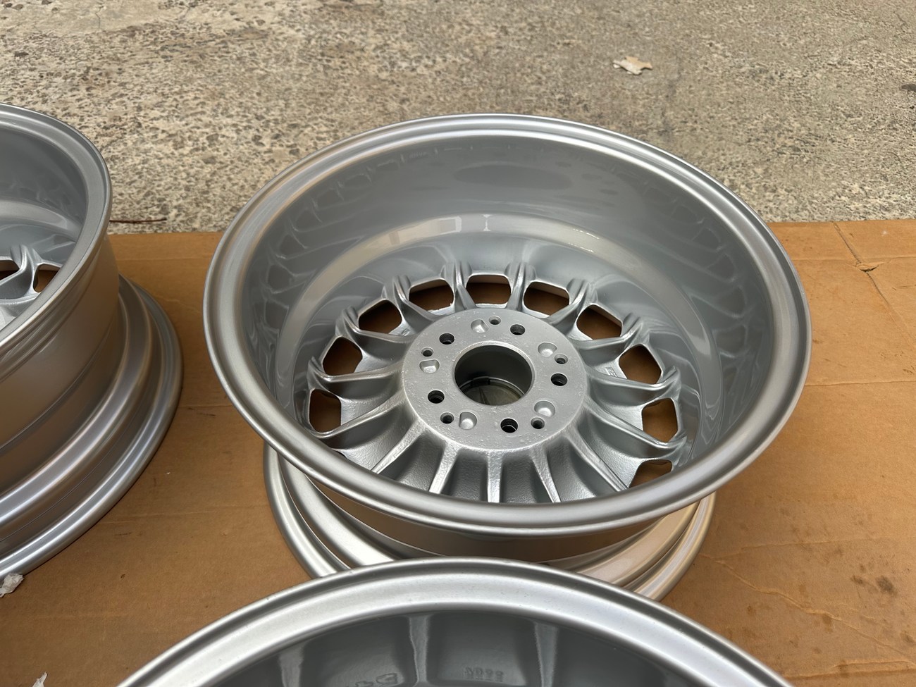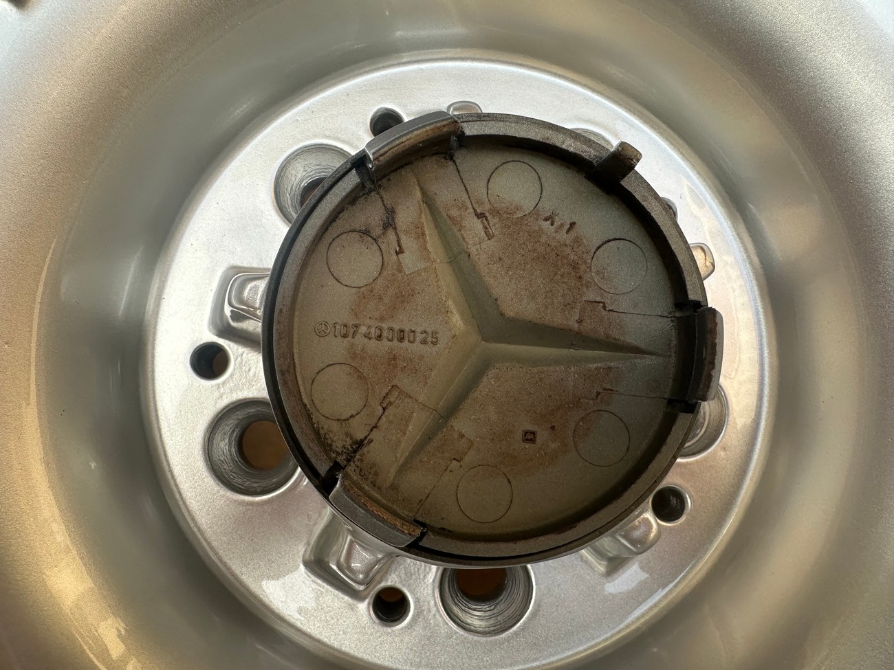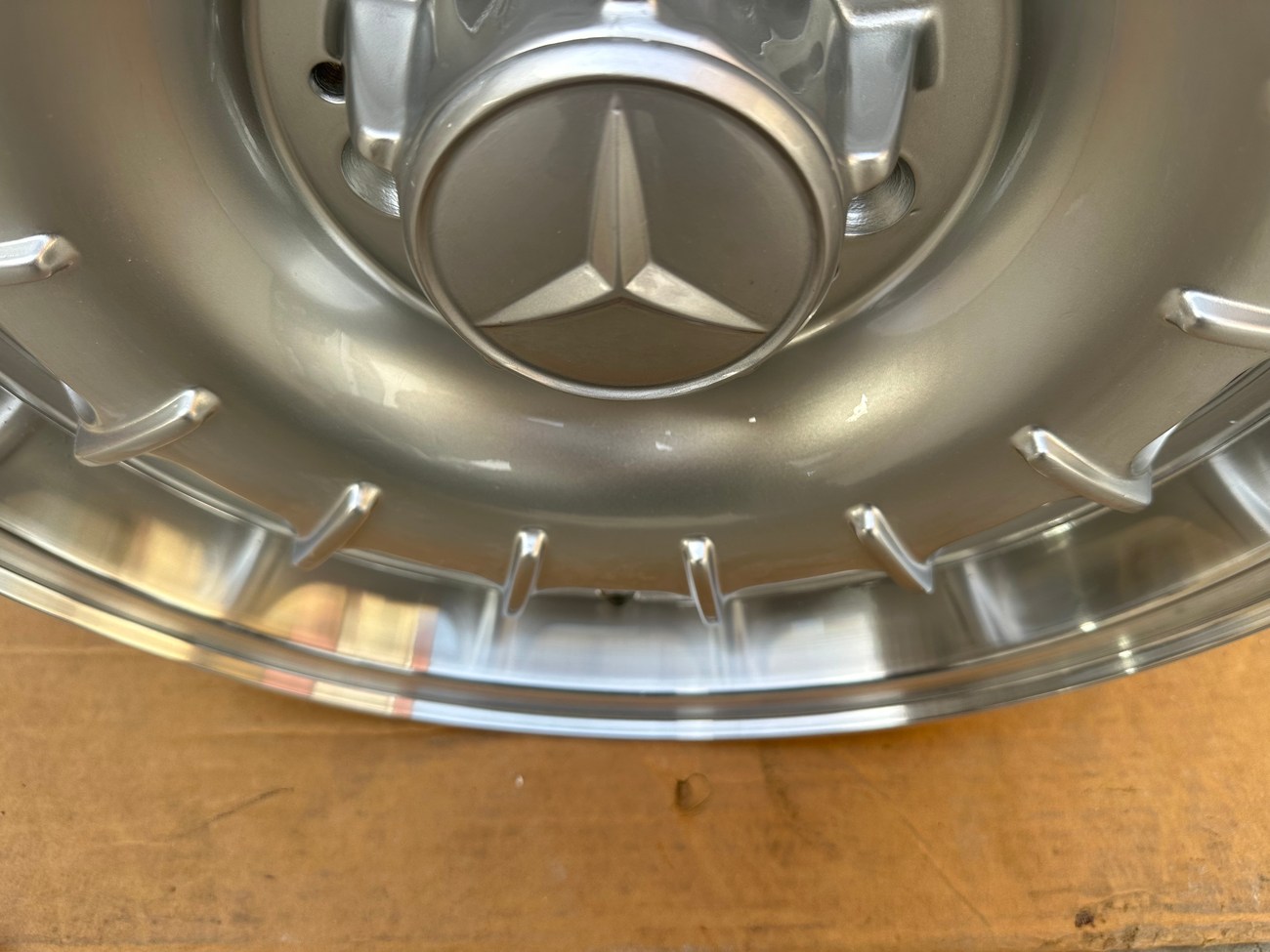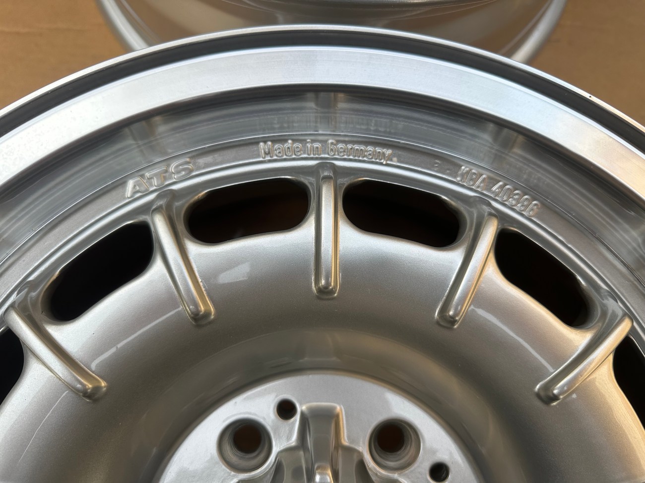 These 15" Mercedes-Benz Bundt wheels measure 7″ wide on all four corners, and were manufactured by ATS in Germany for Mercedes-Benz. The faces are finished in silver with a polished lip and OEM center caps are included. Dimensions, offsets, and other manufacturer casting marks are present on each wheel showing original part number KBA40396. The Bundt wheels can fit a wide variety of Mercedes-Benz models including W116, W123, and W126 chassis cars. Each wheel has been professionally refinished in preparation for the sale and these authentic Bundt wheels are now offered by the seller in Beirut, Lebanon with worldwide shipping options available.