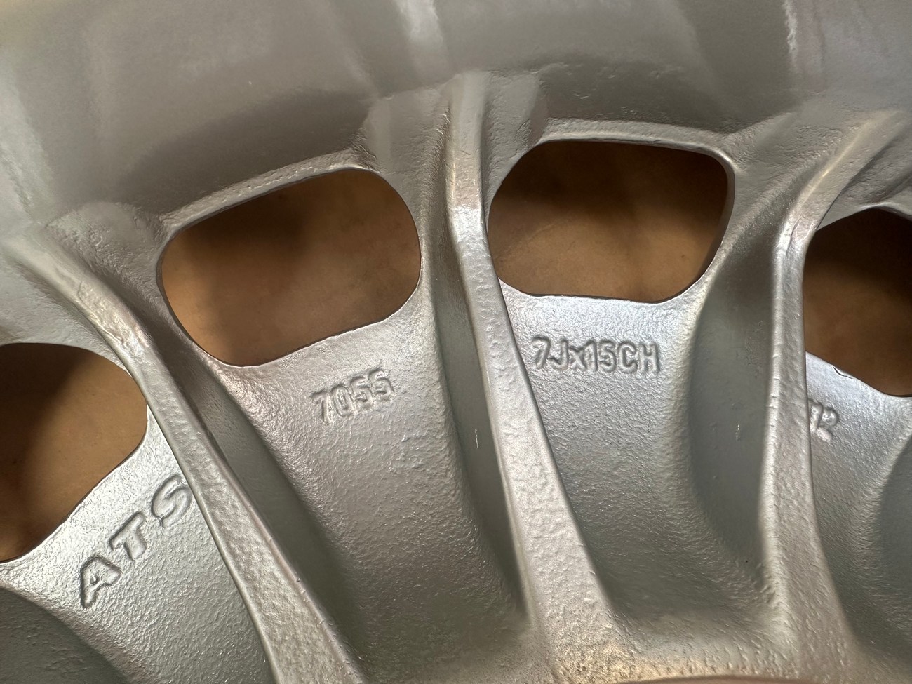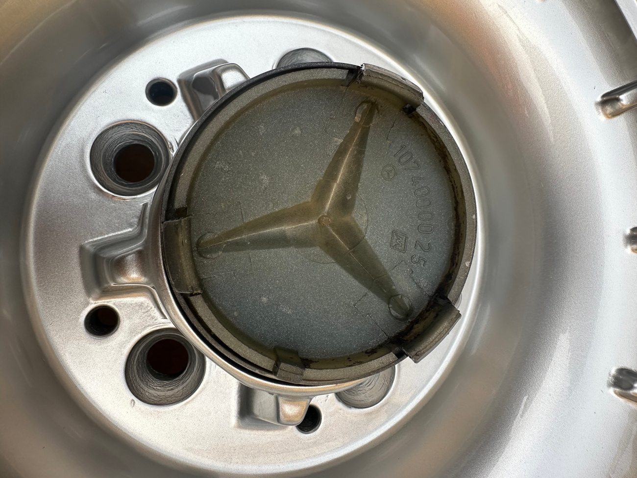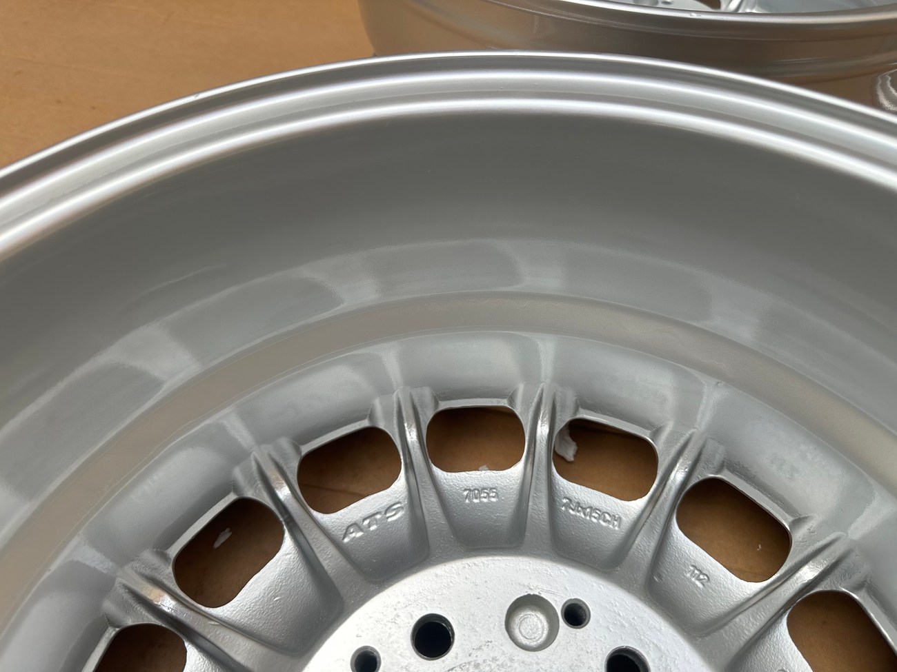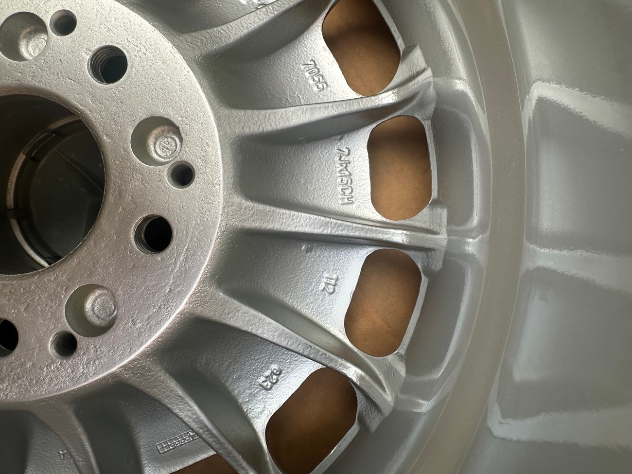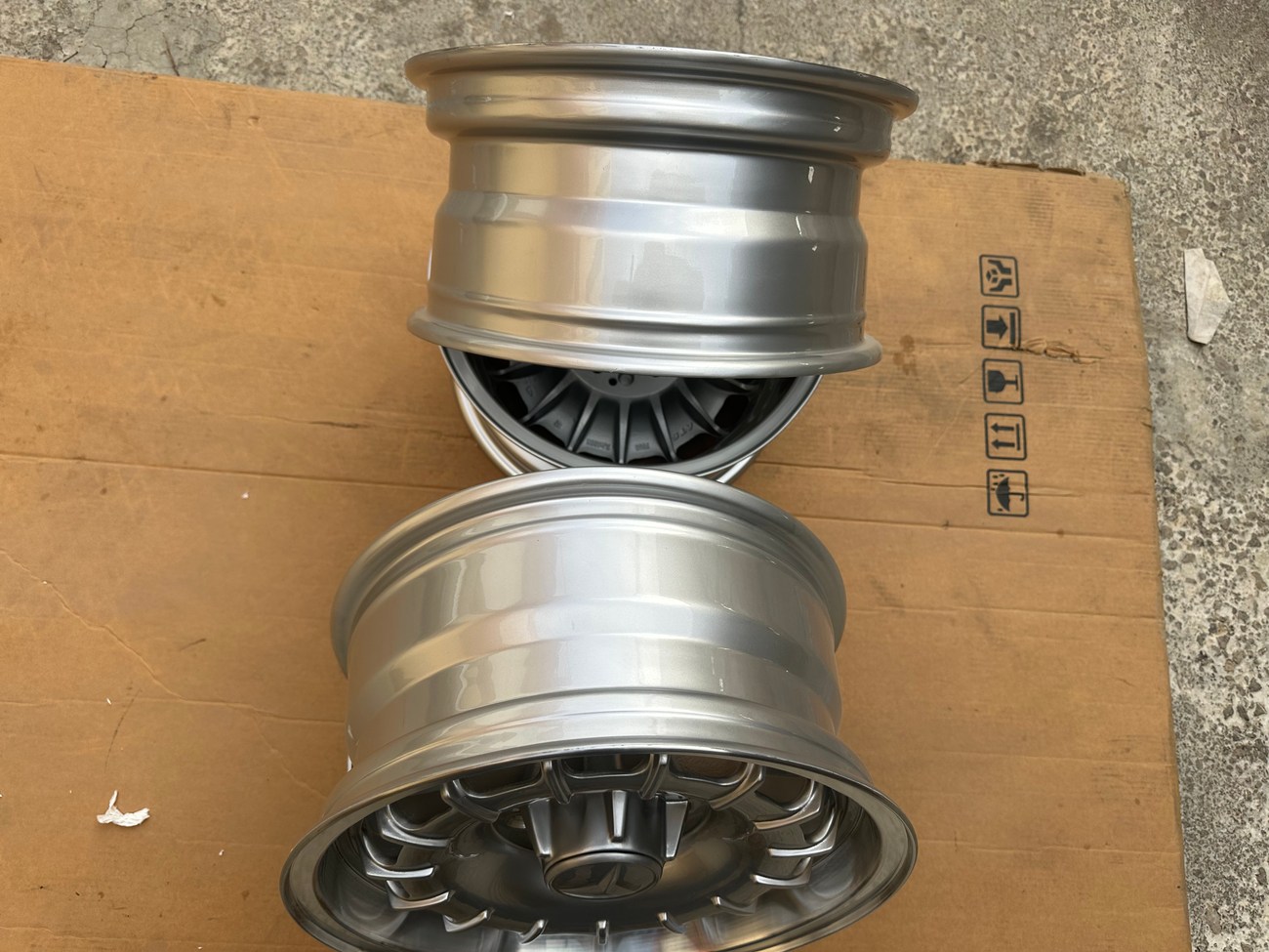 These 15" Mercedes-Benz Bundt wheels measure 7″ wide on all four corners, and were manufactured by ATS in Germany for Mercedes-Benz. The faces are finished in silver with a polished lip and OEM center caps are included. Dimensions, offsets, and other manufacturer casting marks are present on each wheel showing original part number KBA40396. The Bundt wheels can fit a wide variety of Mercedes-Benz models including W116, W123, and W126 chassis cars. Each wheel has been professionally refinished in preparation for the sale and these authentic Bundt wheels are now offered by the seller in Beirut, Lebanon with worldwide shipping options available.