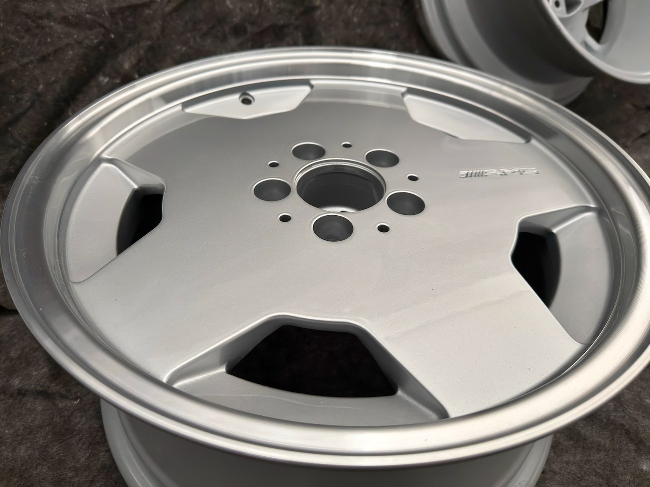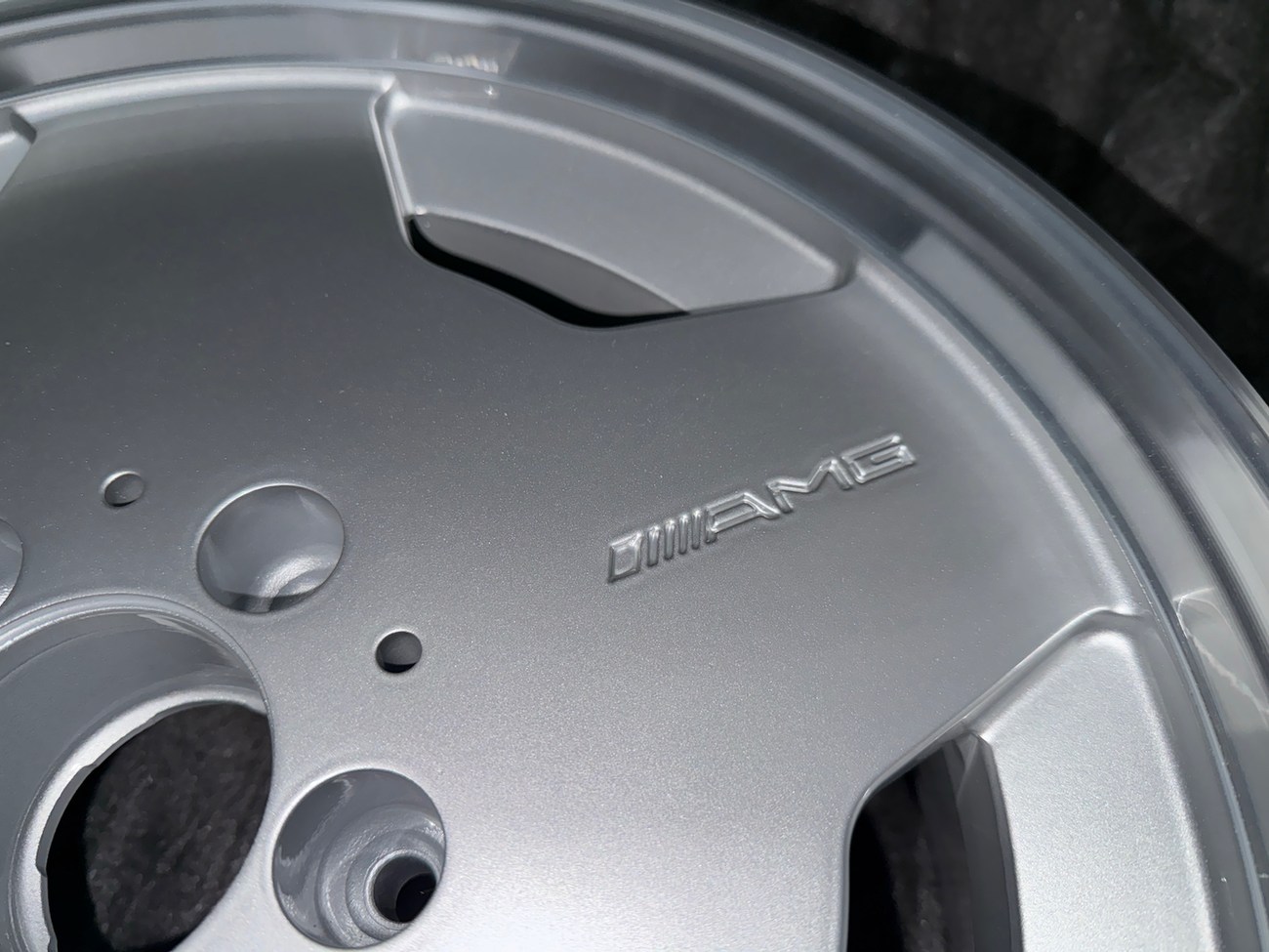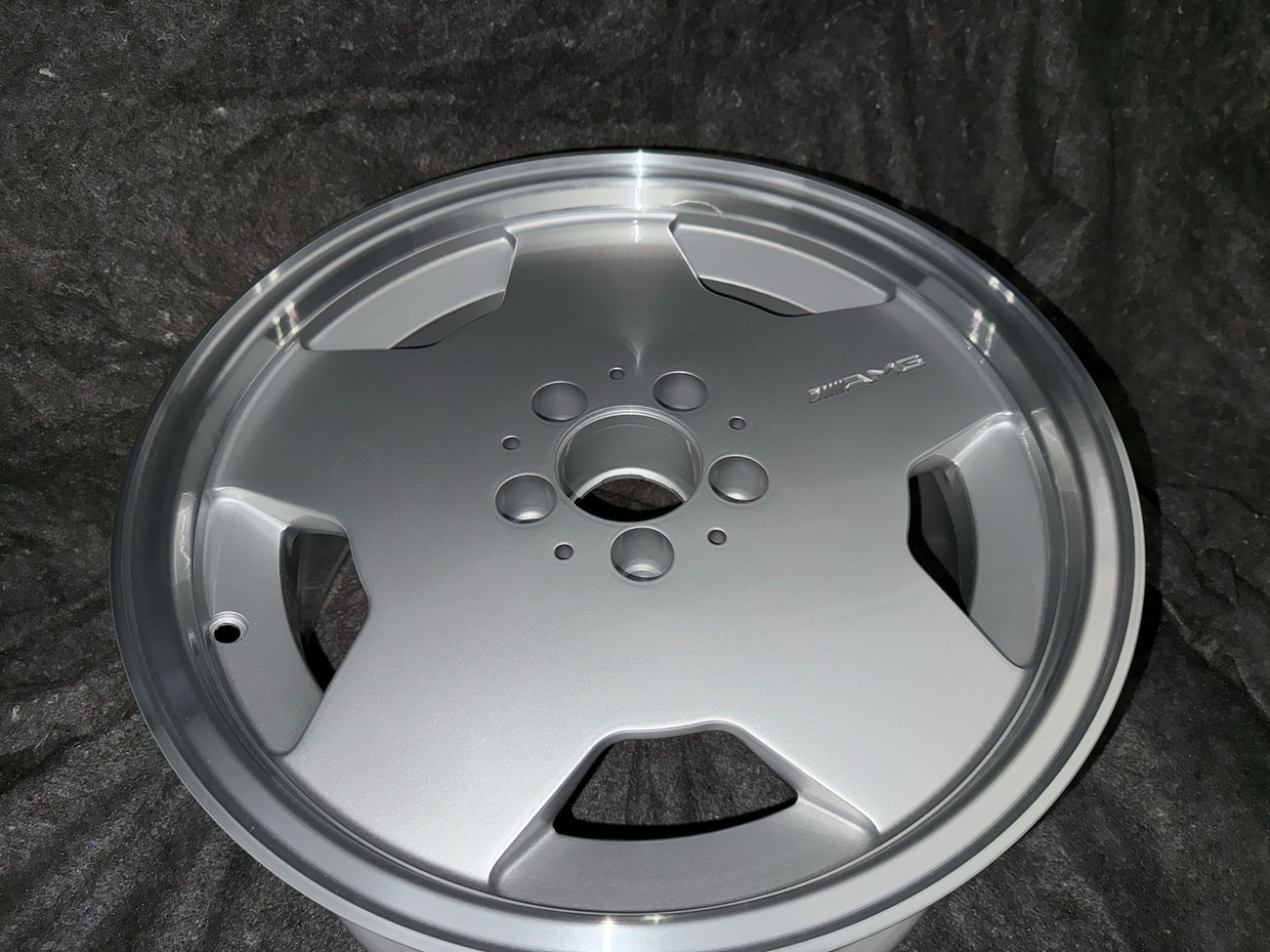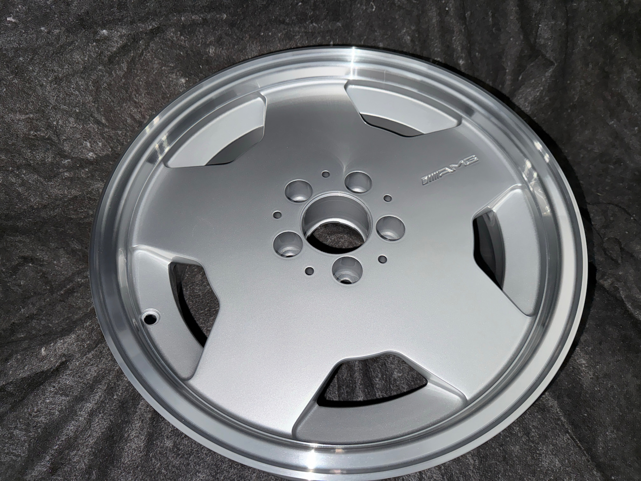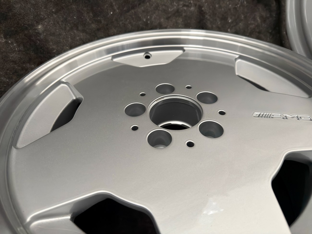 These 17″ AMG Aero I Monoblock wheels measure 8″ in width all around and were manufactured in the late to mid 90's for use on Mercedes-Benz W124 AMG vehicles. The faces are finished in silver with polished lips and show part number HWA124 400 19 02. These are the later versions of the Aero I which have HWA part numbers and the updated AMG script. The wheels have been professionally refinished in preparation for the sale. These AMG wheels are now offered with No Reserve at by the seller in Santo Domingo, Dominican Republic with worldwide shipping available.