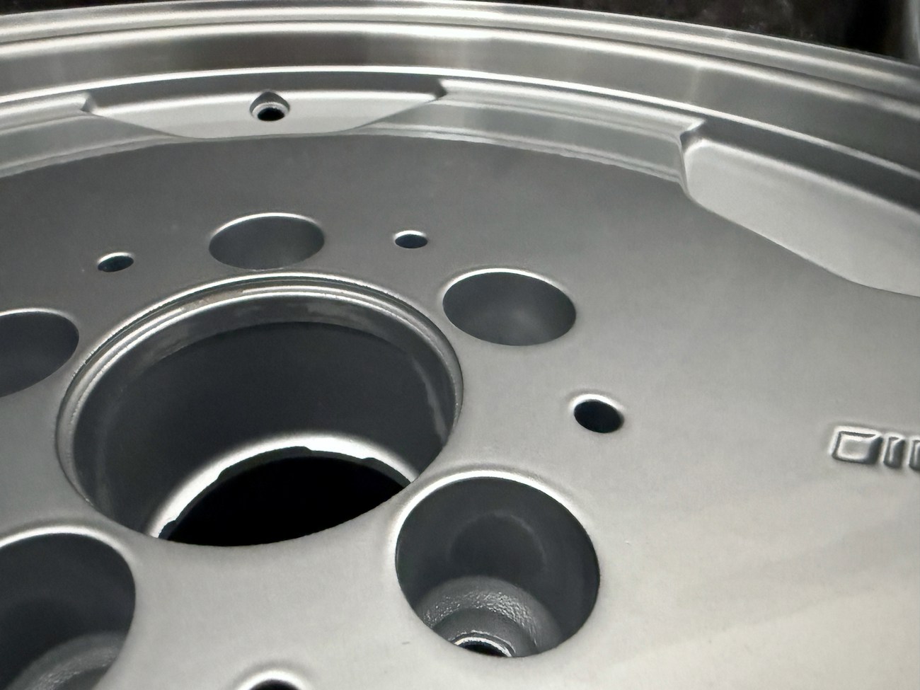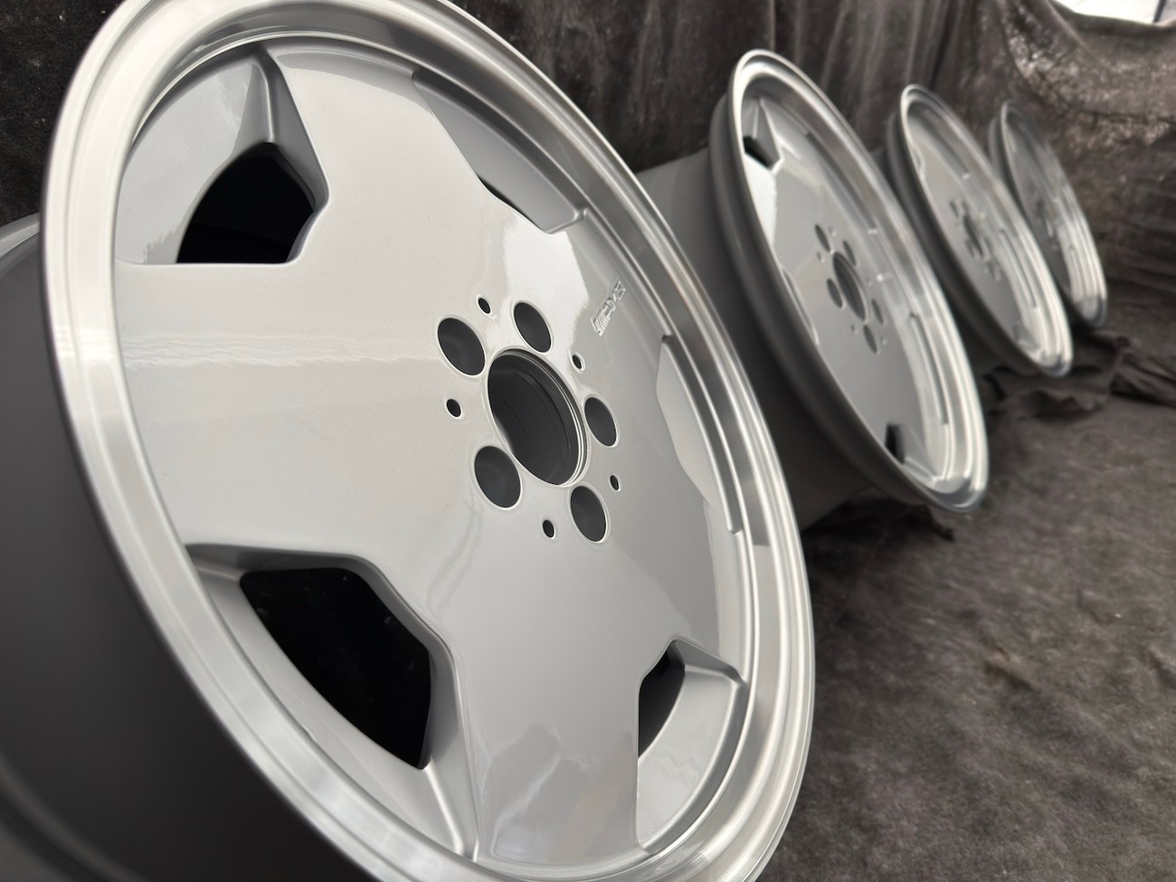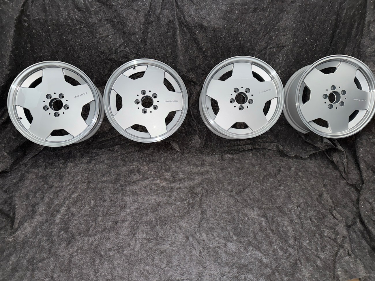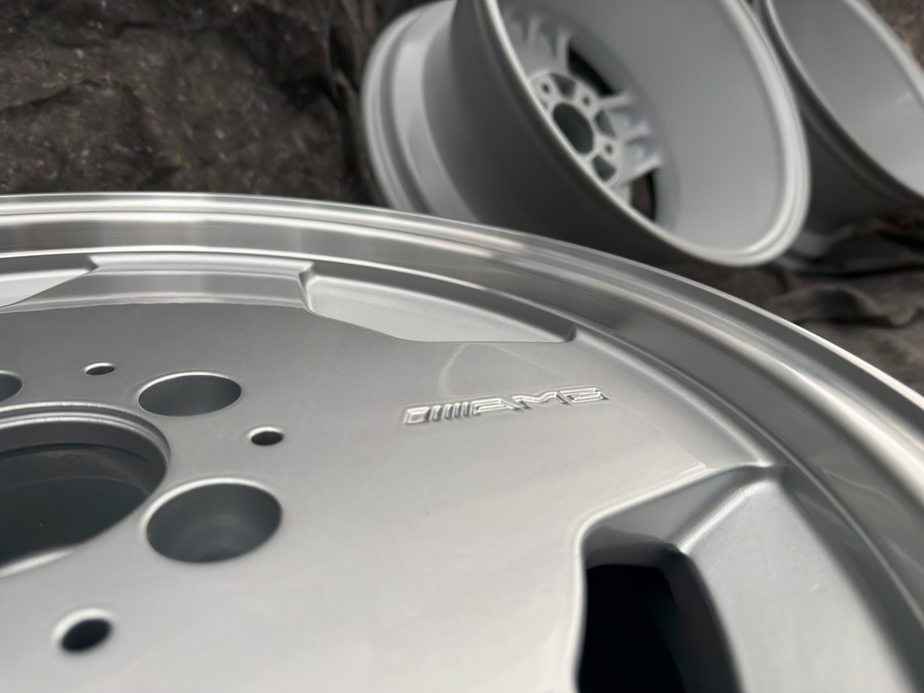 These 17″ AMG Aero I Monoblock wheels measure 8″ in width all around and were manufactured in the late to mid 90's for use on Mercedes-Benz W124 AMG vehicles. The faces are finished in silver with polished lips and show part number HWA124 400 19 02. These are the later versions of the Aero I which have HWA part numbers and the updated AMG script. The wheels have been professionally refinished in preparation for the sale. These AMG wheels are now offered with No Reserve at by the seller in Santo Domingo, Dominican Republic with worldwide shipping available.