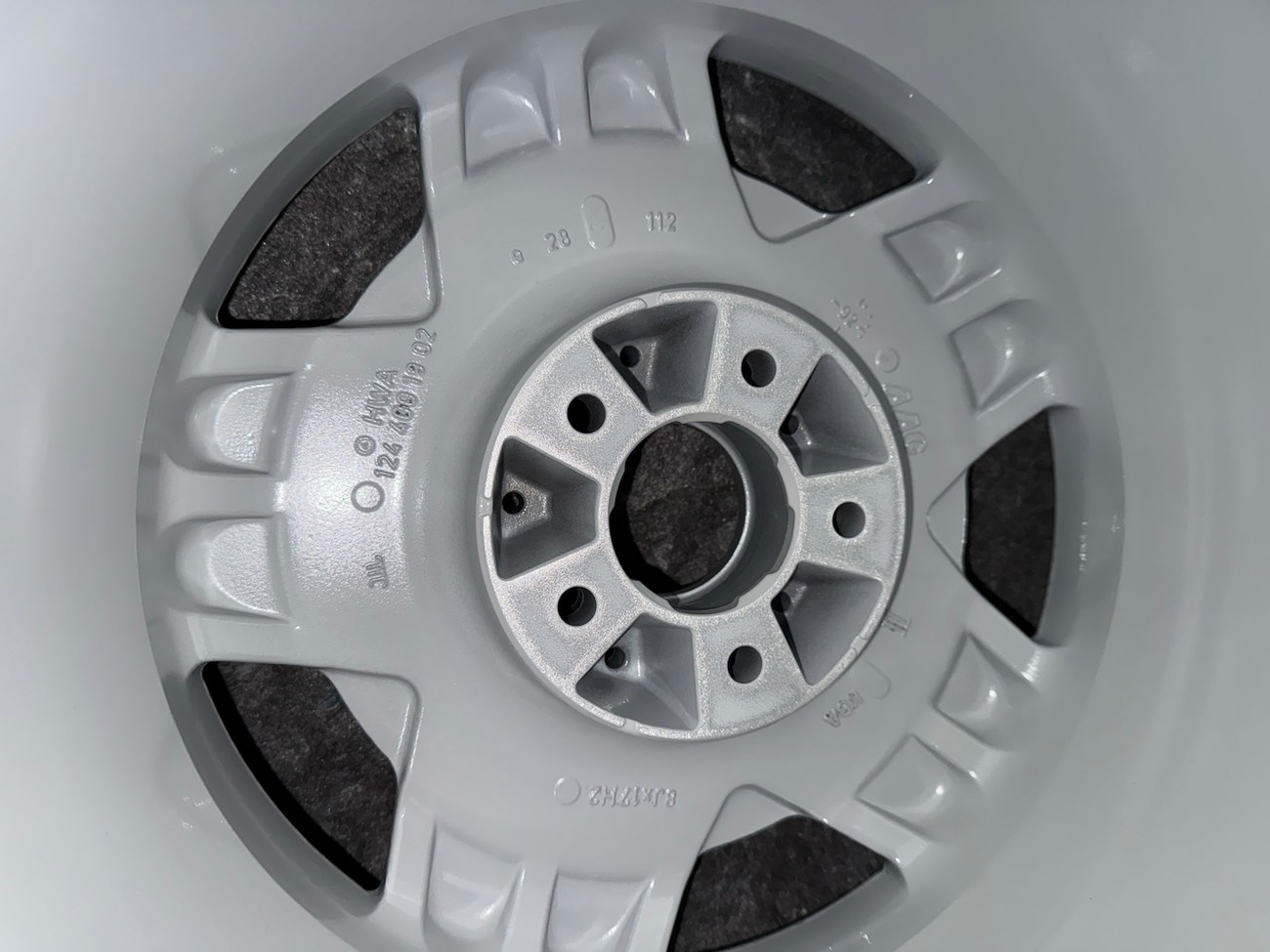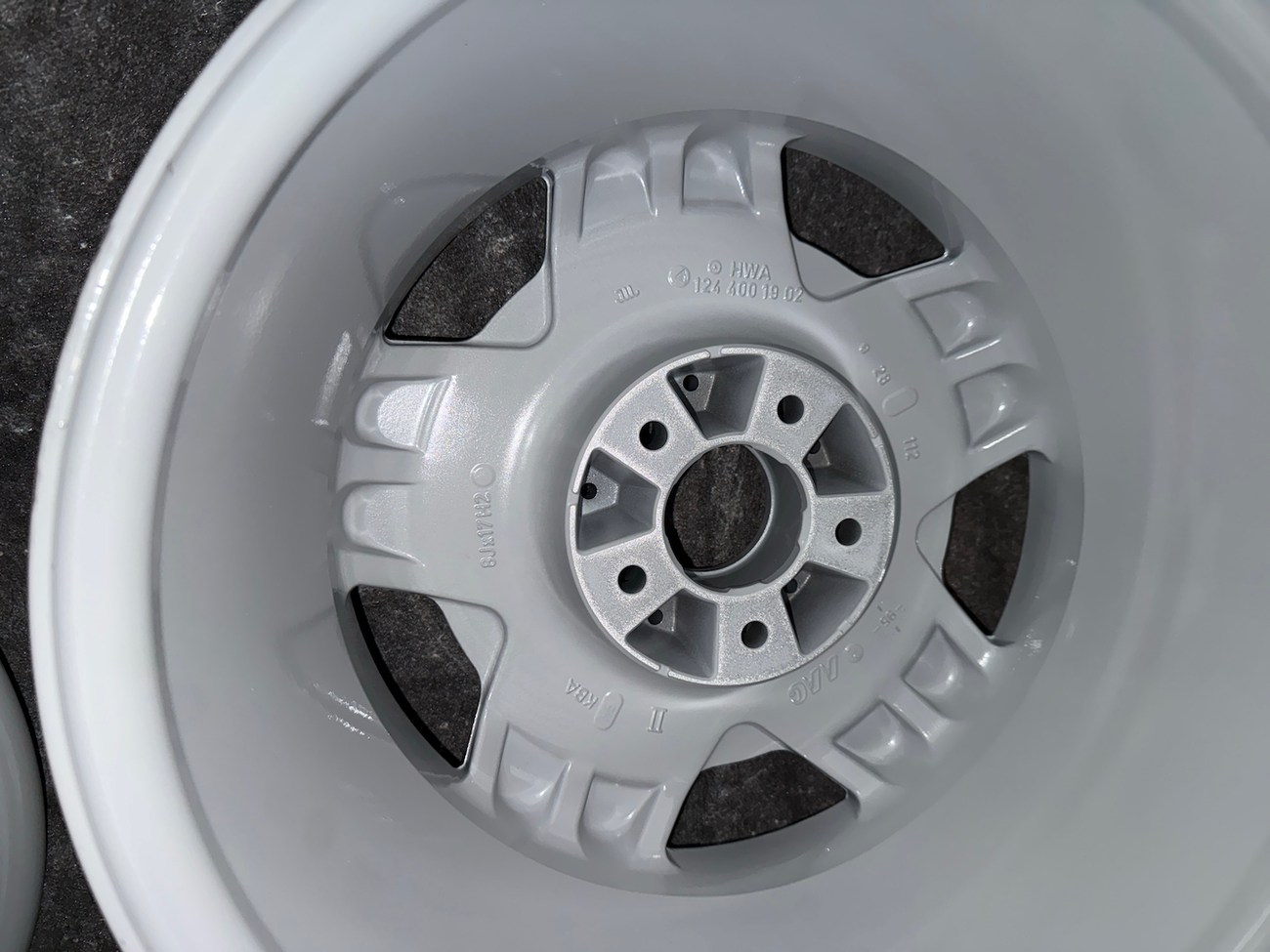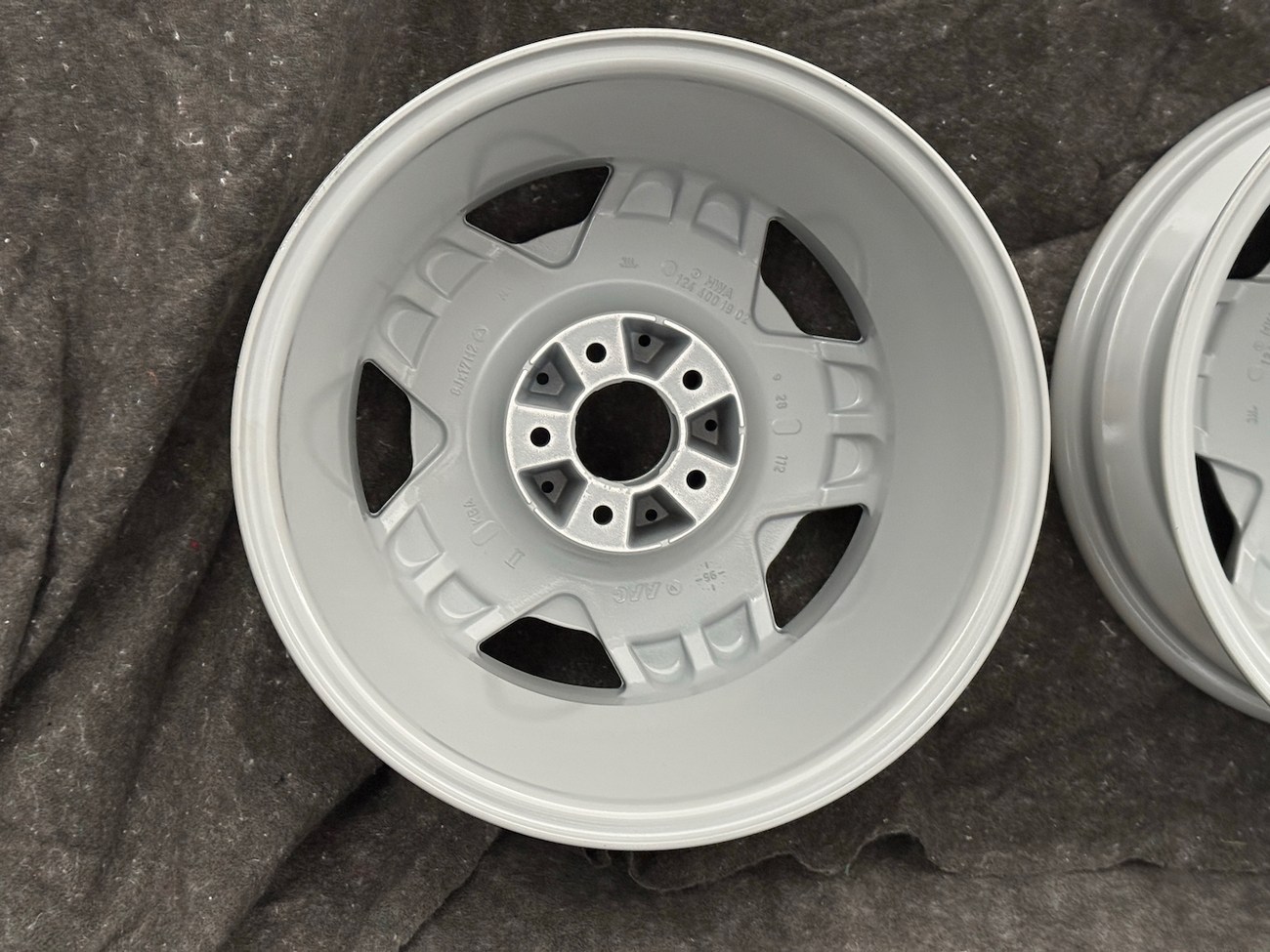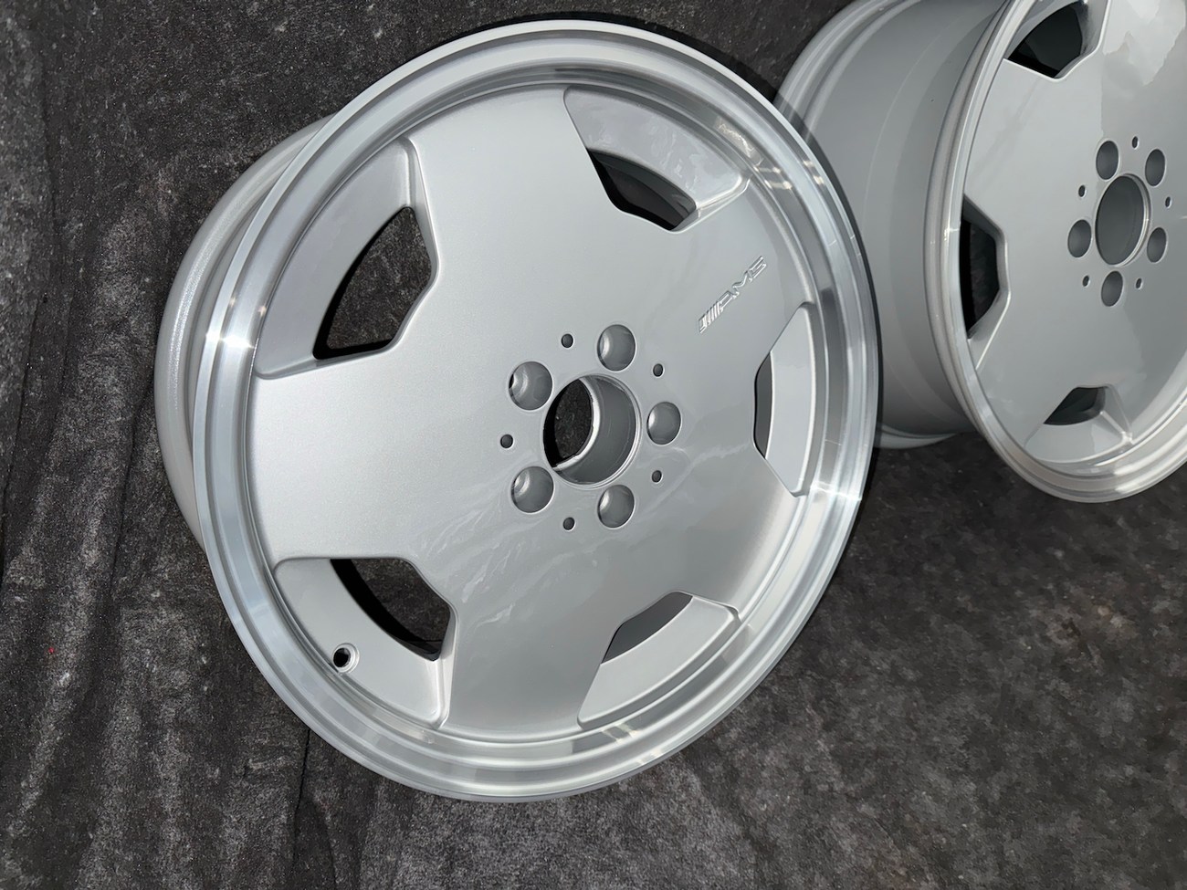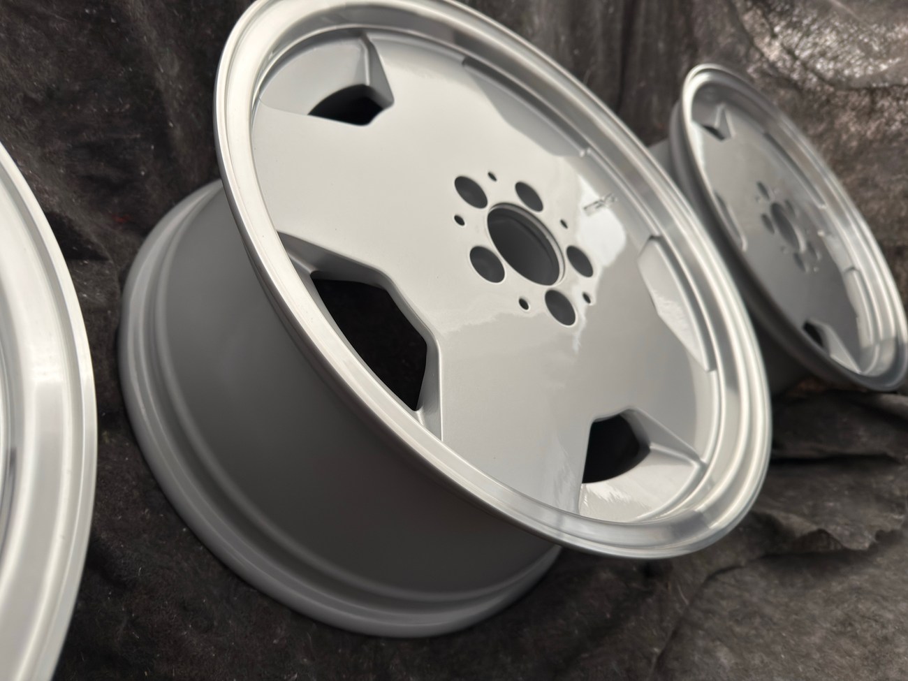 These 17″ AMG Aero I Monoblock wheels measure 8″ in width all around and were manufactured in the late to mid 90's for use on Mercedes-Benz W124 AMG vehicles. The faces are finished in silver with polished lips and show part number HWA124 400 19 02. These are the later versions of the Aero I which have HWA part numbers and the updated AMG script. The wheels have been professionally refinished in preparation for the sale. These AMG wheels are now offered with No Reserve at by the seller in Santo Domingo, Dominican Republic with worldwide shipping available.