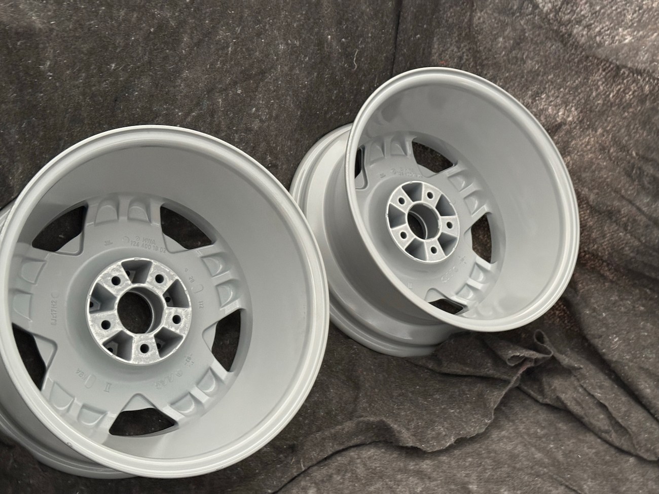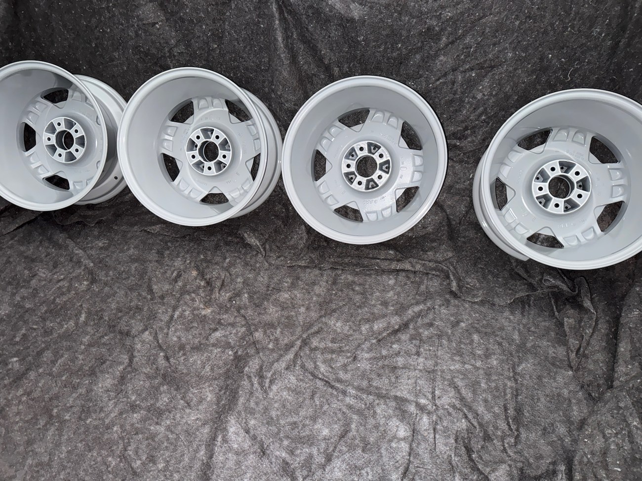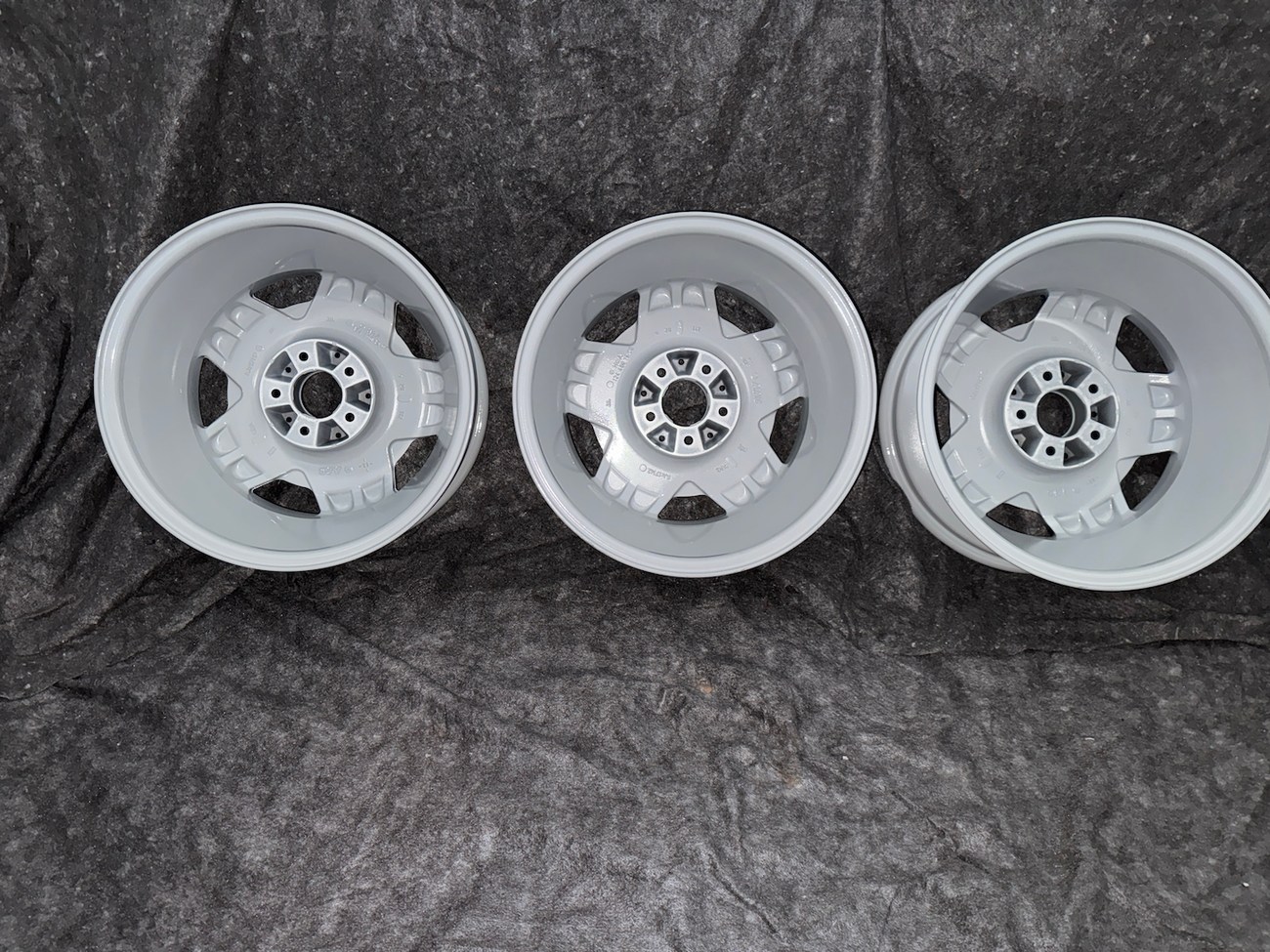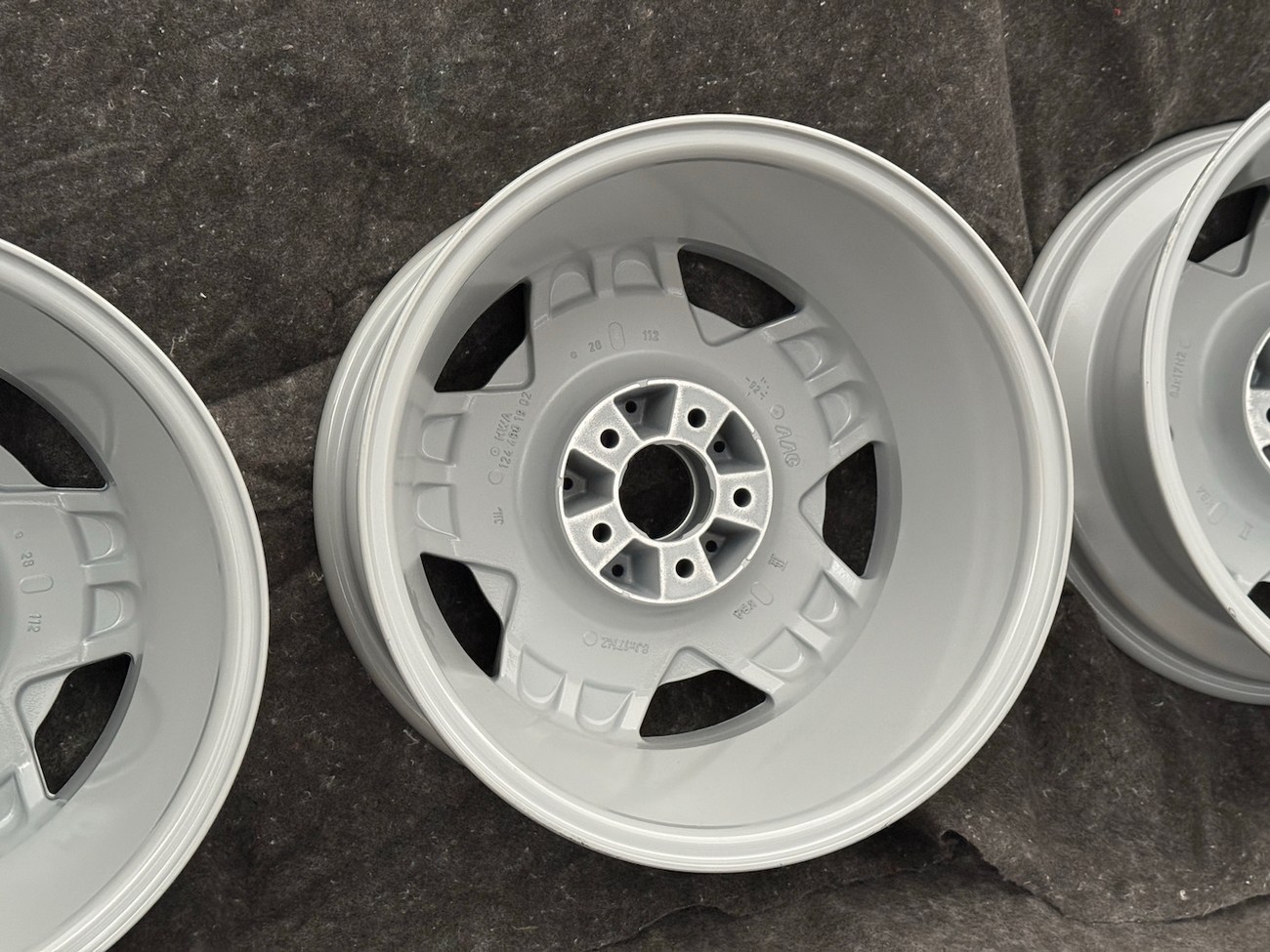 These 17″ AMG Aero I Monoblock wheels measure 8″ in width all around and were manufactured in the late to mid 90's for use on Mercedes-Benz W124 AMG vehicles. The faces are finished in silver with polished lips and show part number HWA124 400 19 02. These are the later versions of the Aero I which have HWA part numbers and the updated AMG script. The wheels have been professionally refinished in preparation for the sale. These AMG wheels are now offered with No Reserve at by the seller in Santo Domingo, Dominican Republic with worldwide shipping available.