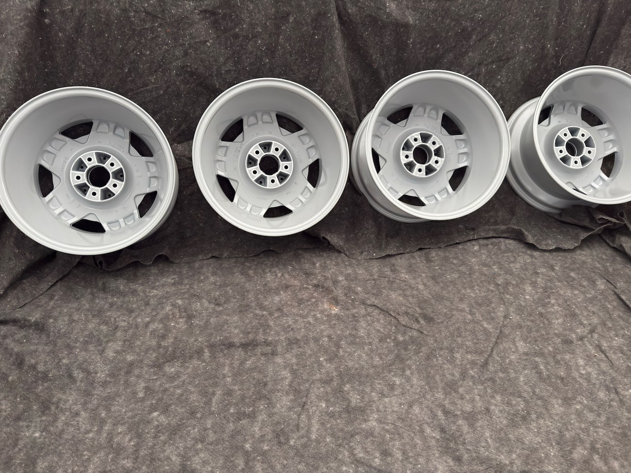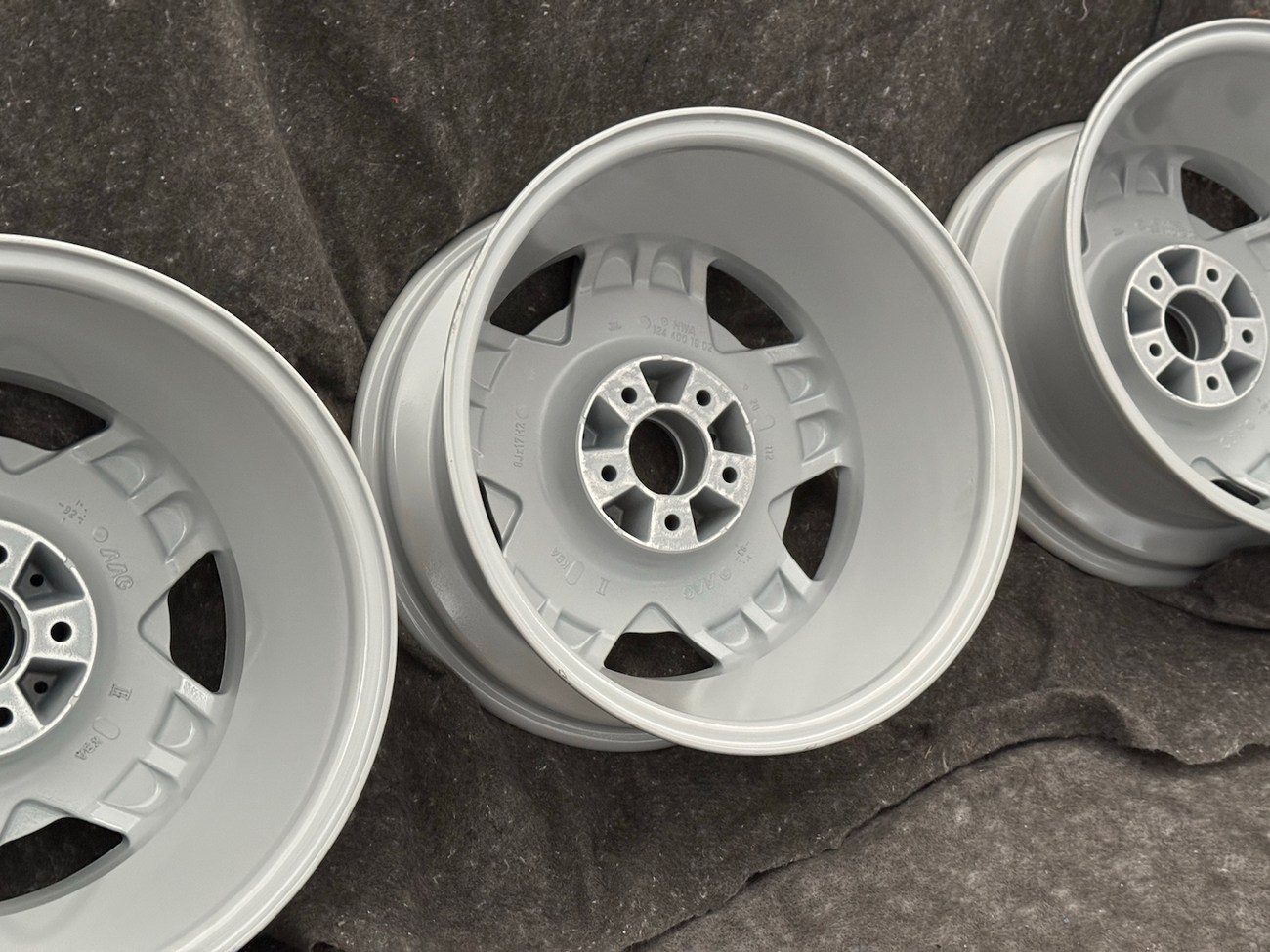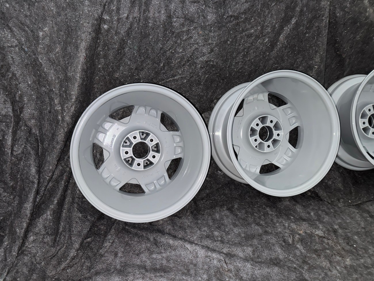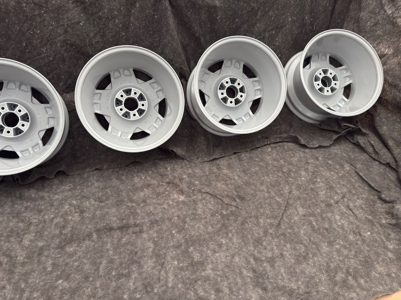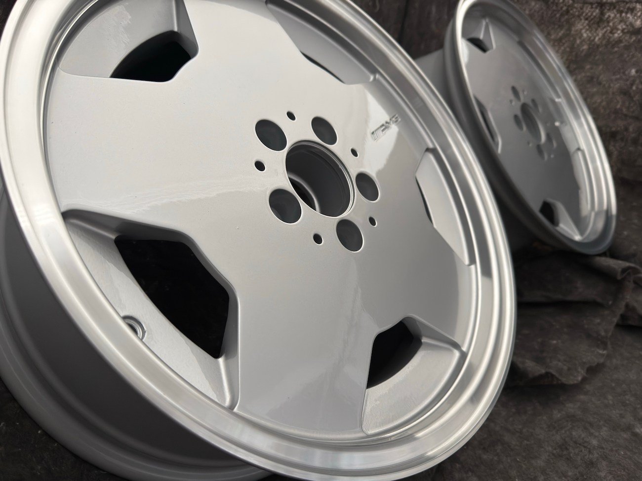 These 17″ AMG Aero I Monoblock wheels measure 8″ in width all around and were manufactured in the late to mid 90's for use on Mercedes-Benz W124 AMG vehicles. The faces are finished in silver with polished lips and show part number HWA124 400 19 02. These are the later versions of the Aero I which have HWA part numbers and the updated AMG script. The wheels have been professionally refinished in preparation for the sale. These AMG wheels are now offered with No Reserve at by the seller in Santo Domingo, Dominican Republic with worldwide shipping available.