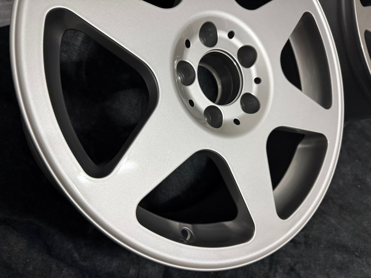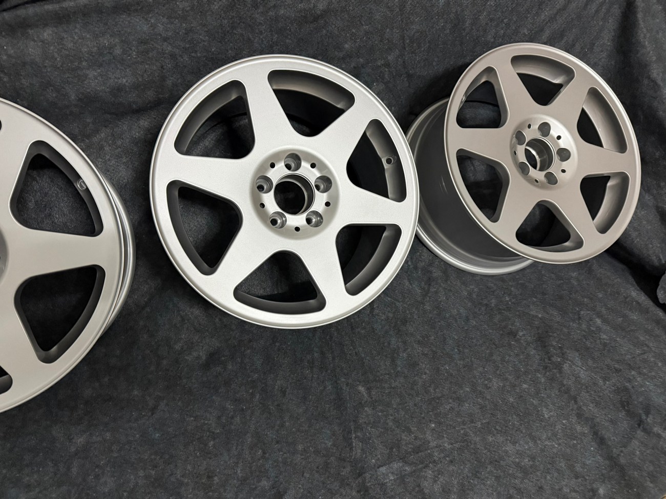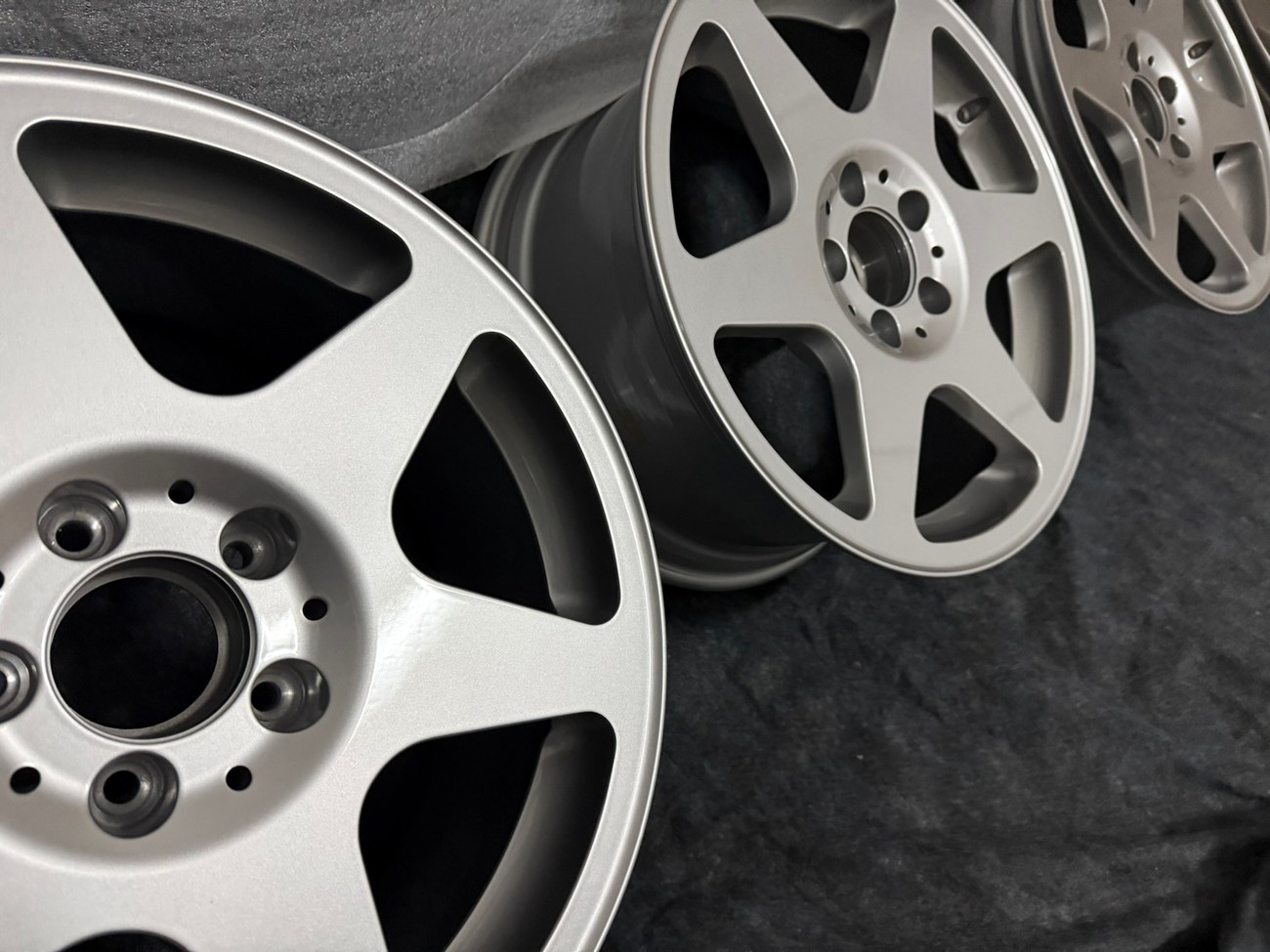 These factory Mercedes-Benz Evo II wheels all measure 17" x 8.25” and were manufactured by in Italy for use on the W201 and W124 chassis. The wheels are new old stock and have never been used. Finished with silver painted faces, this wheel design was offered by Mercedes-Benz on a number of models including the W201 Evo II and W124 500E Limited. This particular set features an offset of +34. Dimensions, offsets, and other manufacturer casting marks are present on each wheel. These Evo II wheels are now offered by the seller at No Reserve in Dominican Republic with OEM center caps installed and worldwide shipping is available.