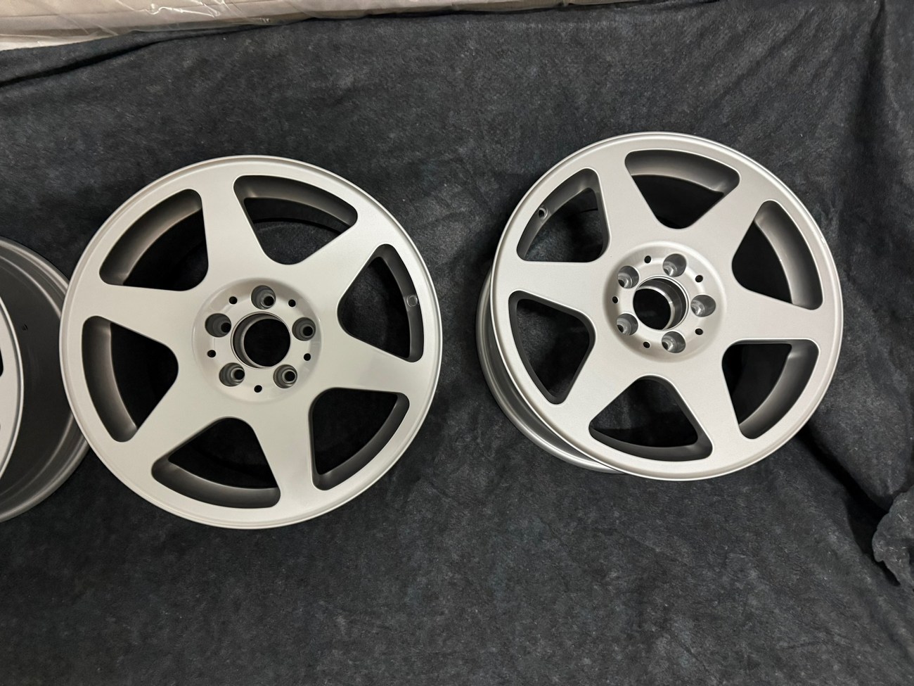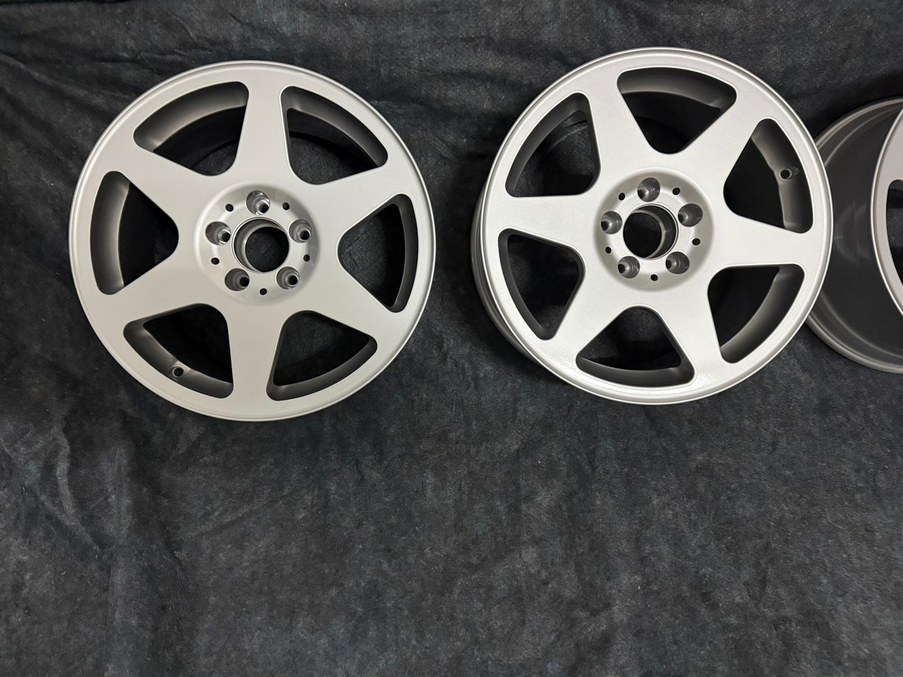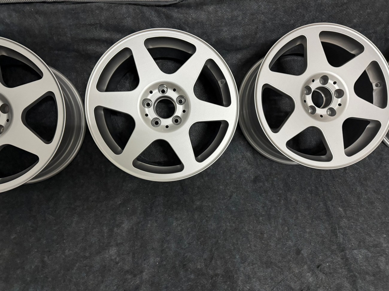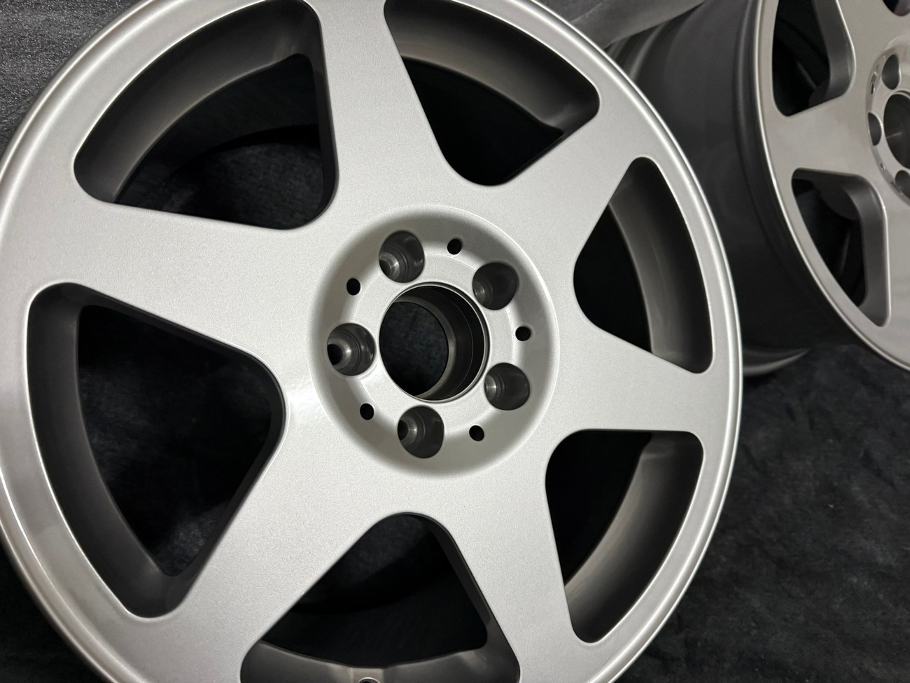 These factory Mercedes-Benz Evo II wheels all measure 17" x 8.25” and were manufactured by in Italy for use on the W201 and W124 chassis. The wheels are new old stock and have never been used. Finished with silver painted faces, this wheel design was offered by Mercedes-Benz on a number of models including the W201 Evo II and W124 500E Limited. This particular set features an offset of +34. Dimensions, offsets, and other manufacturer casting marks are present on each wheel. These Evo II wheels are now offered by the seller at No Reserve in Dominican Republic with OEM center caps installed and worldwide shipping is available.