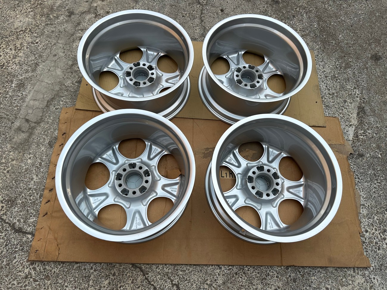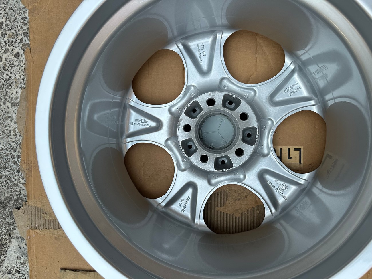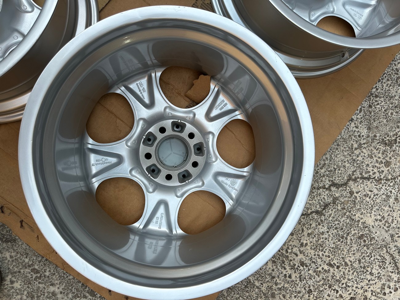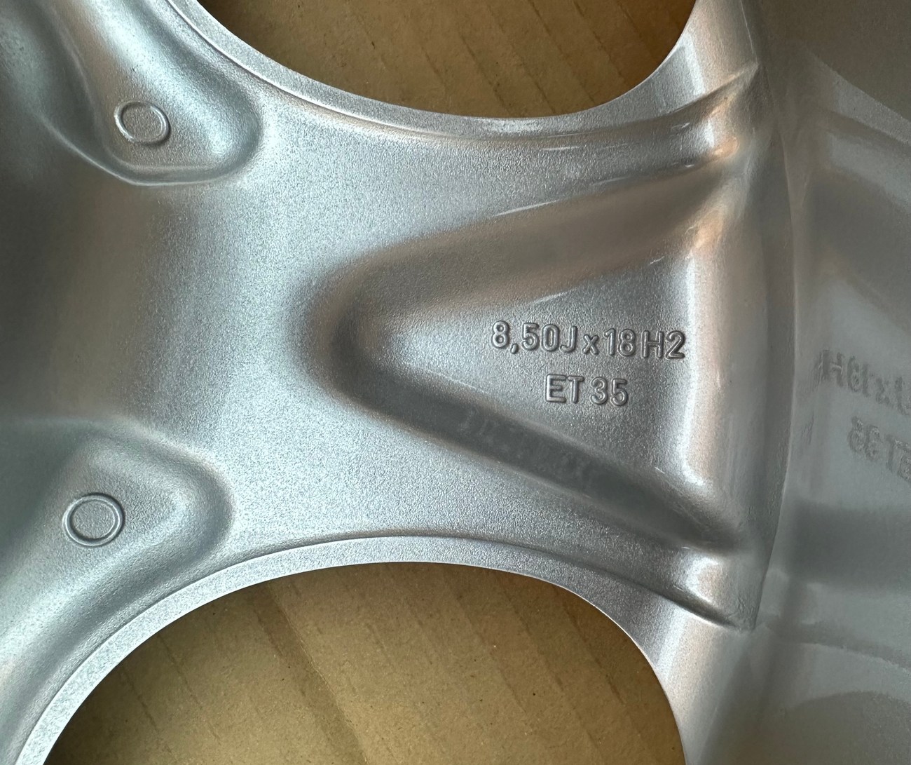All four wheels measures 8.5" wide with an offset of +35. Close up photos of the back of the wheels are viewable in the gallery showing additional casting marks and all four wheels feature a 5x112mm bolt pattern. The 66.67 center bore is specific to Mercedes-Benz vehicles.