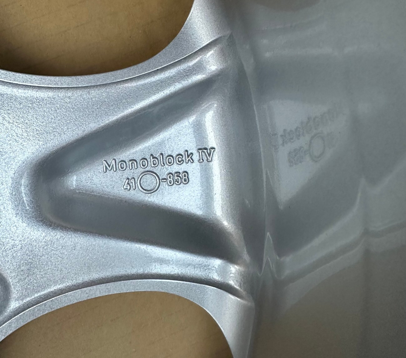 These single-piece Monoblock IV wheels fit a wide variety of Mercedes-Benz models from the 90's and 2000's. The faces feature a silver painted face with polished lips and have been professionally refinished in preparation for the sale. Up close photos of each face are provided in the gallery and no imperfections are noted.