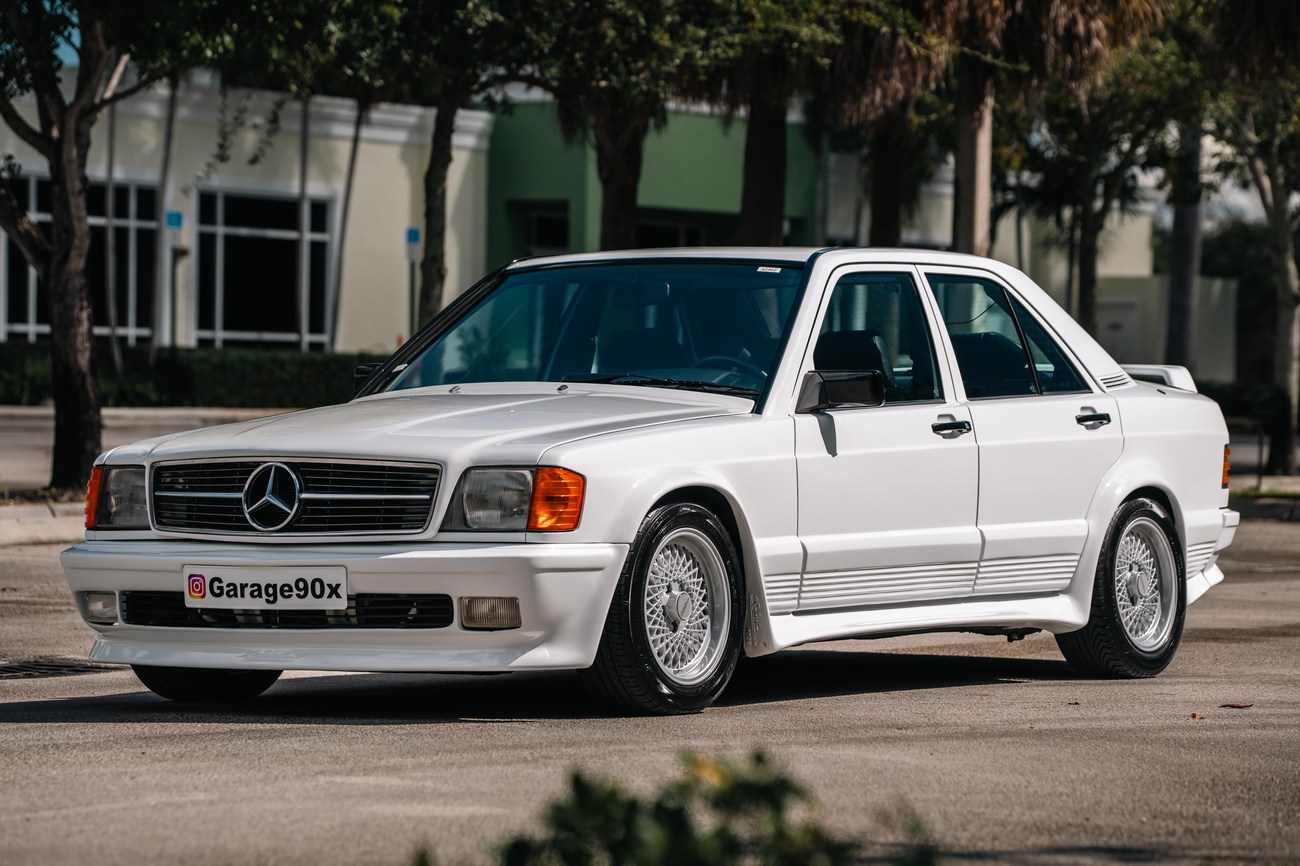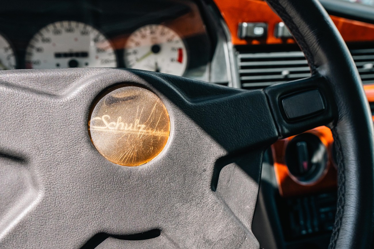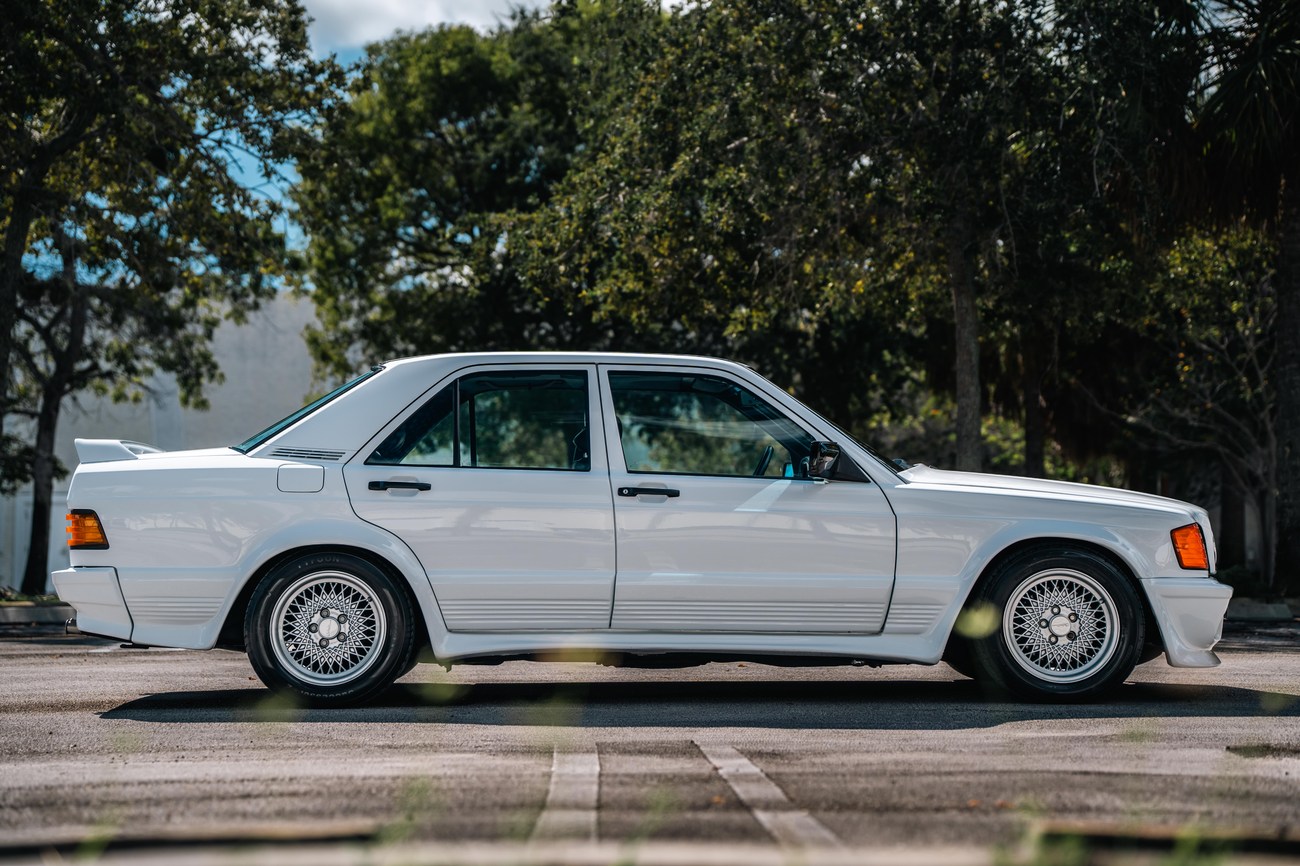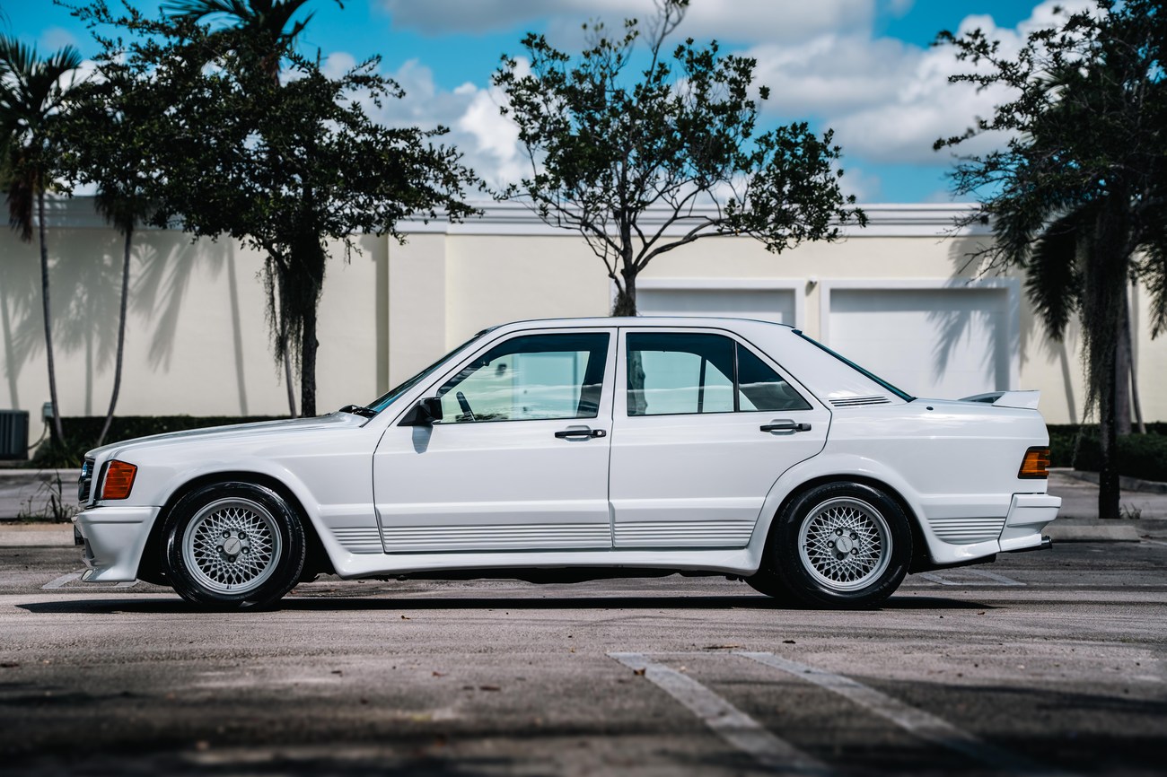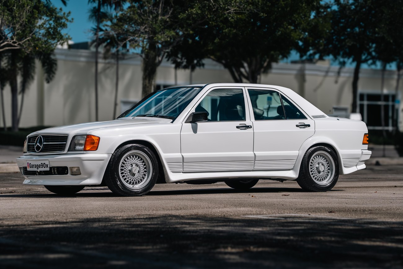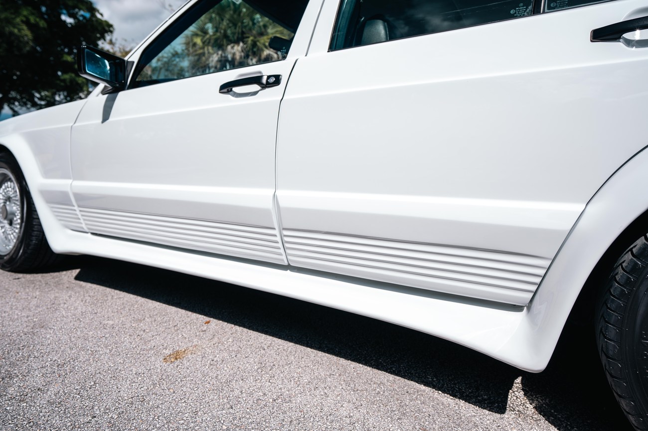 This 1985 Mercedes-Benz 190E 2.3-16v Cosworth was modified by Shulz Tuning in period and imported from Europe in 2023. Finished in Classic White (737) over Anthracite Leather (271), power is provided by a Cosworth-developed 2.3L 16v M102 I4 engine mated to a 5-speed manual transmission. Shulz was known for their coachwork widebody with flared fenders molded seamlessly into the bumpers and skirts, along with C126 SEC front end conversions. Other features include Rial mesh wheels with KBA part numbers, quad exhaust outlets, an Alpine stereo system, custom ATIWE steering wheel, Schulz Tuning speedometer, factory Recaro seats, additional woodgrain accents. An extensive service was performed in June 2025 totalling nearly $7k. Service included a new fuel filter and accumulator, oil service, brake fluid flush, brake master cylinder, shifter linkage bushings, A/C compressor w/clutch, receiver drier, expansion valve, blower motor, pressure switch, EHA actuator, clutch master cylinder, and heater control valve. This Cosworth 190E Schulz shows just over 81k kilometers (~50k miles) and is now offered out of the seller's private collection in Florida with Shulz Tuning catalog and a Florida title.