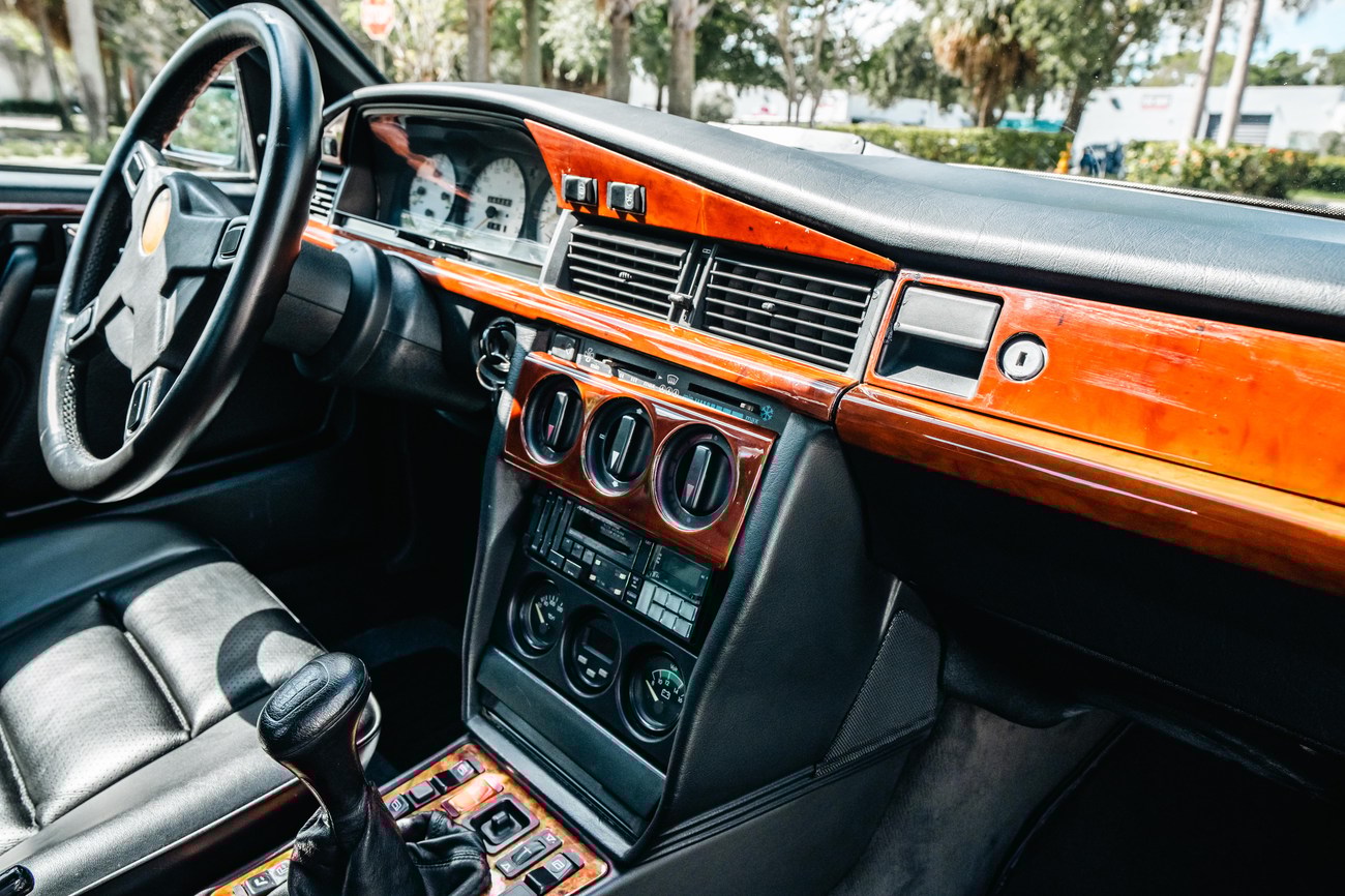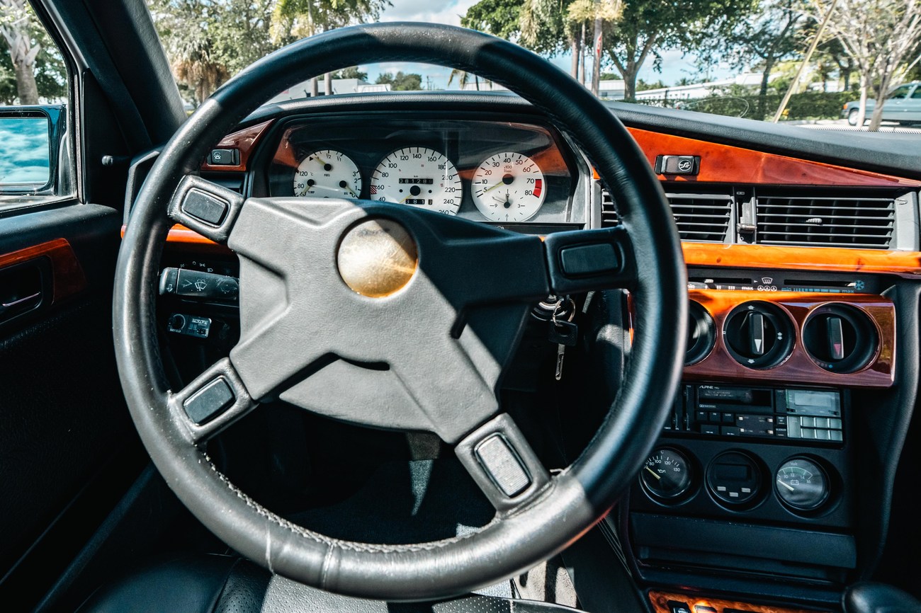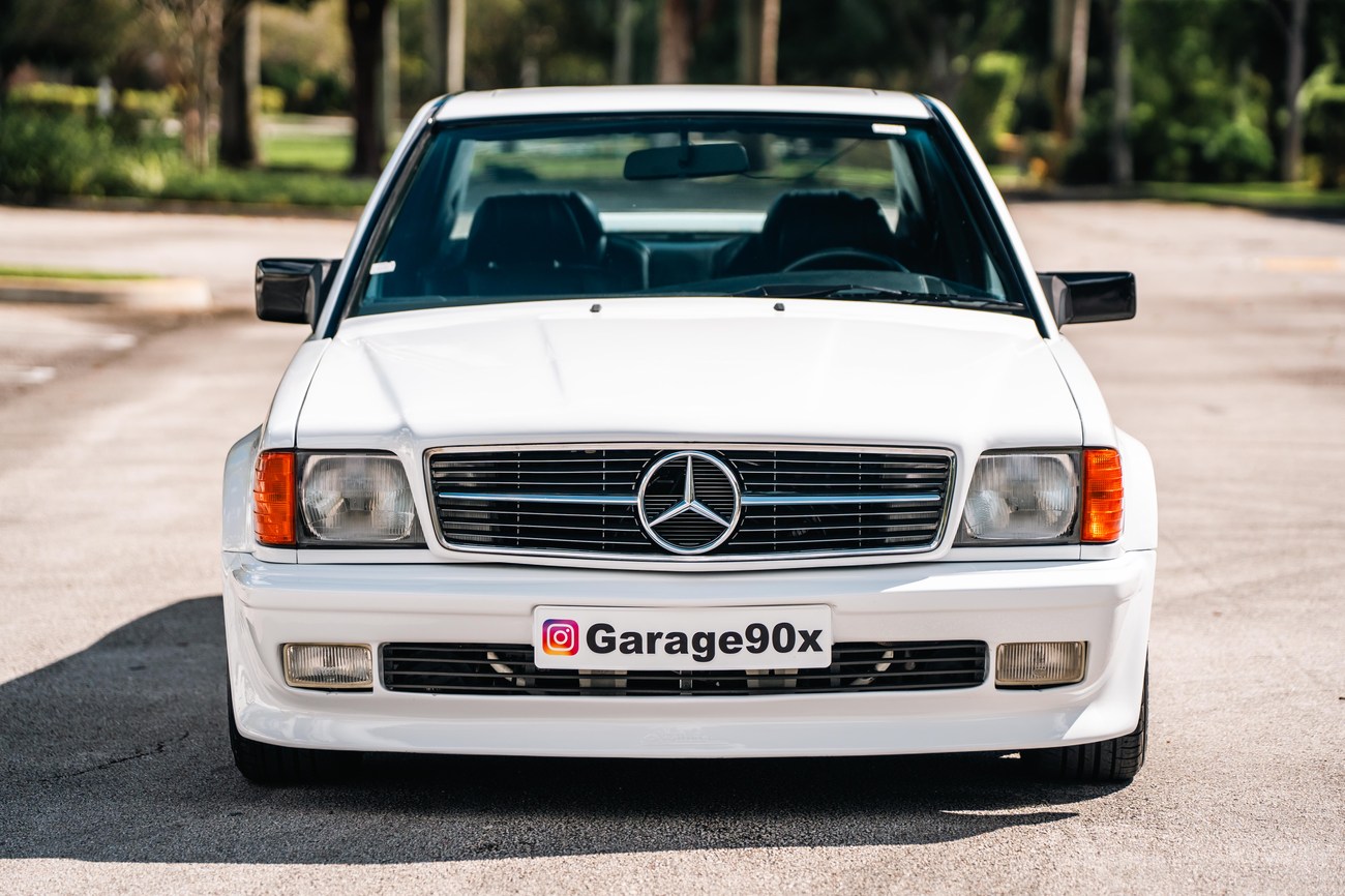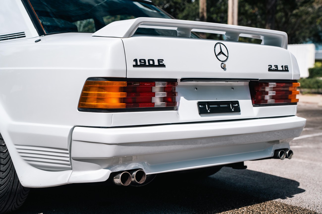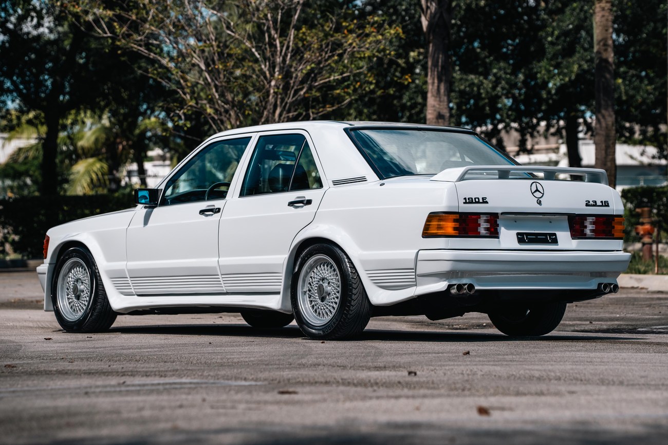 This 1985 Mercedes-Benz 190E 2.3-16v Cosworth was modified by Shulz Tuning in period and imported from Europe in 2023. Finished in Classic White (737) over Anthracite Leather (271), power is provided by a Cosworth-developed 2.3L 16v M102 I4 engine mated to a 5-speed manual transmission. Shulz was known for their coachwork widebody with flared fenders molded seamlessly into the bumpers and skirts, along with C126 SEC front end conversions. Other features include Rial mesh wheels with KBA part numbers, quad exhaust outlets, an Alpine stereo system, custom ATIWE steering wheel, Schulz Tuning speedometer, factory Recaro seats, additional woodgrain accents. An extensive service was performed in June 2025 totalling nearly $7k. Service included a new fuel filter and accumulator, oil service, brake fluid flush, brake master cylinder, shifter linkage bushings, A/C compressor w/clutch, receiver drier, expansion valve, blower motor, pressure switch, EHA actuator, clutch master cylinder, and heater control valve. This Cosworth 190E Schulz shows just over 81k kilometers (~50k miles) and is now offered out of the seller's private collection in Florida with Shulz Tuning catalog and a Florida title.