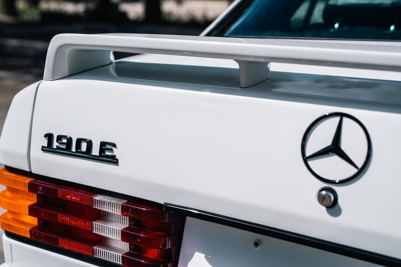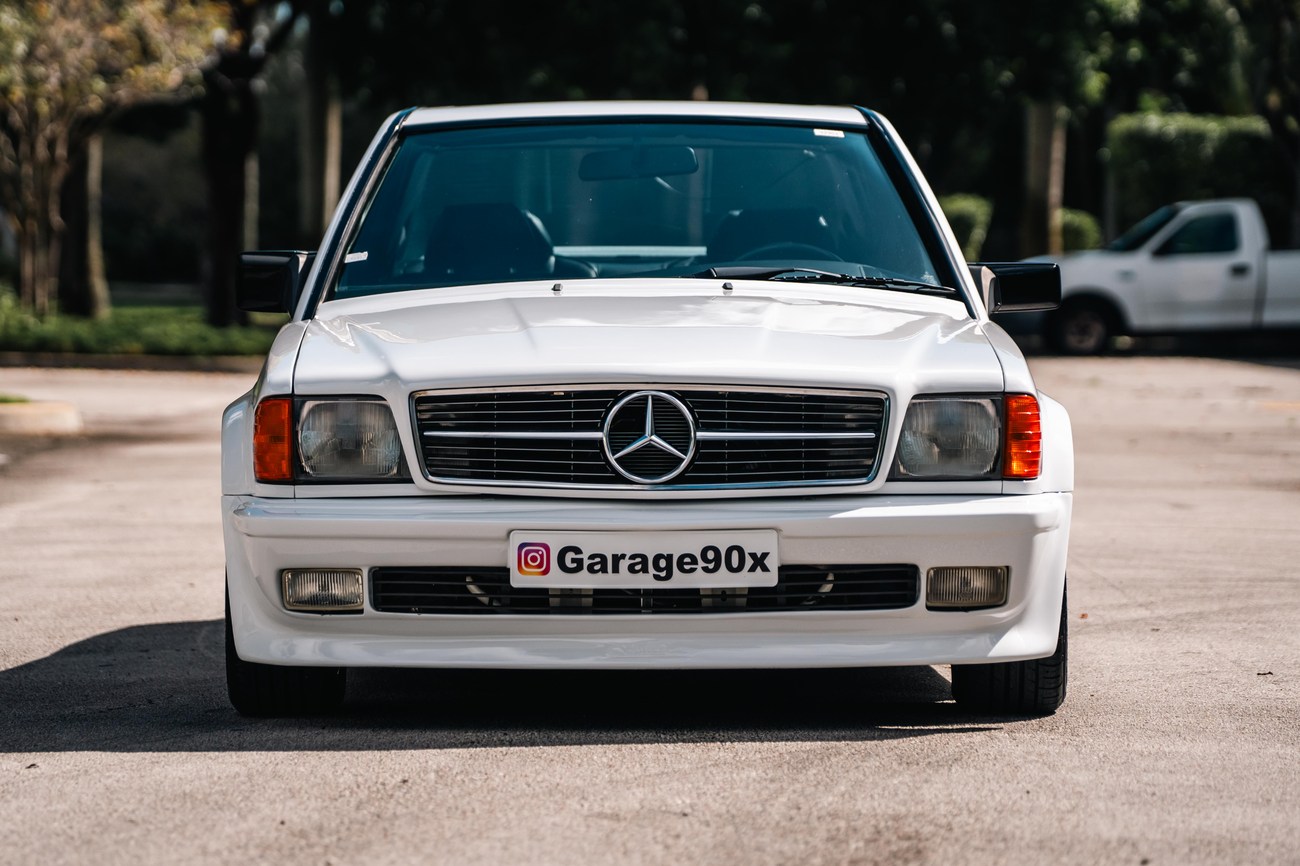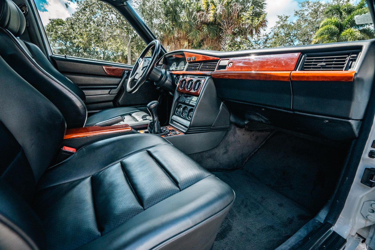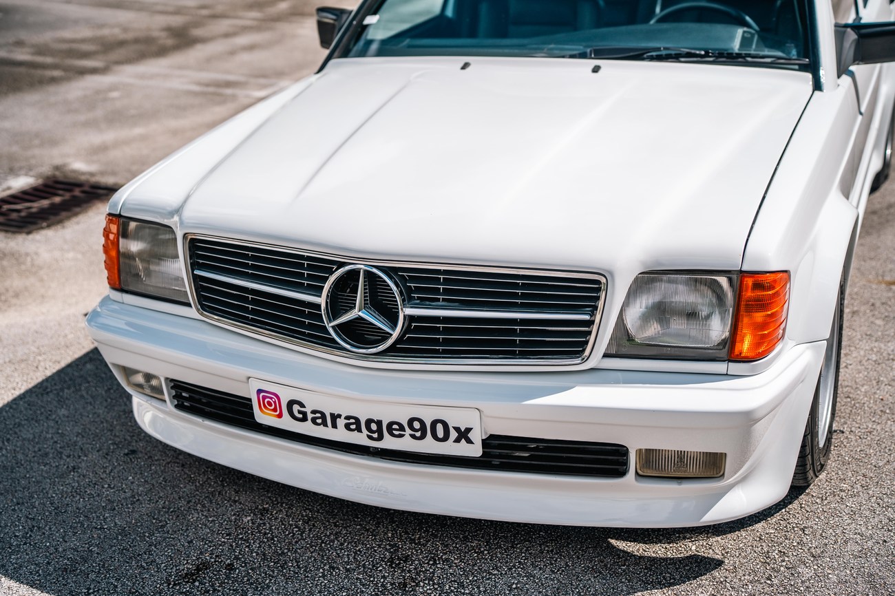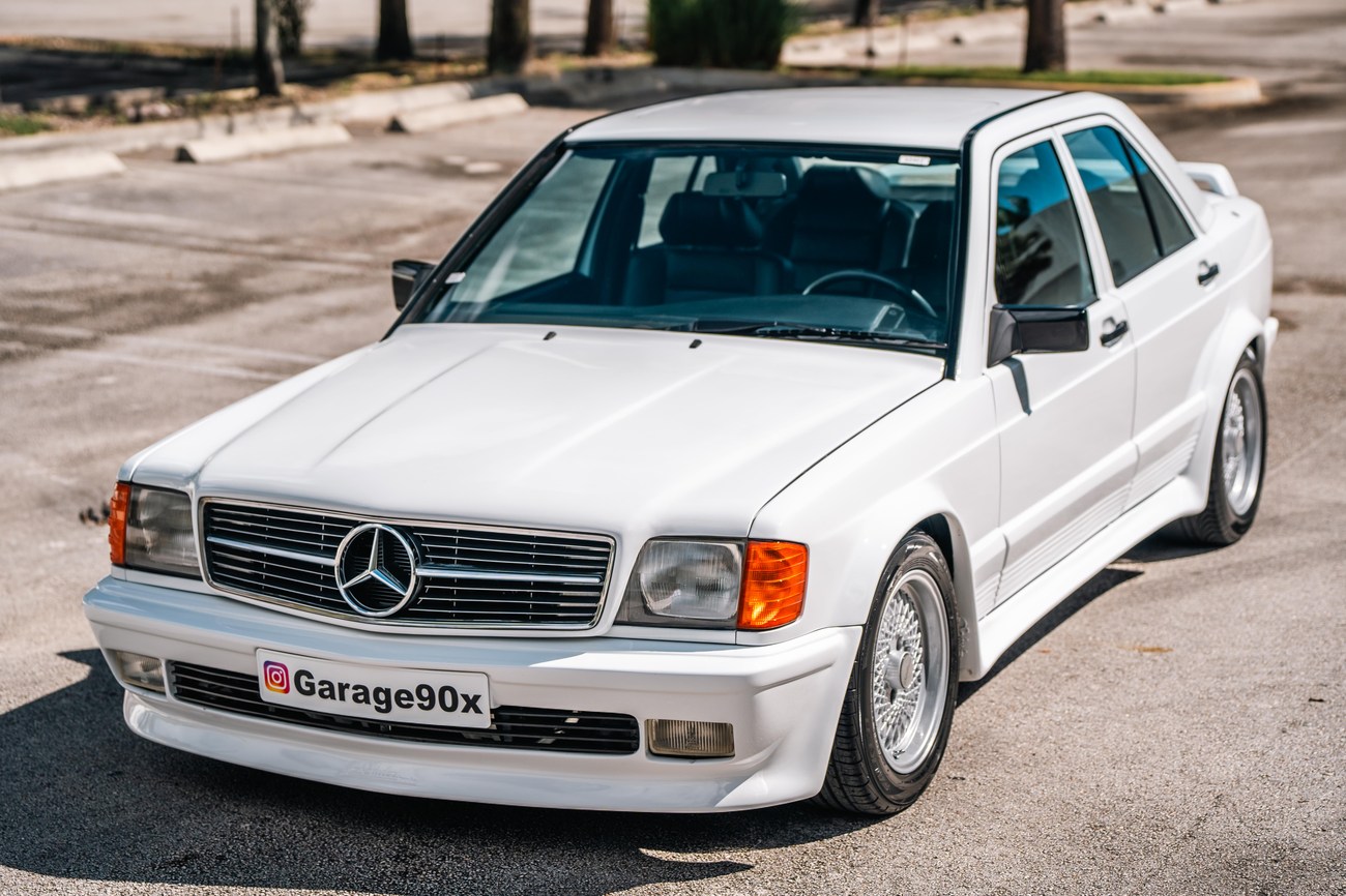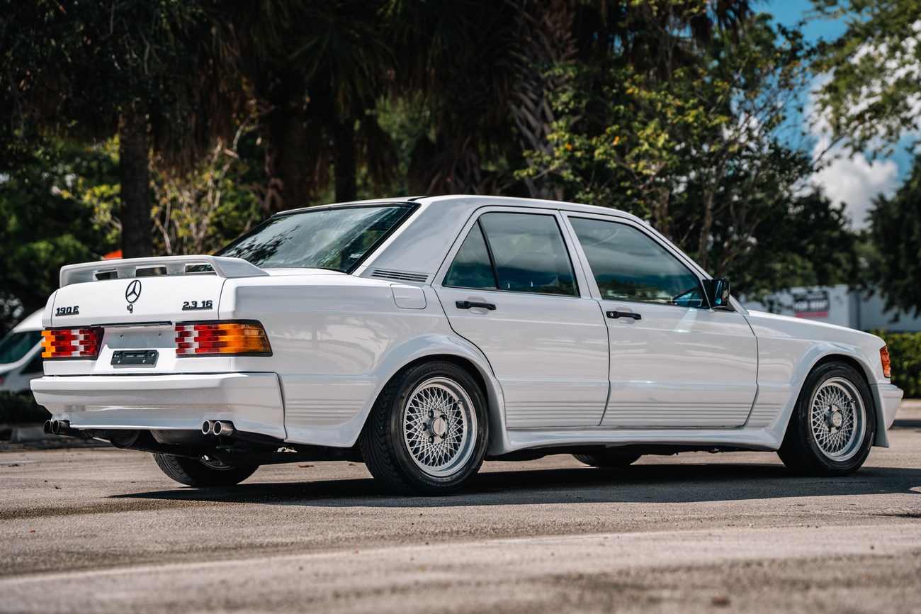 This 1985 Mercedes-Benz 190E 2.3-16v Cosworth was modified by Shulz Tuning in period and imported from Europe in 2023. Finished in Classic White (737) over Anthracite Leather (271), power is provided by a Cosworth-developed 2.3L 16v M102 I4 engine mated to a 5-speed manual transmission. Shulz was known for their coachwork widebody with flared fenders molded seamlessly into the bumpers and skirts, along with C126 SEC front end conversions. Other features include Rial mesh wheels with KBA part numbers, quad exhaust outlets, an Alpine stereo system, custom ATIWE steering wheel, Schulz Tuning speedometer, factory Recaro seats, additional woodgrain accents. An extensive service was performed in June 2025 totalling nearly $7k. Service included a new fuel filter and accumulator, oil service, brake fluid flush, brake master cylinder, shifter linkage bushings, A/C compressor w/clutch, receiver drier, expansion valve, blower motor, pressure switch, EHA actuator, clutch master cylinder, and heater control valve. This Cosworth 190E Schulz shows just over 81k kilometers (~50k miles) and is now offered out of the seller's private collection in Florida with Shulz Tuning catalog and a Florida title.