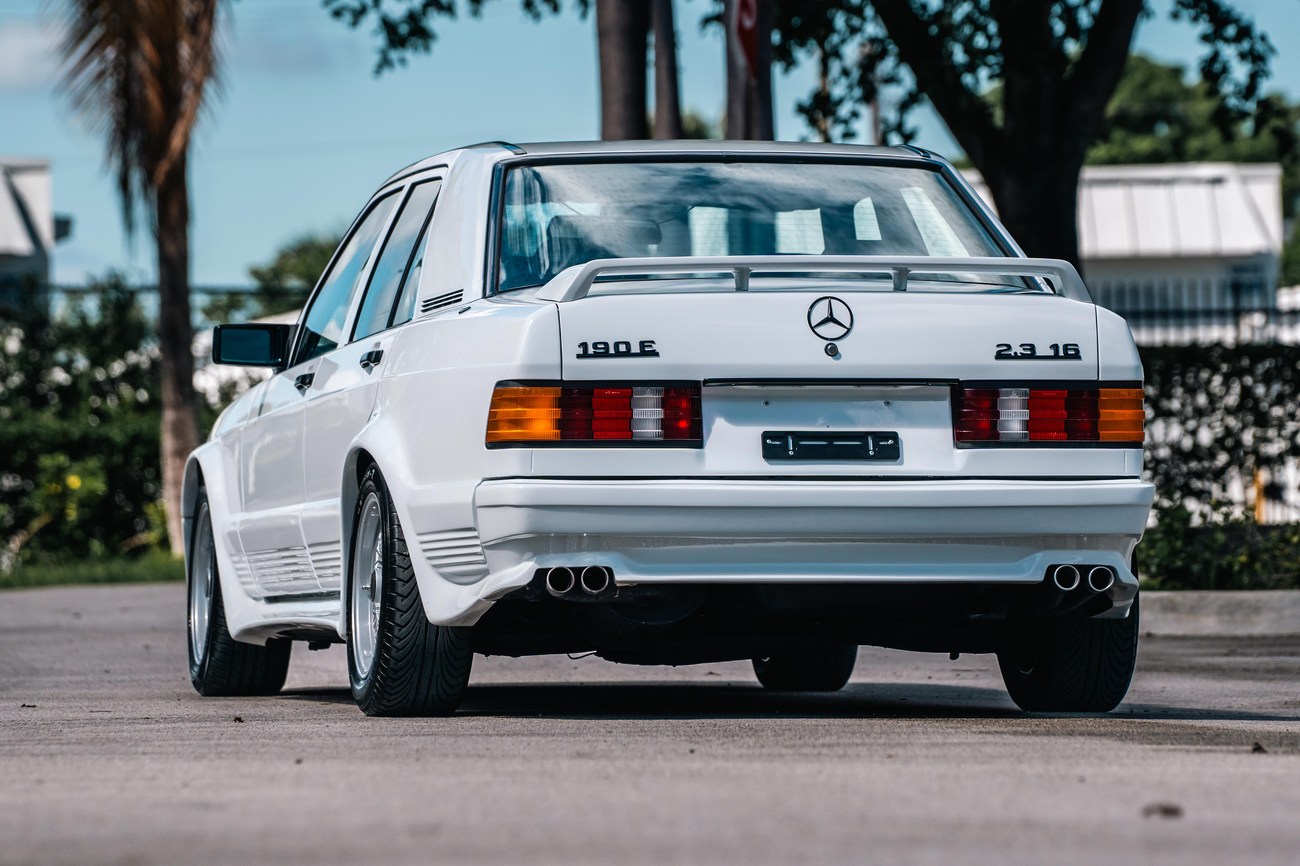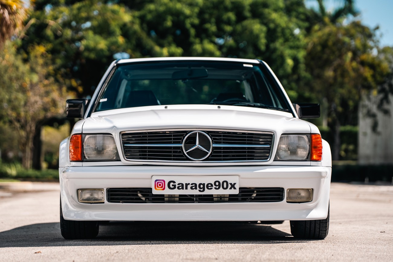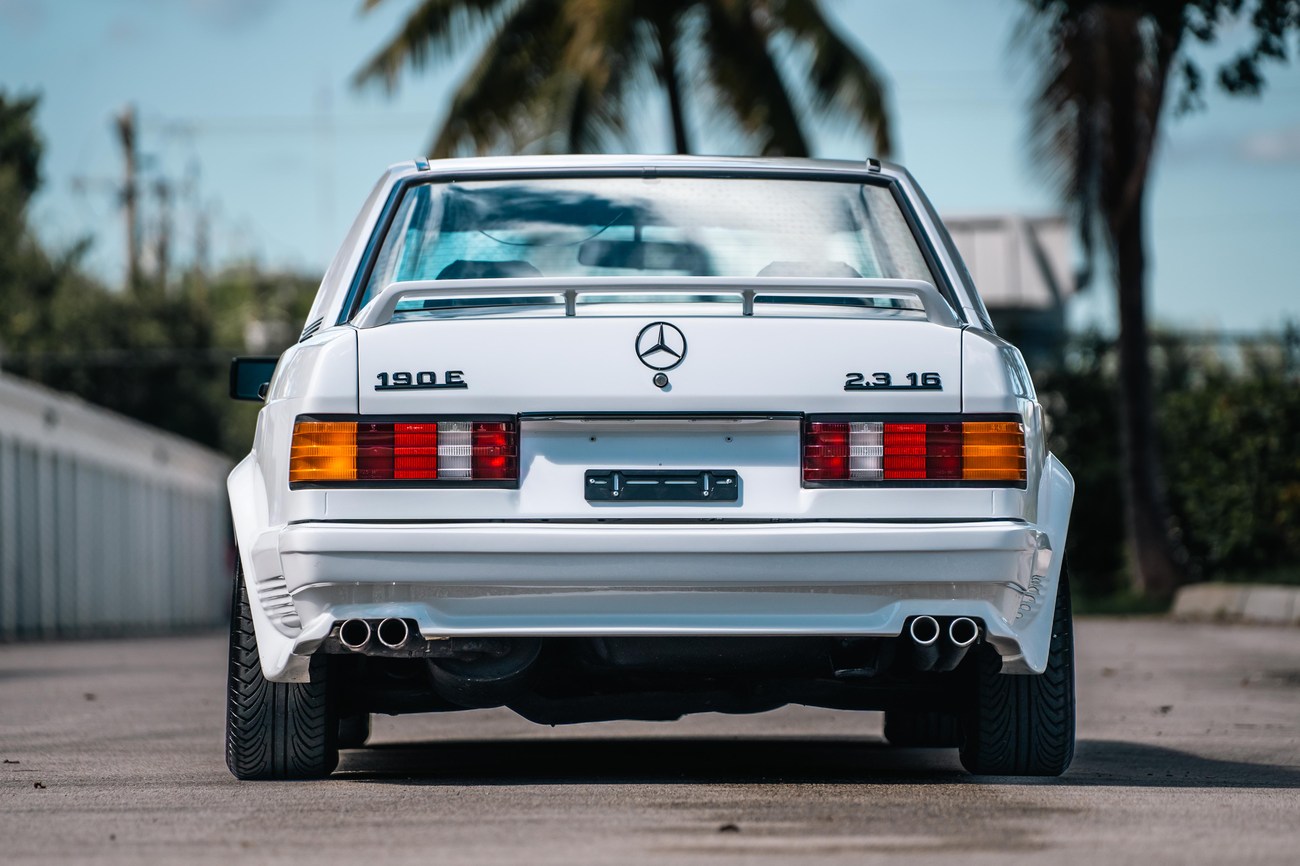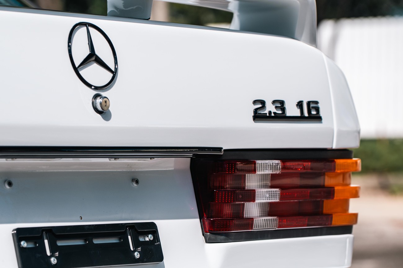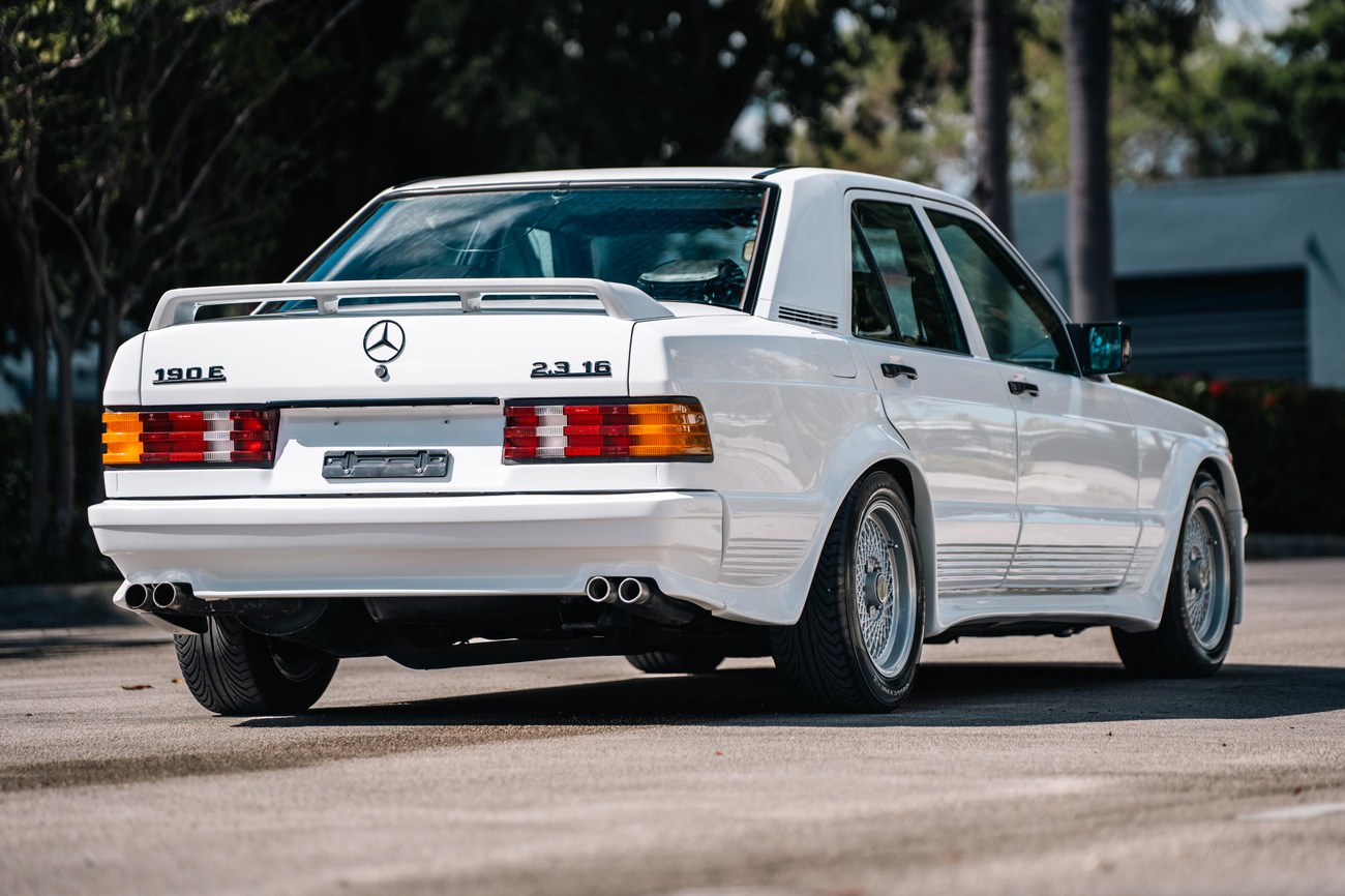 This 1985 Mercedes-Benz 190E 2.3-16v Cosworth was modified by Shulz Tuning in period and imported from Europe in 2023. Finished in Classic White (737) over Anthracite Leather (271), power is provided by a Cosworth-developed 2.3L 16v M102 I4 engine mated to a 5-speed manual transmission. Shulz was known for their coachwork widebody with flared fenders molded seamlessly into the bumpers and skirts, along with C126 SEC front end conversions. Other features include Rial mesh wheels with KBA part numbers, quad exhaust outlets, an Alpine stereo system, custom ATIWE steering wheel, Schulz Tuning speedometer, factory Recaro seats, additional woodgrain accents. An extensive service was performed in June 2025 totalling nearly $7k. Service included a new fuel filter and accumulator, oil service, brake fluid flush, brake master cylinder, shifter linkage bushings, A/C compressor w/clutch, receiver drier, expansion valve, blower motor, pressure switch, EHA actuator, clutch master cylinder, and heater control valve. This Cosworth 190E Schulz shows just over 81k kilometers (~50k miles) and is now offered out of the seller's private collection in Florida with Shulz Tuning catalog and a Florida title.