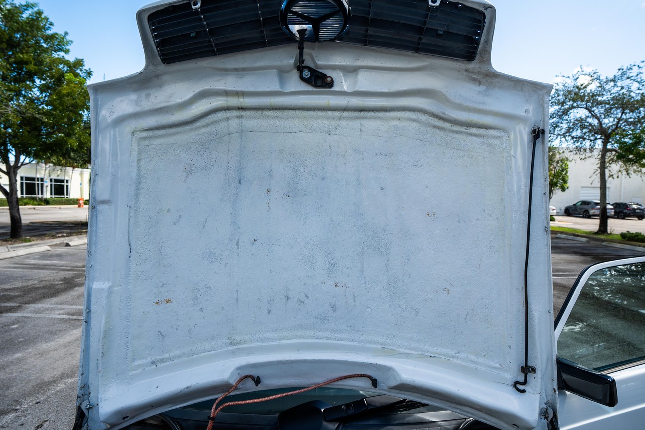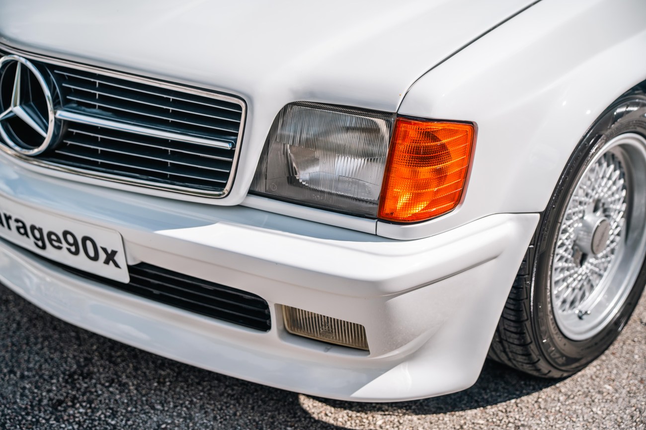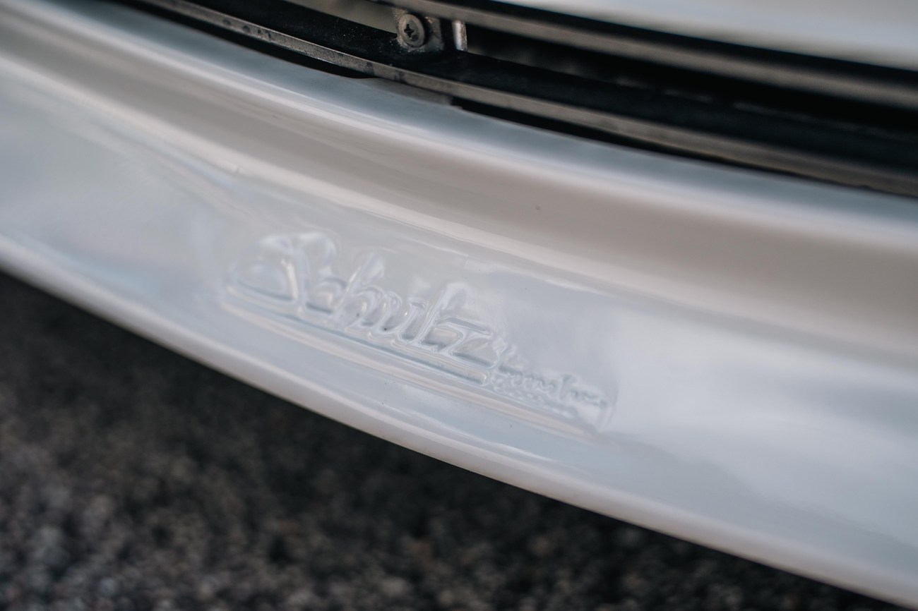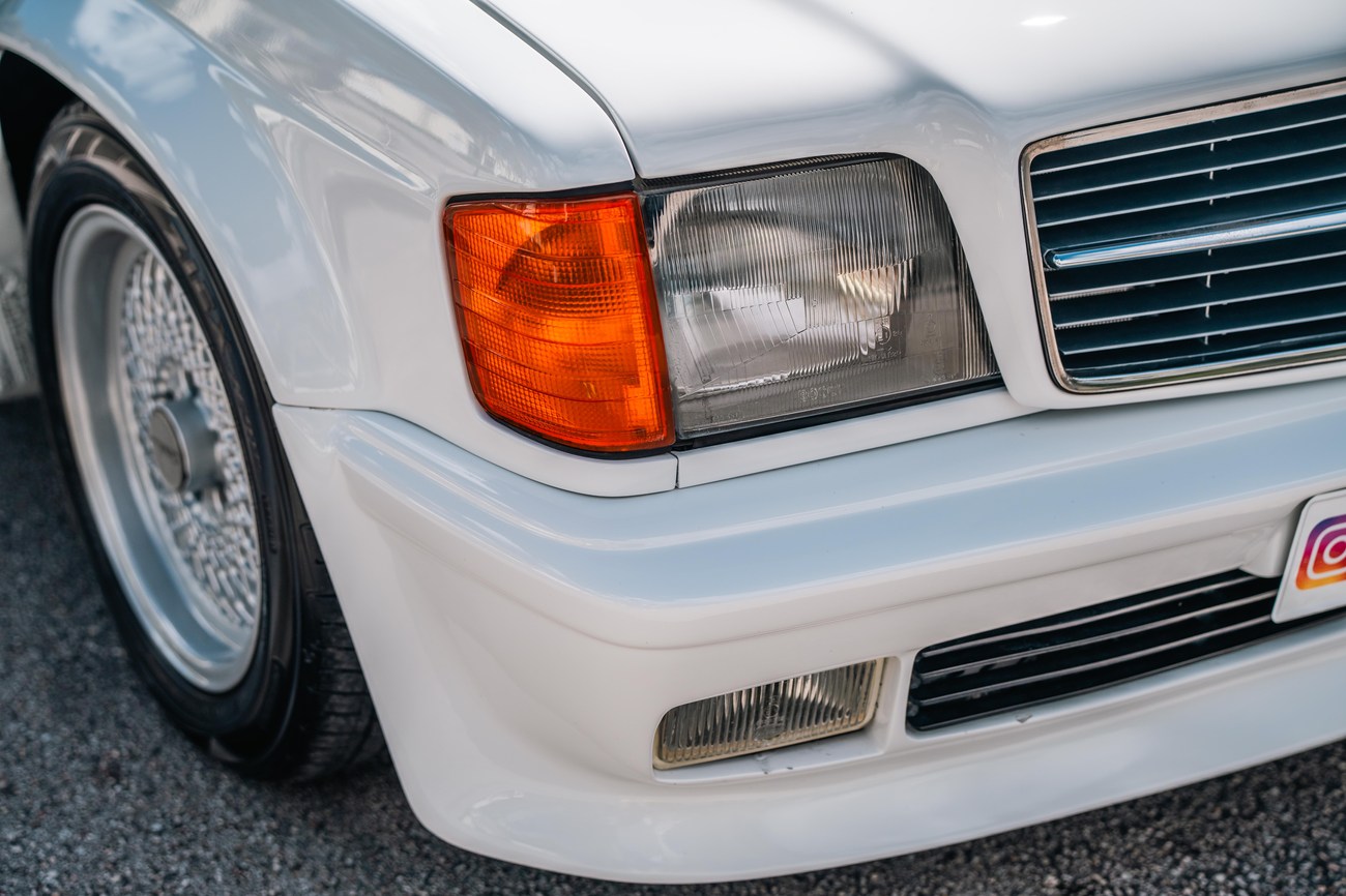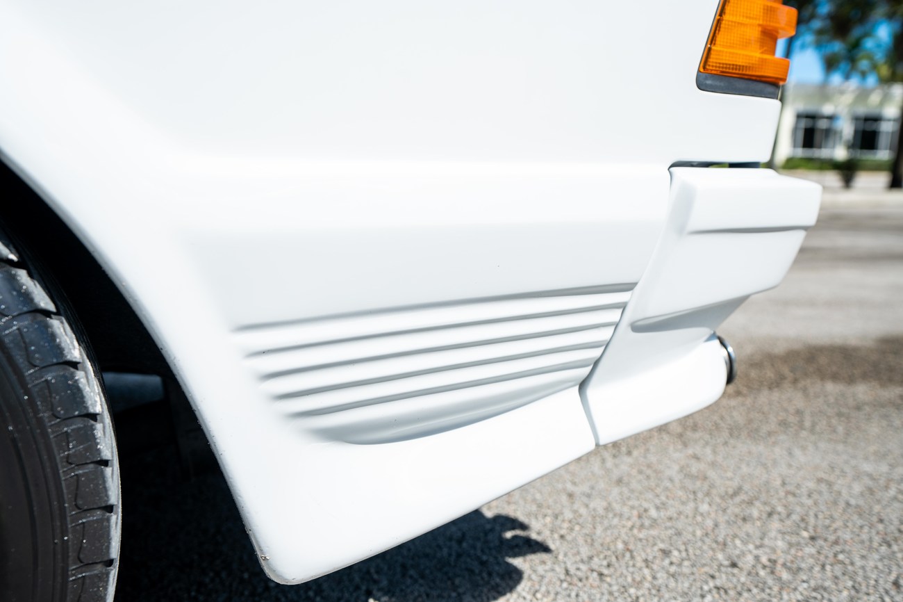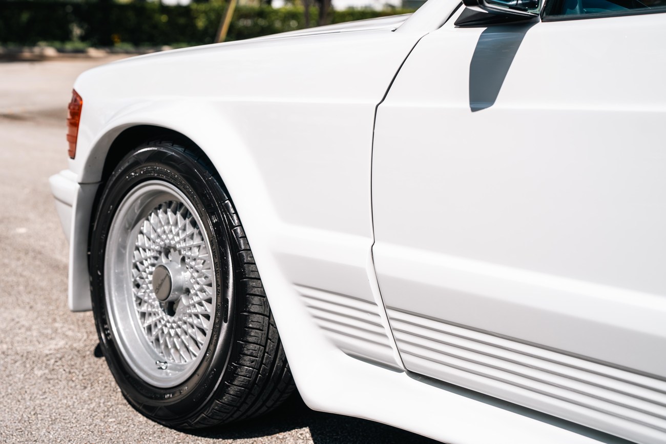 The exterior is finished in Classic White (737) with integrated Shulz widebody featuring flared fenders which are molded into extended side skirts and bumpers. The front end has been converted to a C126 SEC as part of the Shulz widebody as well. The car was reportedly upgraded in-period by Schulz Tuning led by Erich Schulz and his nineteen man team. Fog lights along with the glass Euro headlights and amber corner lenses adorn the front end. The rear is finished with a factory Cosworth spoiler and quad exhaust tips.