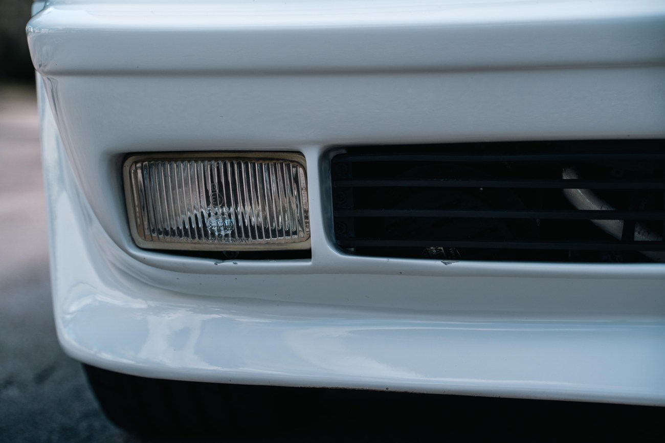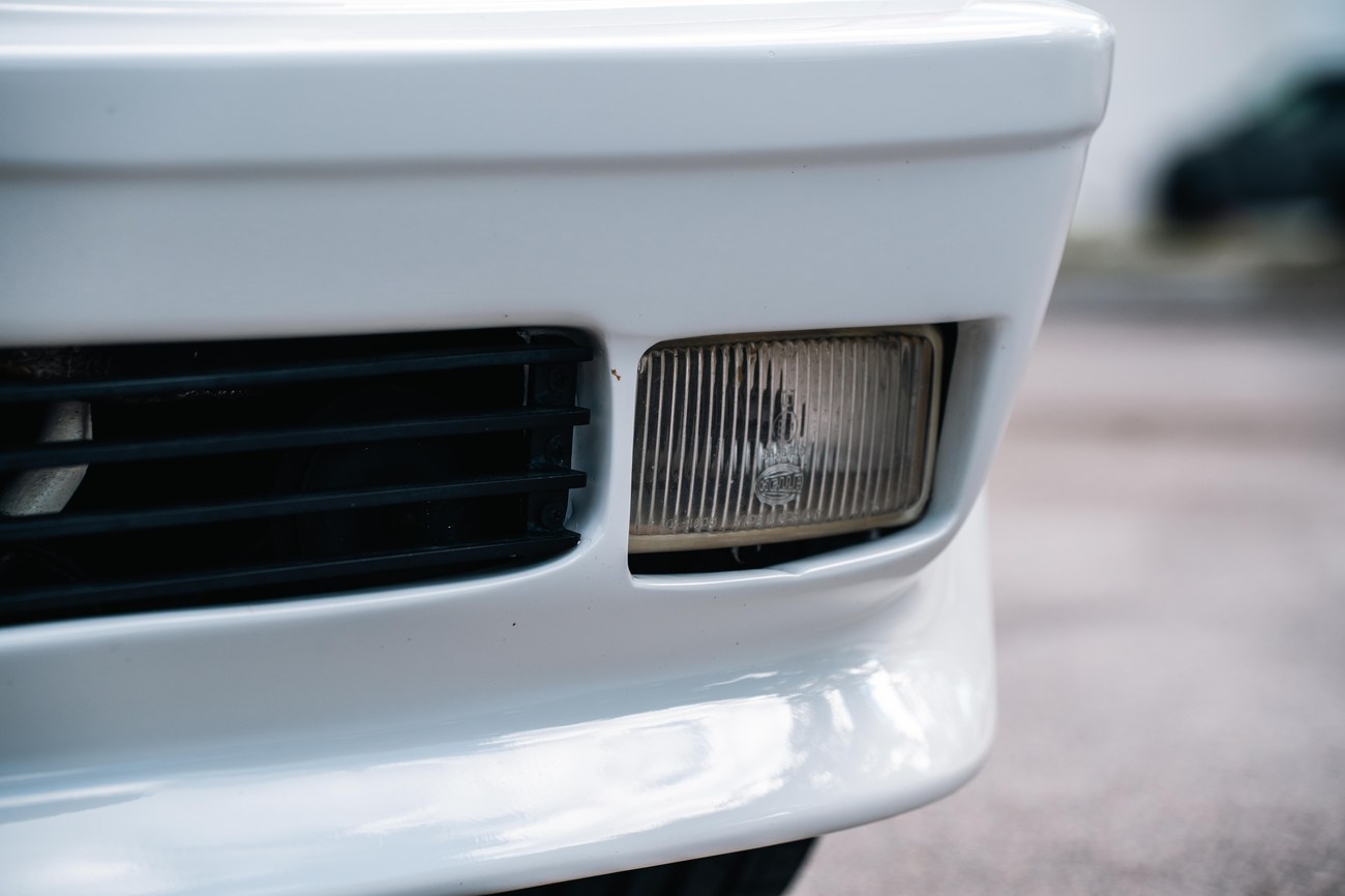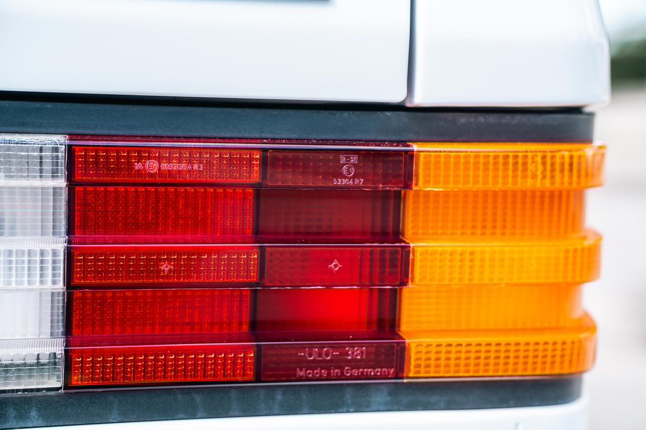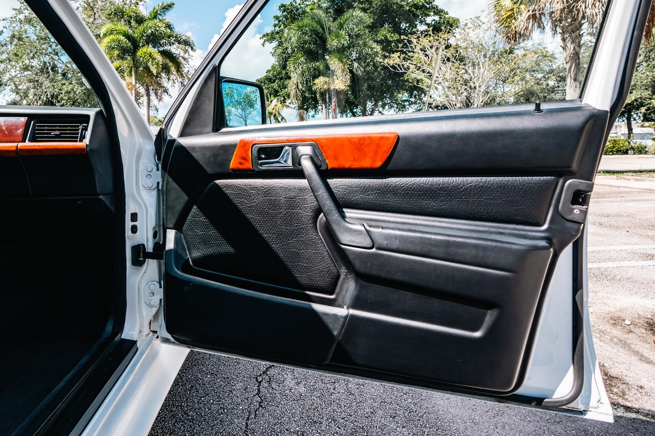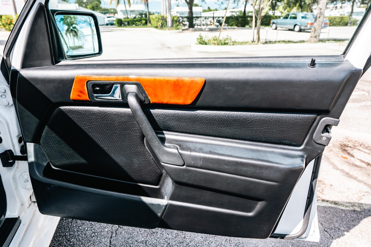 The exterior is finished in Classic White (737) with integrated Shulz widebody featuring flared fenders which are molded into extended side skirts and bumpers. The front end has been converted to a C126 SEC as part of the Shulz widebody as well. The car was reportedly upgraded in-period by Schulz Tuning led by Erich Schulz and his nineteen man team. Fog lights along with the glass Euro headlights and amber corner lenses adorn the front end. The rear is finished with a factory Cosworth spoiler and quad exhaust tips.