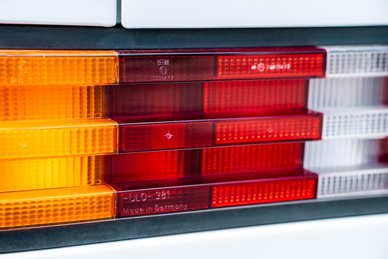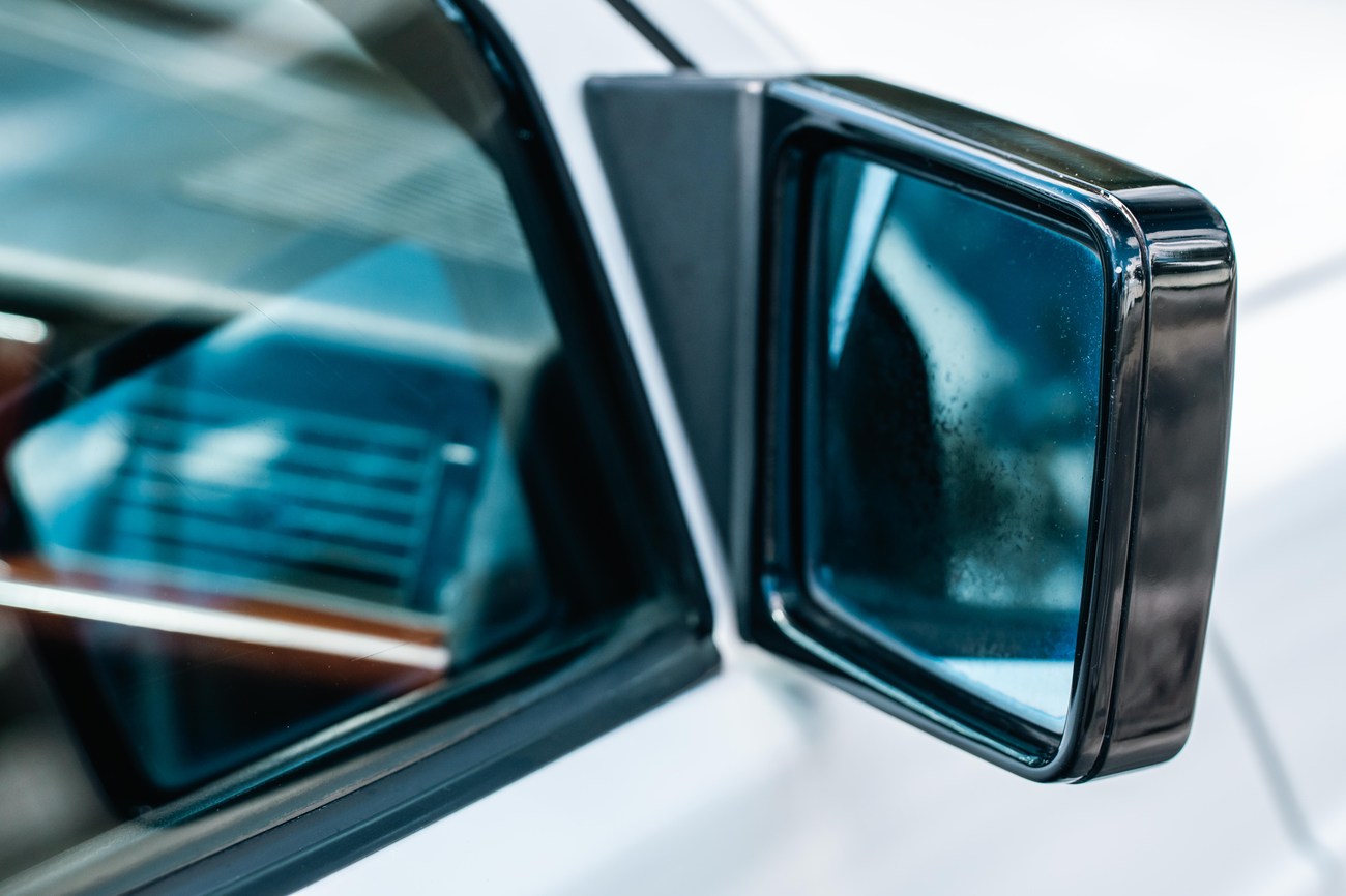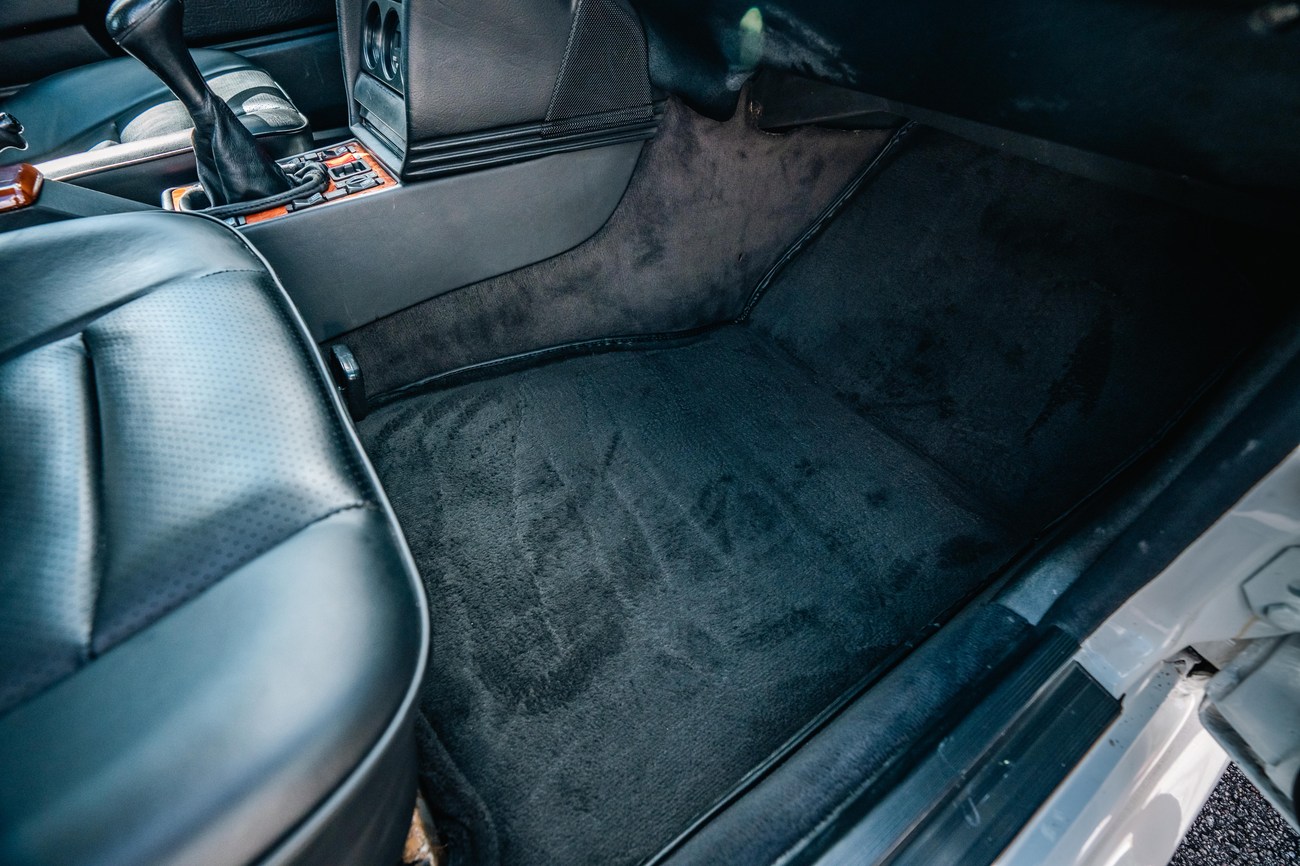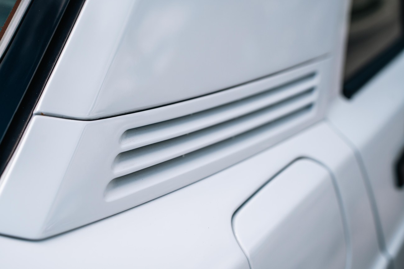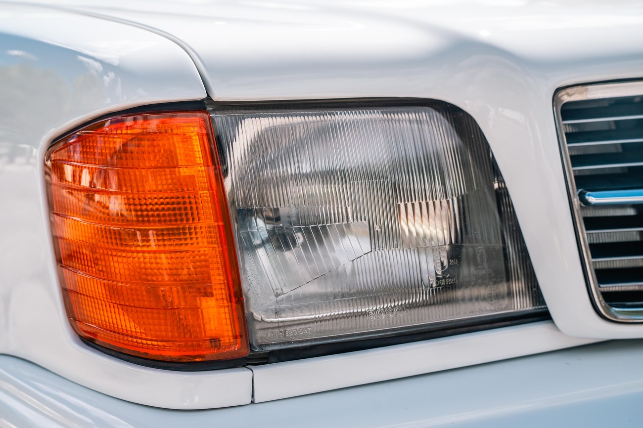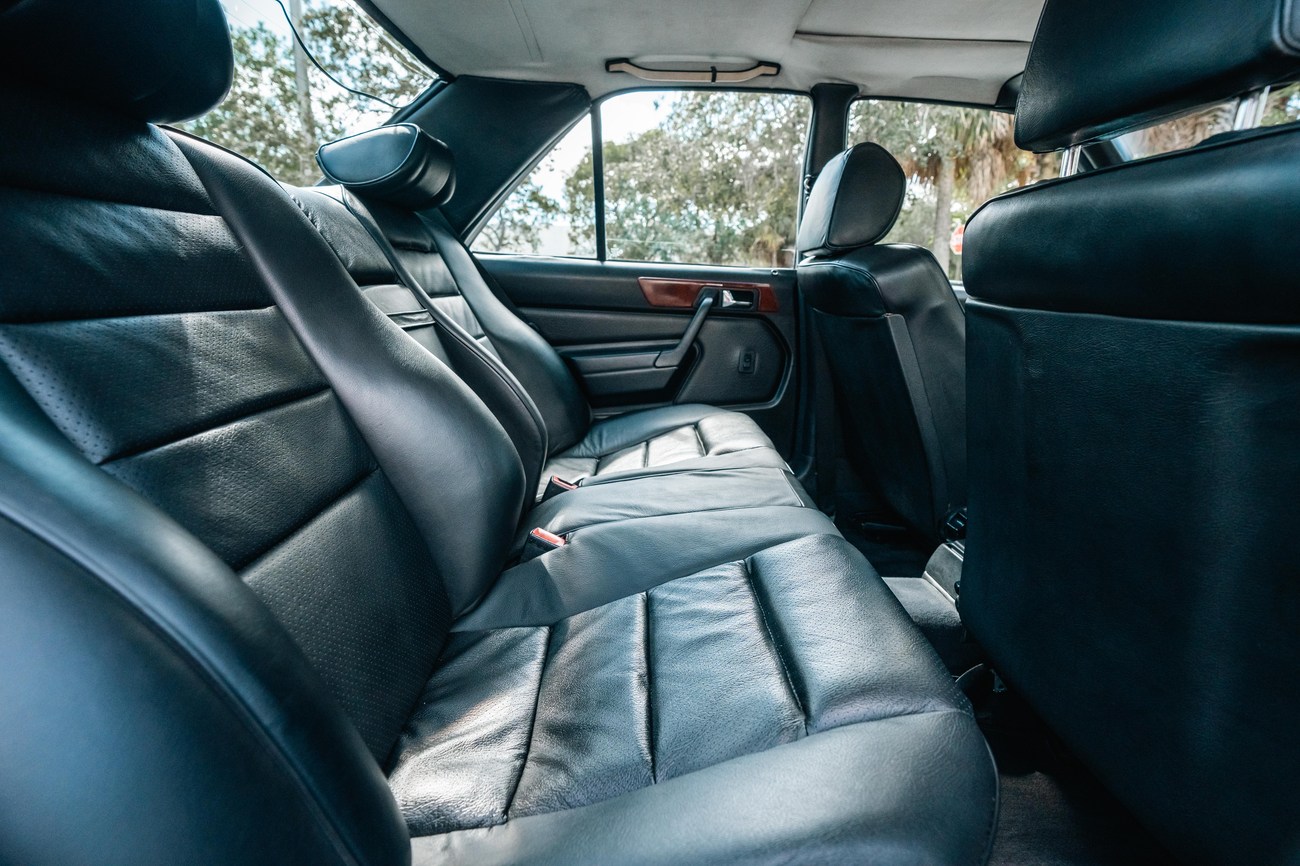 The exterior is finished in Classic White (737) with integrated Shulz widebody featuring flared fenders which are molded into extended side skirts and bumpers. The front end has been converted to a C126 SEC as part of the Shulz widebody as well. The car was reportedly upgraded in-period by Schulz Tuning led by Erich Schulz and his nineteen man team. Fog lights along with the glass Euro headlights and amber corner lenses adorn the front end. The rear is finished with a factory Cosworth spoiler and quad exhaust tips.