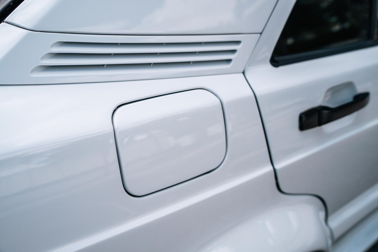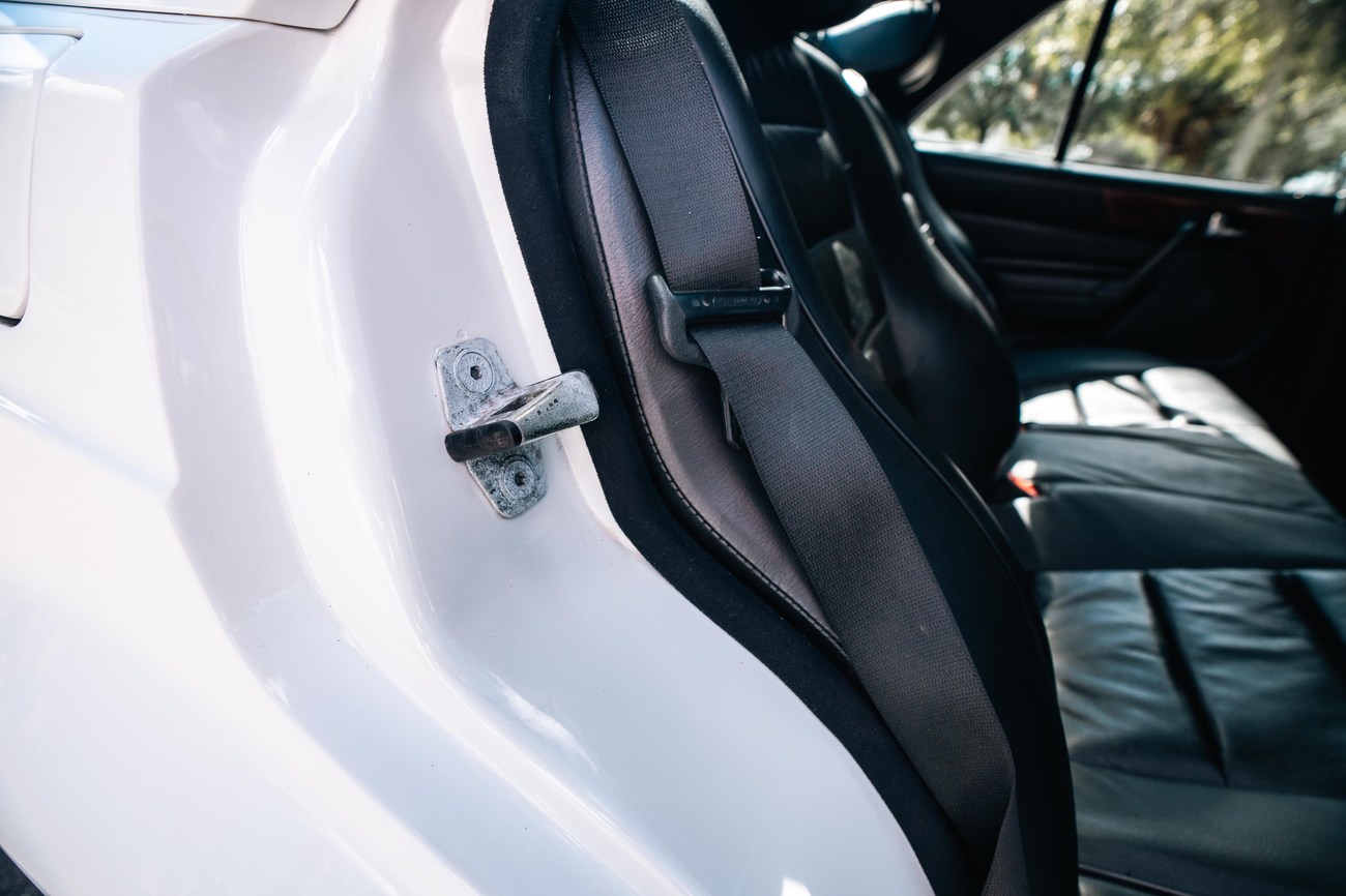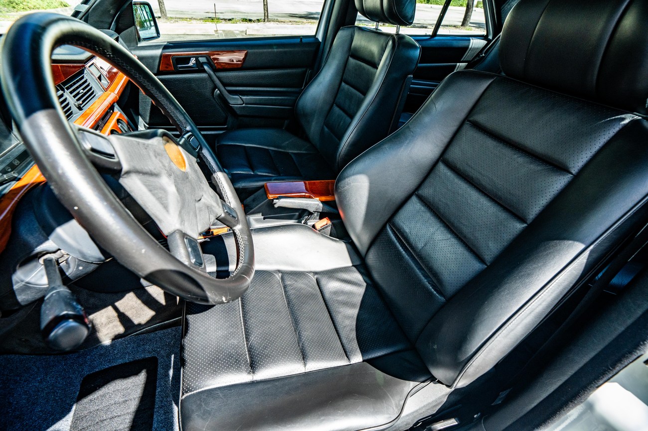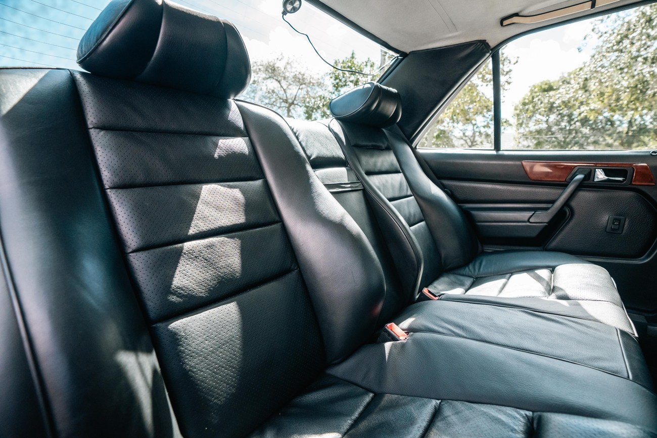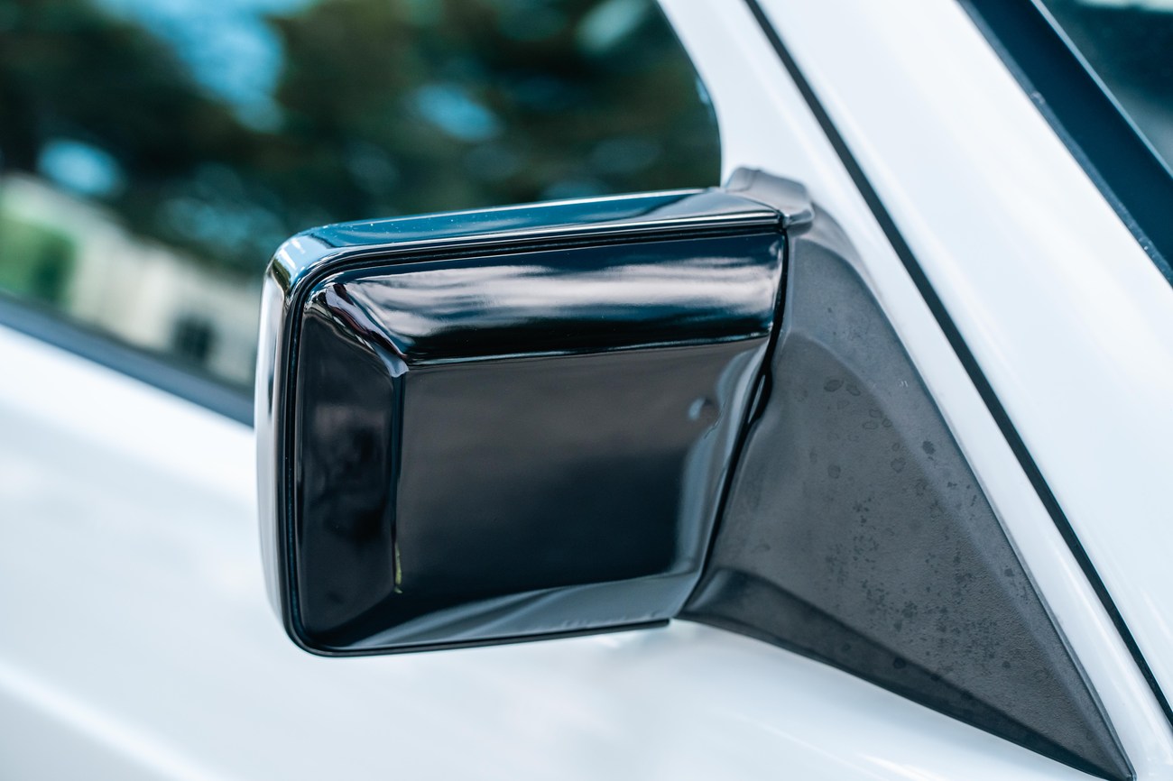 The exterior is finished in Classic White (737) with integrated Shulz widebody featuring flared fenders which are molded into extended side skirts and bumpers. The front end has been converted to a C126 SEC as part of the Shulz widebody as well. The car was reportedly upgraded in-period by Schulz Tuning led by Erich Schulz and his nineteen man team. Fog lights along with the glass Euro headlights and amber corner lenses adorn the front end. The rear is finished with a factory Cosworth spoiler and quad exhaust tips.