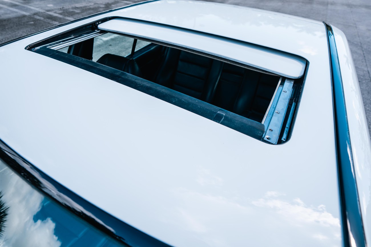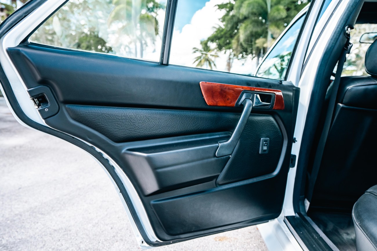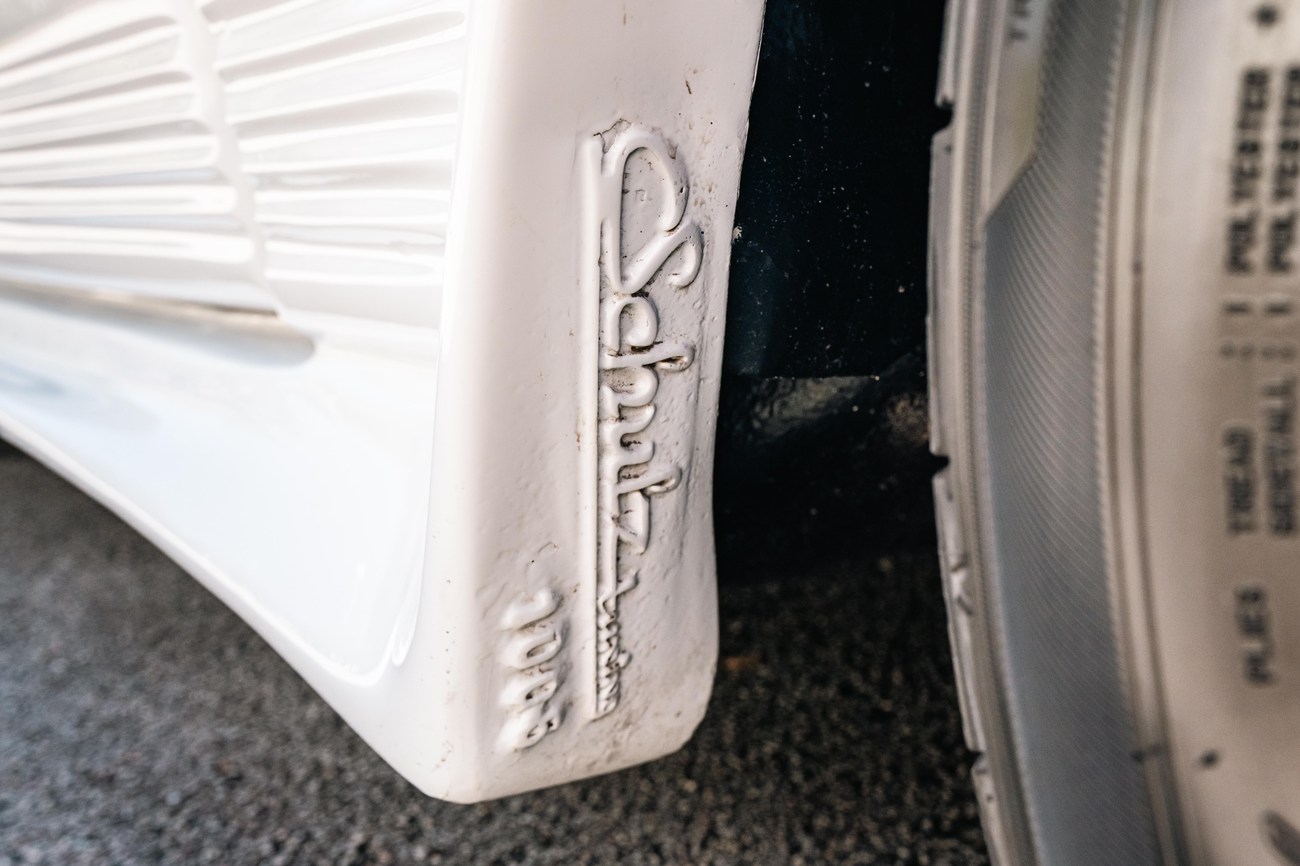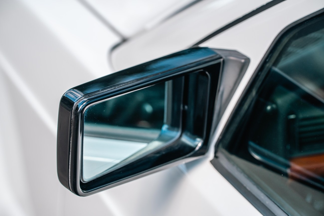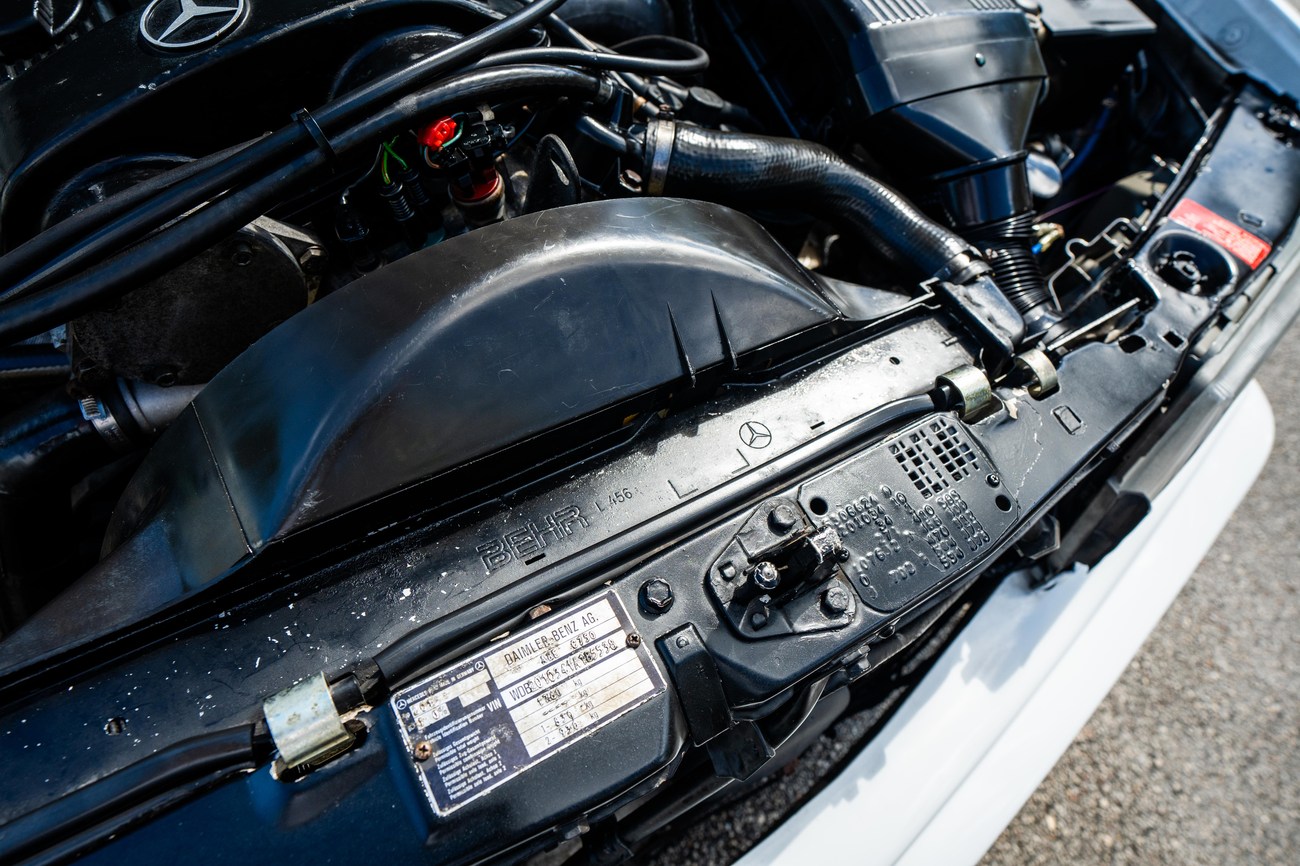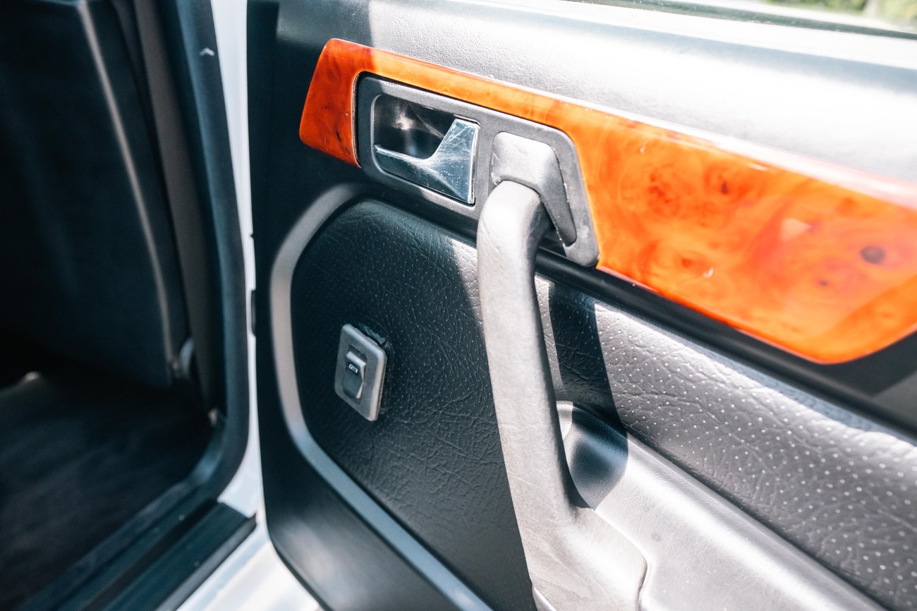 The exterior is finished in Classic White (737) with integrated Shulz widebody featuring flared fenders which are molded into extended side skirts and bumpers. The front end has been converted to a C126 SEC as part of the Shulz widebody as well. The car was reportedly upgraded in-period by Schulz Tuning led by Erich Schulz and his nineteen man team. Fog lights along with the glass Euro headlights and amber corner lenses adorn the front end. The rear is finished with a factory Cosworth spoiler and quad exhaust tips.