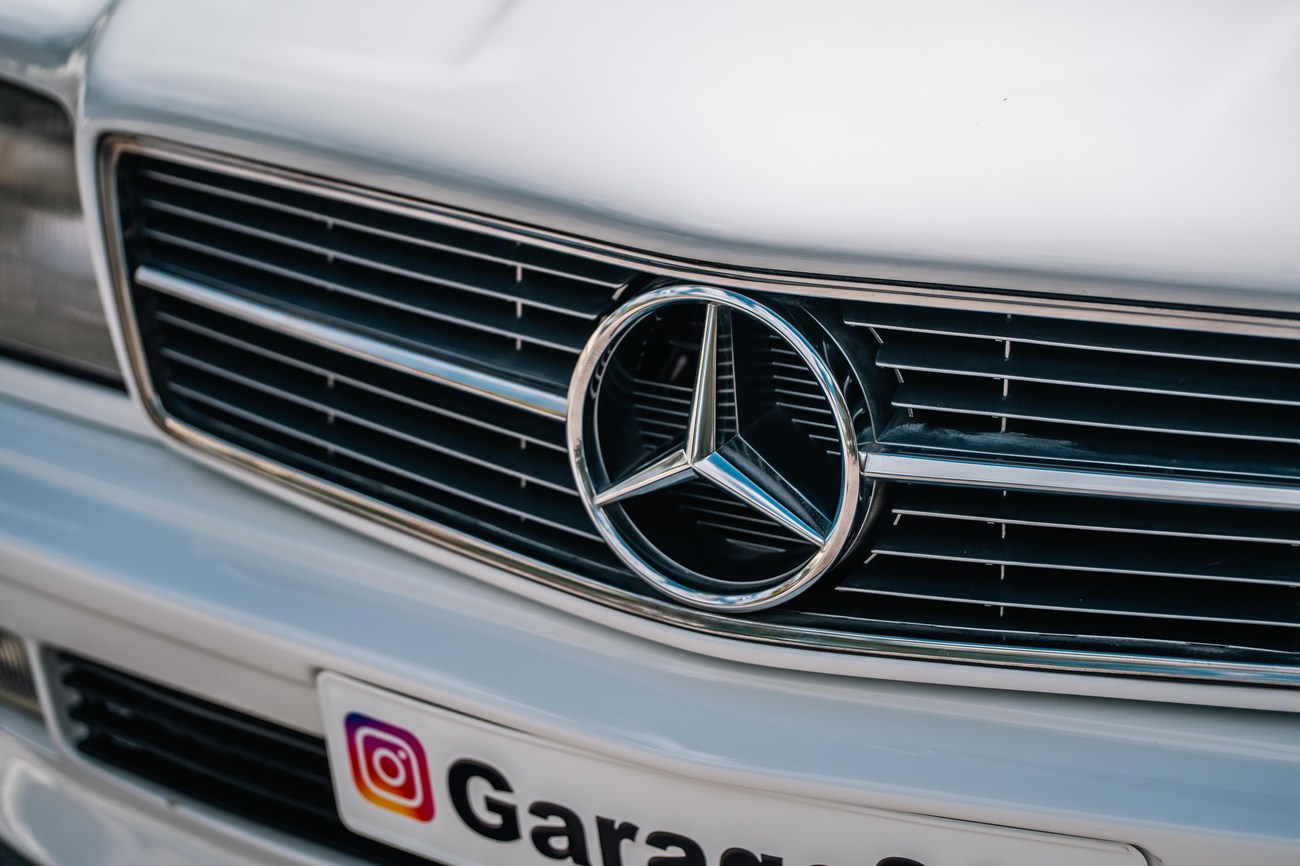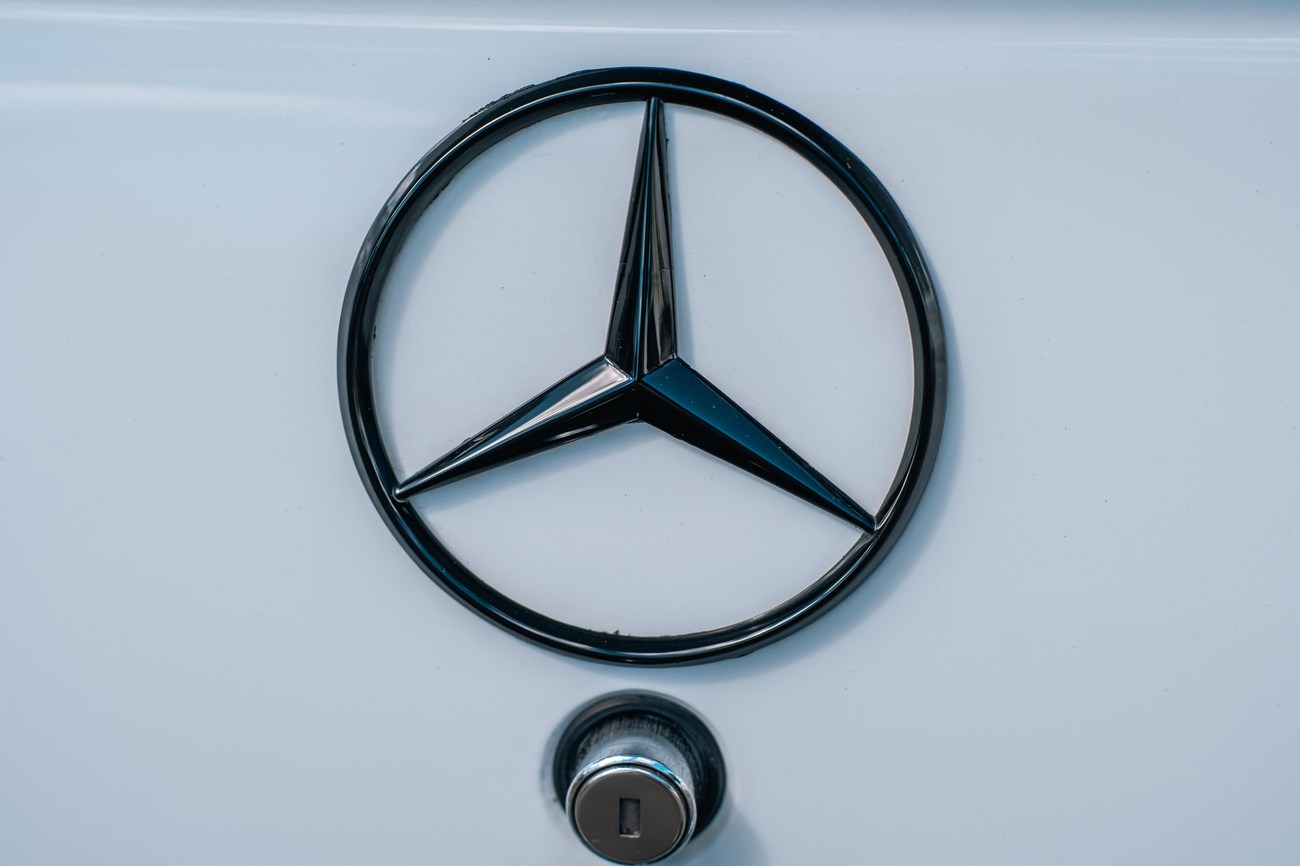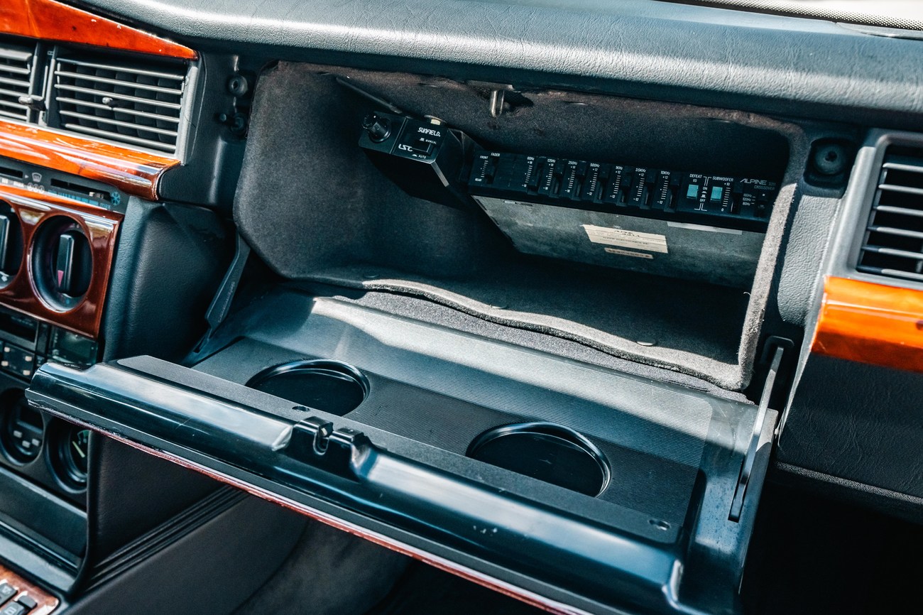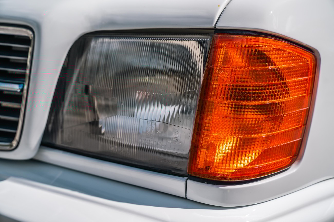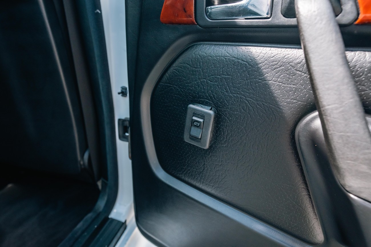 The exterior is finished in Classic White (737) with integrated Shulz widebody featuring flared fenders which are molded into extended side skirts and bumpers. The front end has been converted to a C126 SEC as part of the Shulz widebody as well. The car was reportedly upgraded in-period by Schulz Tuning led by Erich Schulz and his nineteen man team. Fog lights along with the glass Euro headlights and amber corner lenses adorn the front end. The rear is finished with a factory Cosworth spoiler and quad exhaust tips.