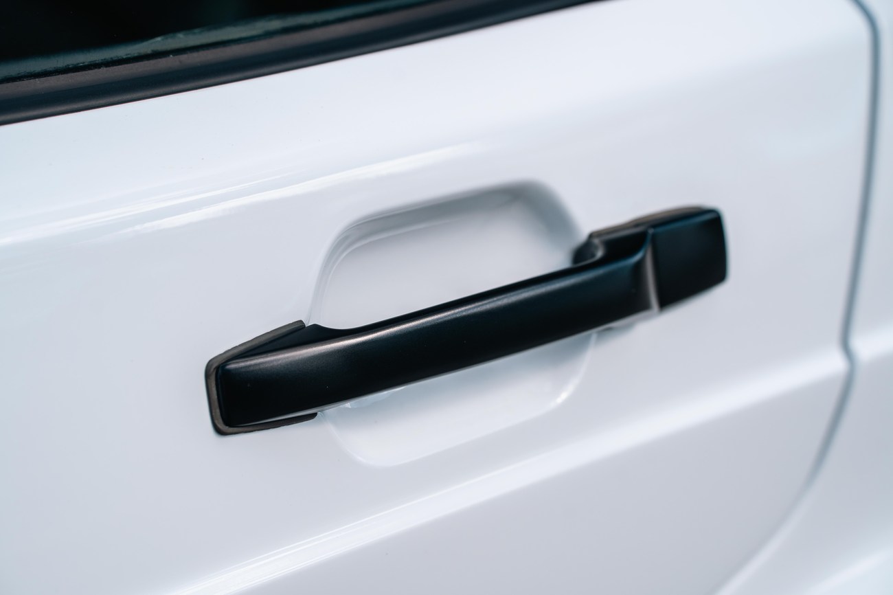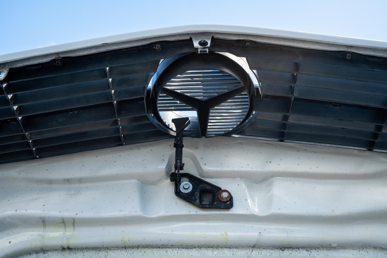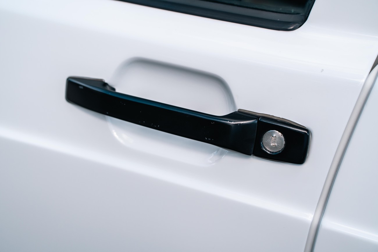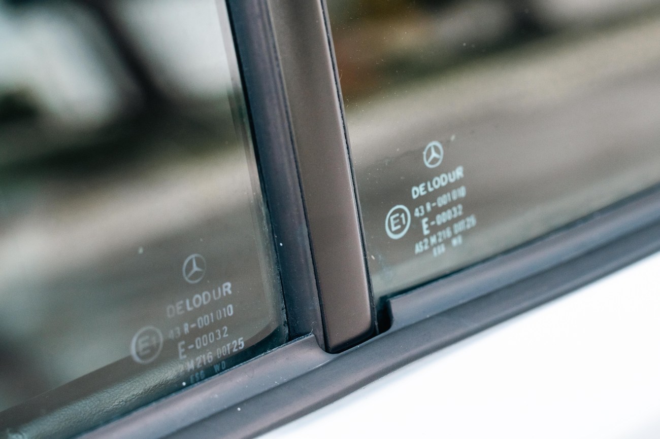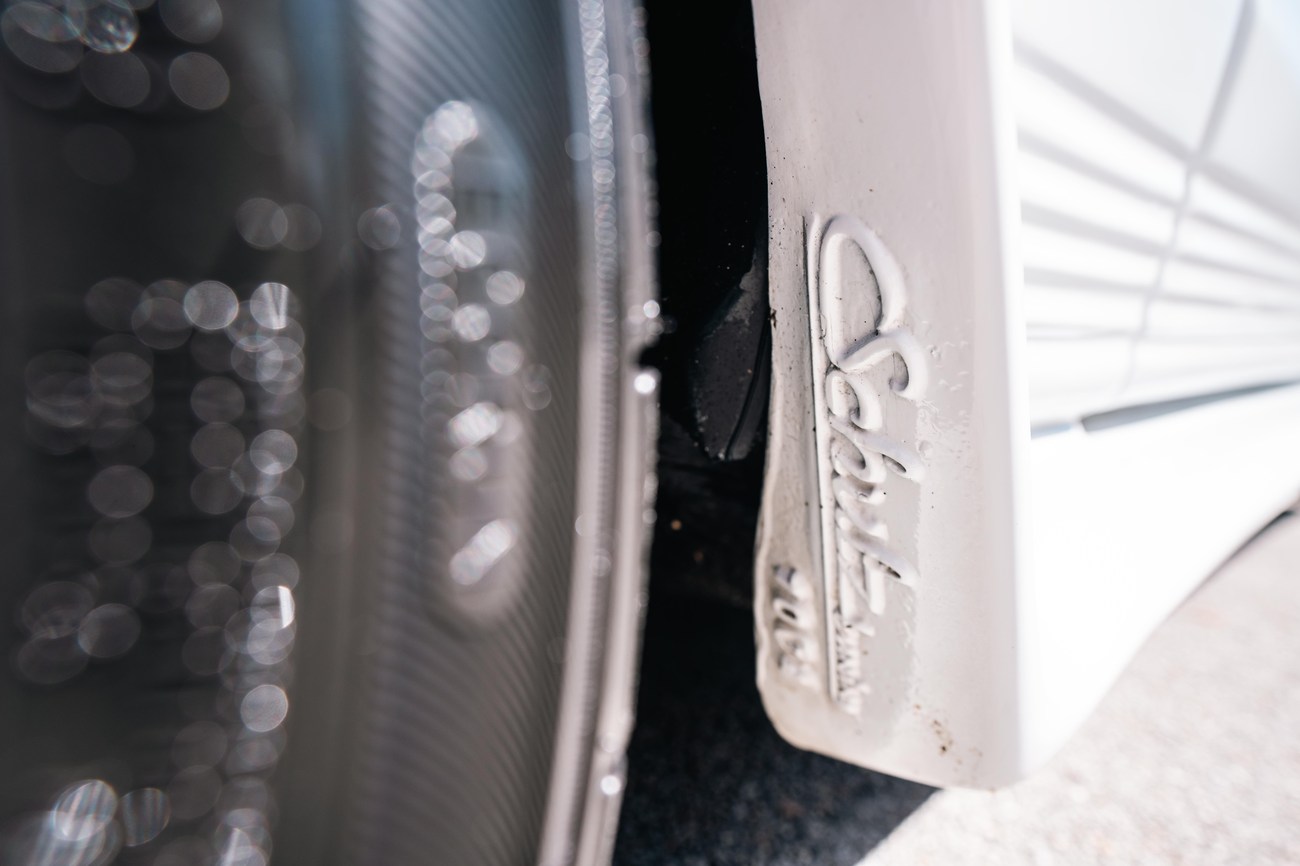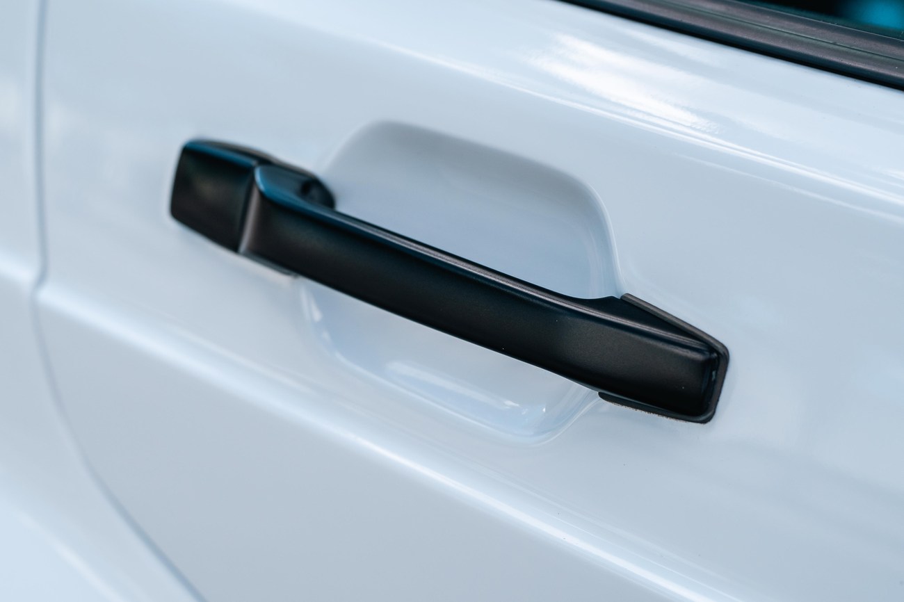 The exterior is finished in Classic White (737) with integrated Shulz widebody featuring flared fenders which are molded into extended side skirts and bumpers. The front end has been converted to a C126 SEC as part of the Shulz widebody as well. The car was reportedly upgraded in-period by Schulz Tuning led by Erich Schulz and his nineteen man team. Fog lights along with the glass Euro headlights and amber corner lenses adorn the front end. The rear is finished with a factory Cosworth spoiler and quad exhaust tips.