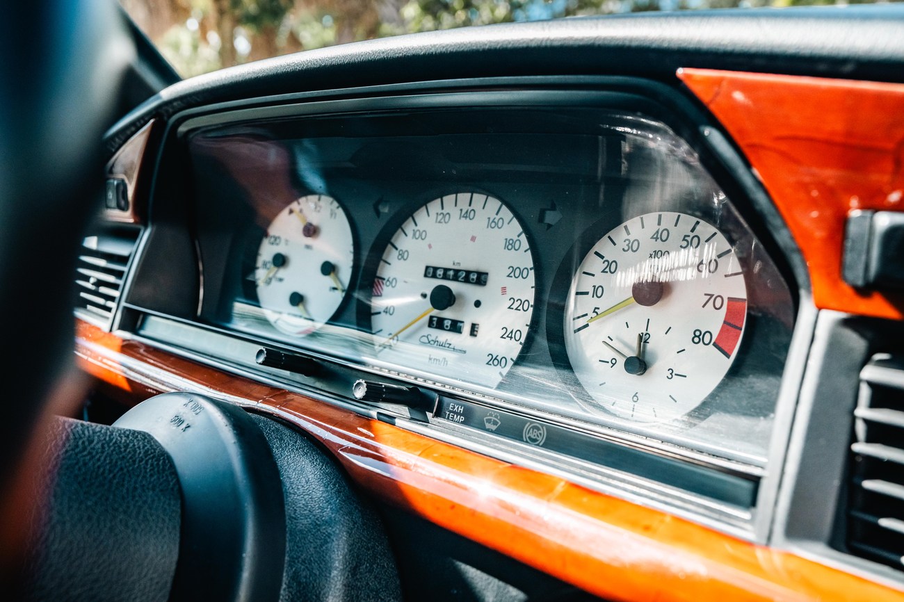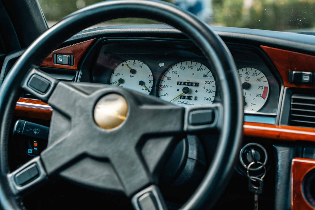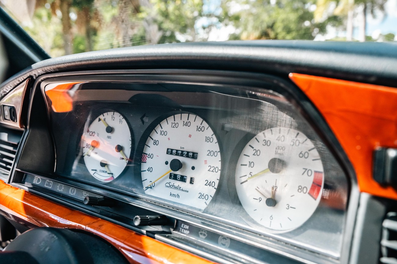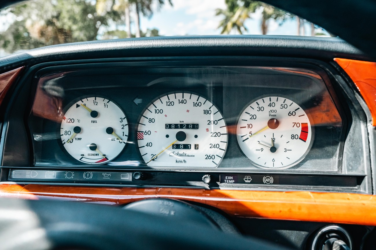 The four-spoke custom leather wrapped ATIWE steering wheel features a Shulz Tuning logo at the center and frames analog instrumentation including a Schulz Tuning 260-kph speedometer, an 8k-rpm tachometer, an analog clock and gauges for fuel level, instant fuel economy, coolant temperature, and oil pressure. A digital outside temperature sensor can be found mounted below. The six-digit odometer shows just over 81k original kilometers (~50k miles).