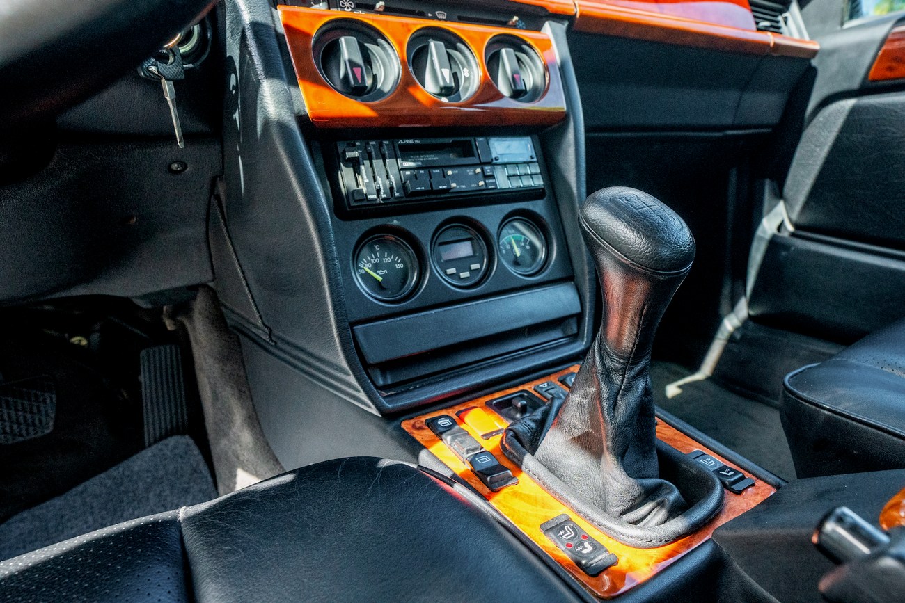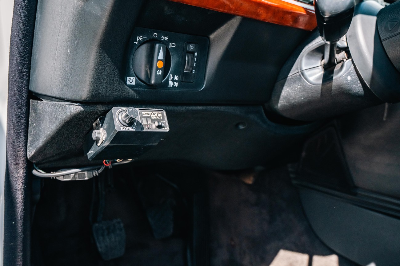 The cabin is finished in Anthracite Leather (271) with matching doorcards and carpets. The factory Recaro seats are heated in the front and present in excellent condition. Zebrano wood trim is factory with additional wood accents added by Shulz across the dash and a wooden center storage box. Some cracks are noted in the wood veneers and the rear driver side door card needs adjustment. Interior features also include an Alpine stereo system with additional audio controls mounted in the glove box, power windows, a vacuum-powered adjustable headlight switch, and additional gauges for oil temperature and battery volatge along with a lap timer.