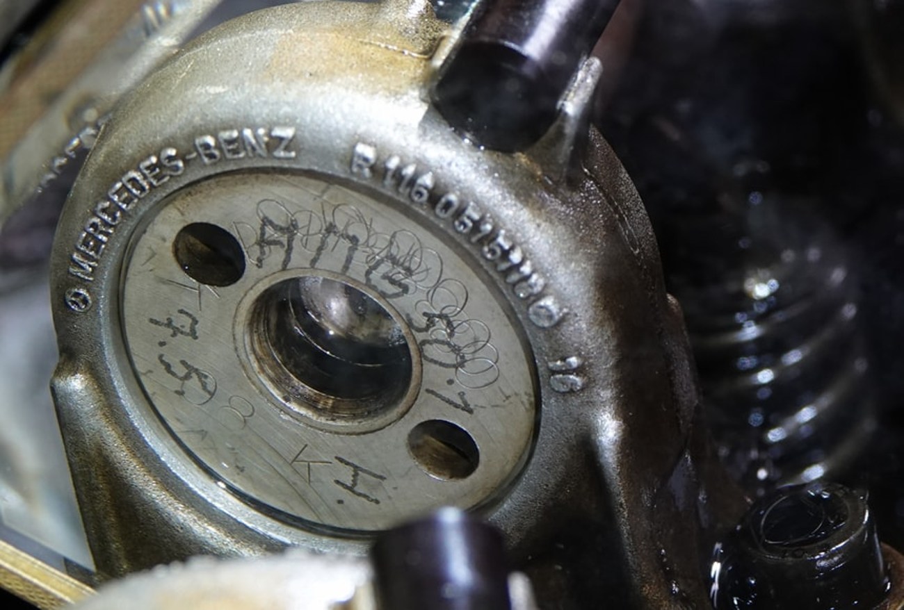 The 5.4 M117 offering from AMG was the largest engine available at the time and predated the later 6.0 version beginning in 1986. The AMG 5.4 engines were offered in various stages of performance depending on your budget, with AMG sale documentation at the time stating 310 bhp, 0–60 in 6.7 seconds and a top speed of 155 mph. This 500SEC AMG features a bored SOHC 5.4-liter MIl7 with performance head work, camshafts, extractors, dual air inlet and tuning putting it on the higher end of the performance 5.4 offerings. An acceleration chart pictured in the gallery shows the car still matches the AMG pre-merger performance figures. Additional photos provided show AMG engravings on the engine block and camshafts. Power is sent to the rear wheels via a four-speed automatic transmission with LSD (Limited-Slip Differential). Previous underbody photos show the 2.24 stamped rear end with LSD along with white AMG springs and AMG-labeled Bilstein shocks.