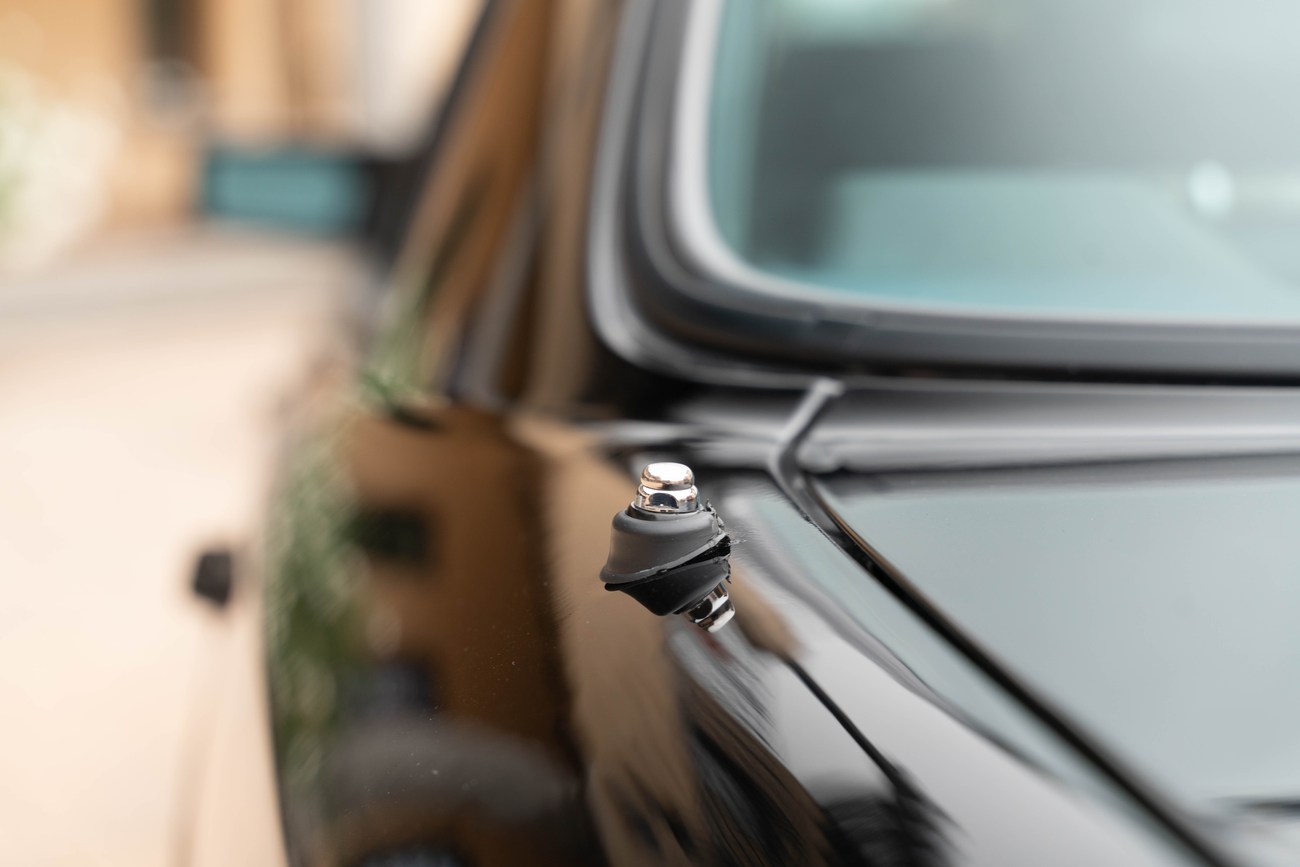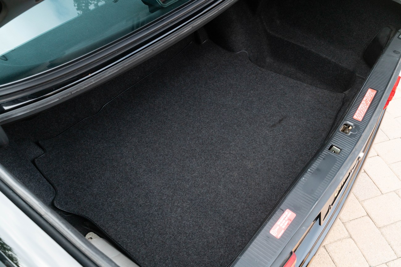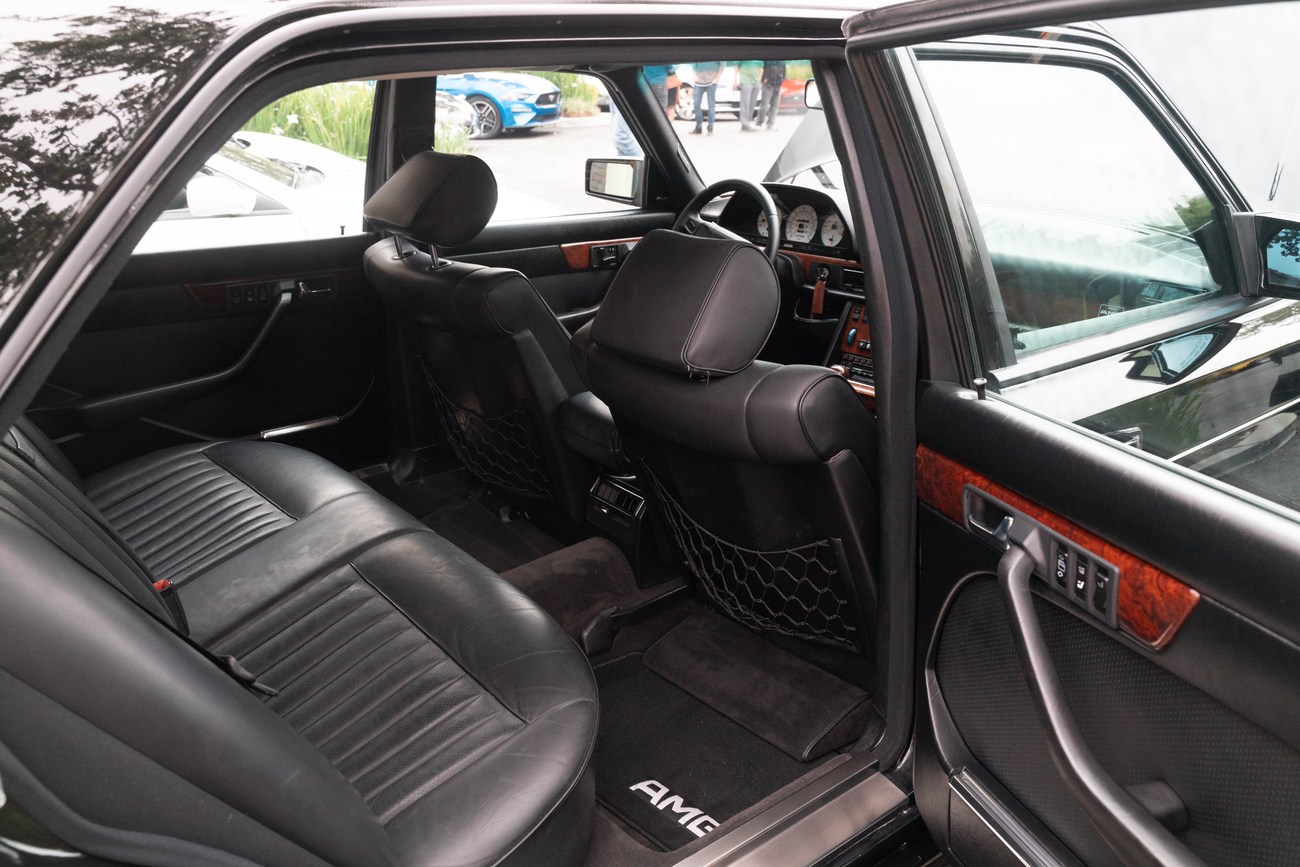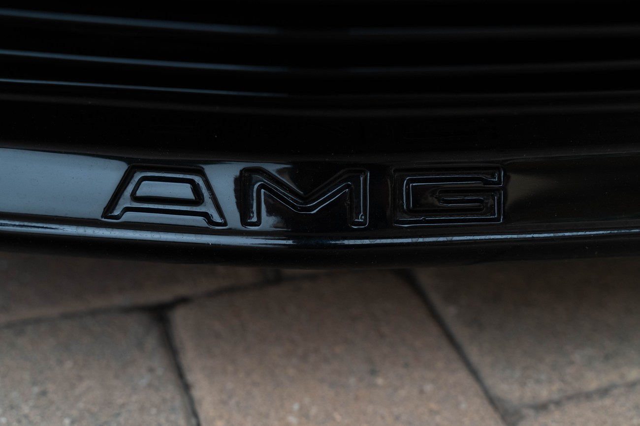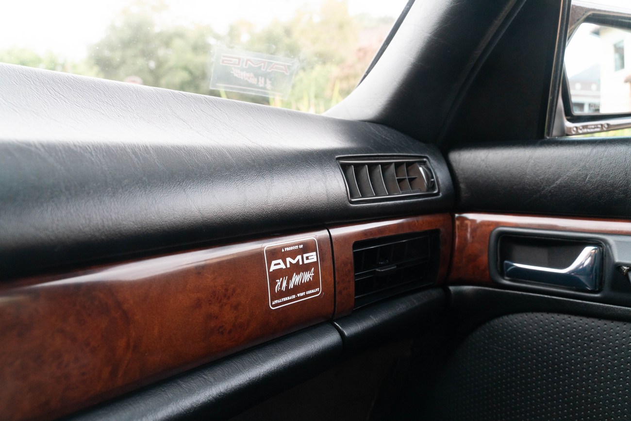 The body is finished in Black (040) and features a full AMG-style body kit by CMS. The body kit was installed earlier this year and painted to match the car along with all lower cladding, grille, and chrome trim. The car is equipped with a sliding steel sunroof, headlight wipers, lower front fog lights, European headlights, and dual exhaust tips at the rear. A period-correct AMG badge is fitted to the trunk lid and all paint is reported to be in excellent condition with detailed photos in the gallery.