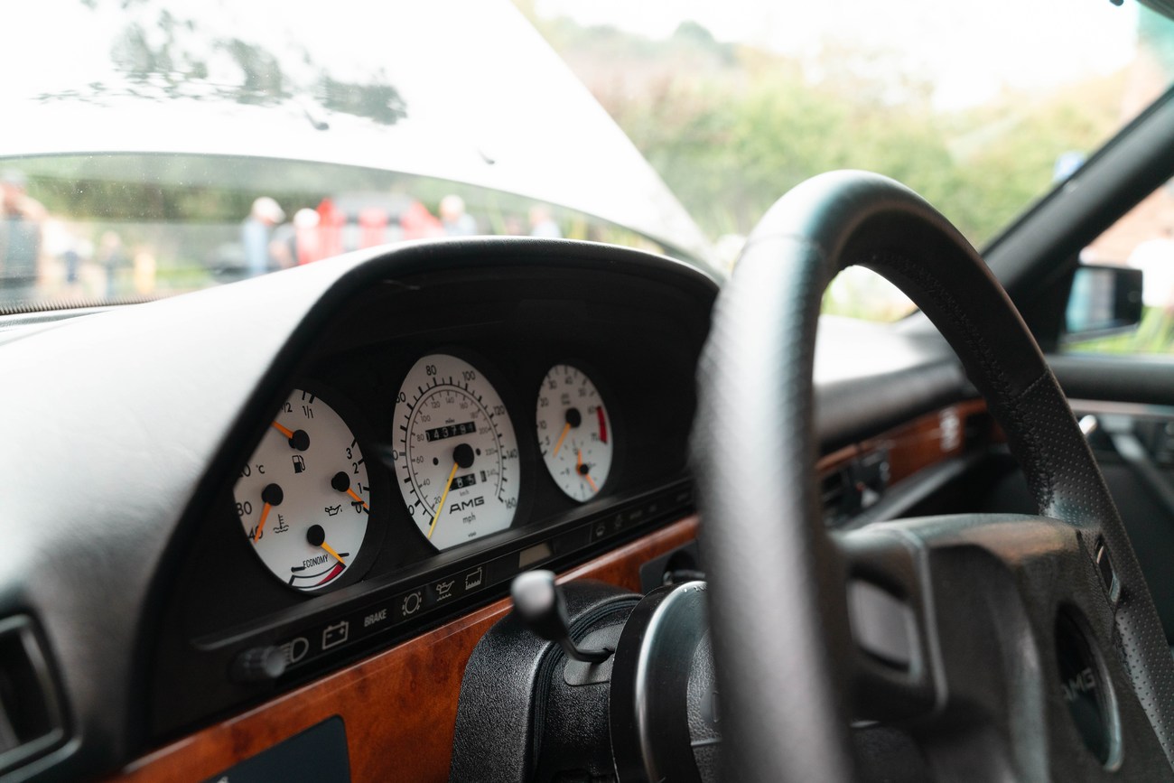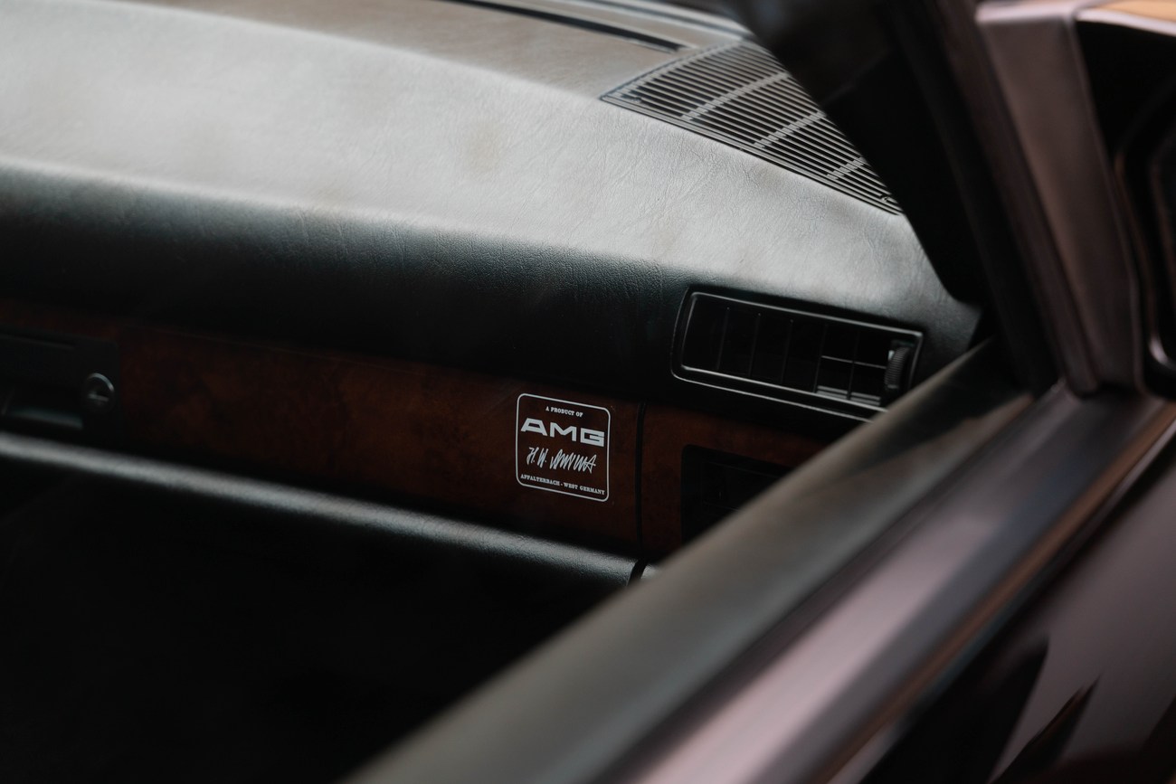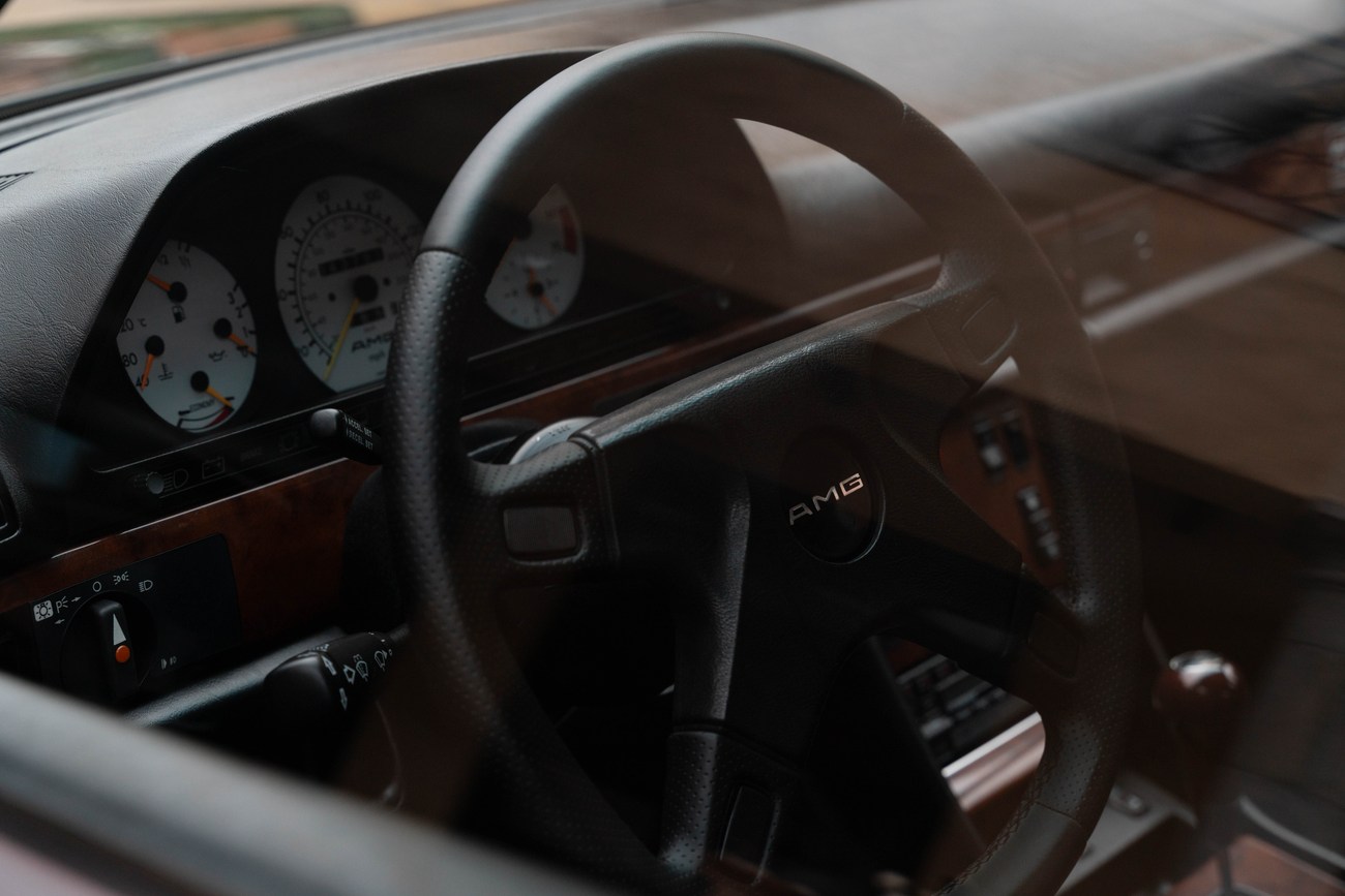 A leather-wrapped Atiwe steering wheel features the premerger AMG logo at the center and has been recently recovered. Custom white-faced gauge overlays made from metal show the premerger AMG logo on the speedometer. Readouts include a 160-mph speedometer and a 7k-rpm tachometer with an integrated analog clock along. Additional gauges display fuel level, oil pressure, coolant temperature, and instant economy. The six-digit mechanical odometer indicates approximately 44k original miles.