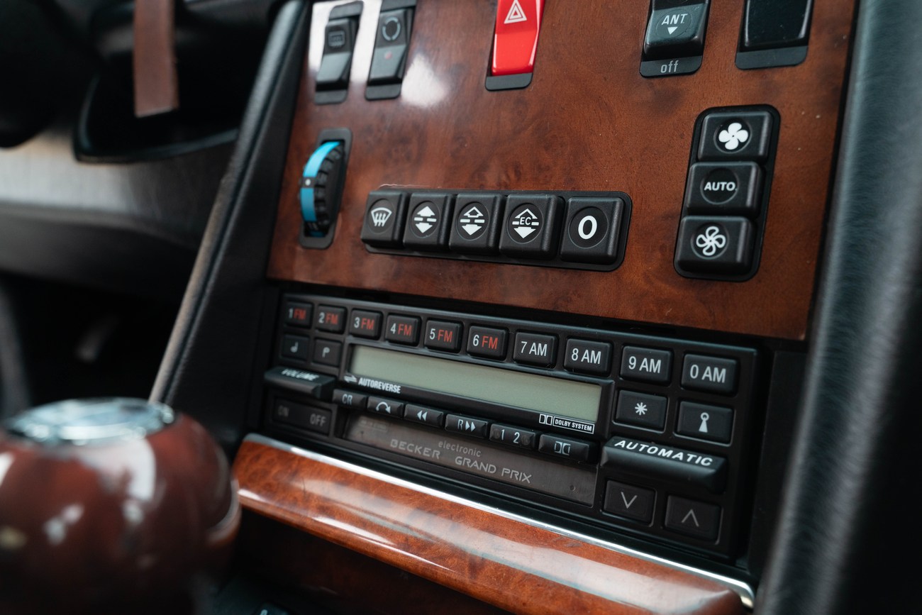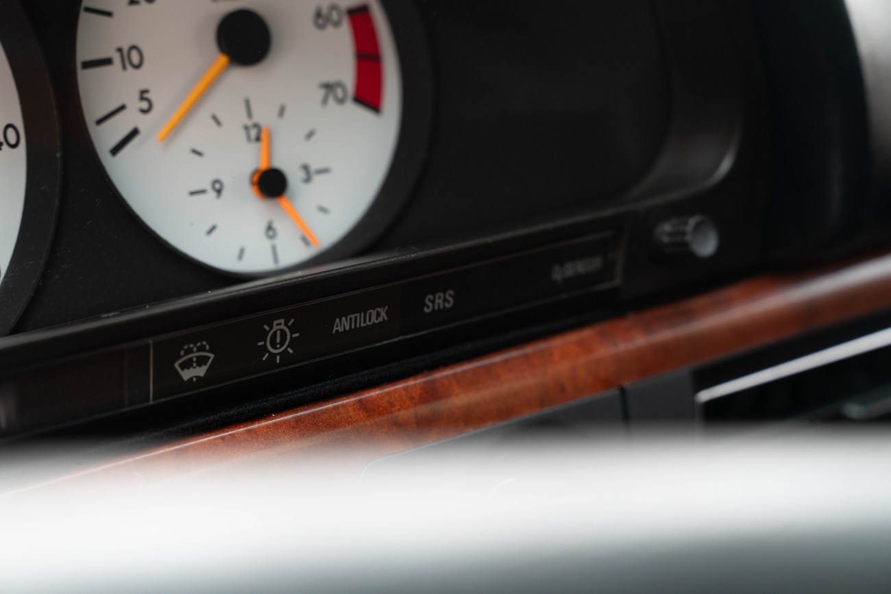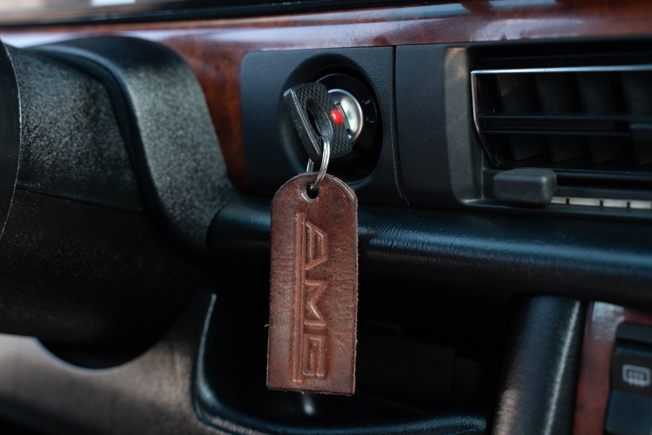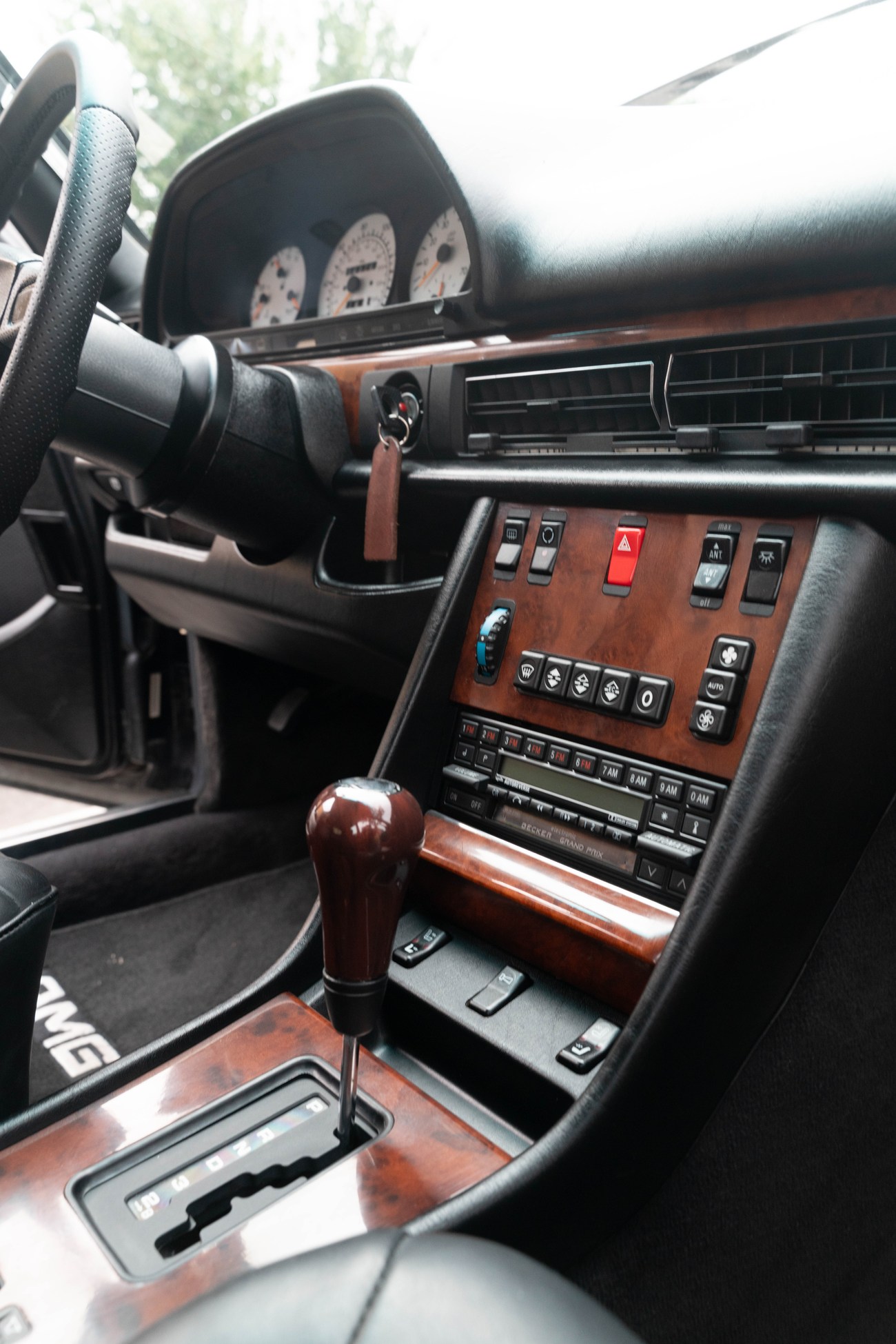 A leather-wrapped Atiwe steering wheel features the premerger AMG logo at the center and has been recently recovered. Custom white-faced gauge overlays made from metal show the premerger AMG logo on the speedometer. Readouts include a 160-mph speedometer and a 7k-rpm tachometer with an integrated analog clock along. Additional gauges display fuel level, oil pressure, coolant temperature, and instant economy. The six-digit mechanical odometer indicates approximately 44k original miles.