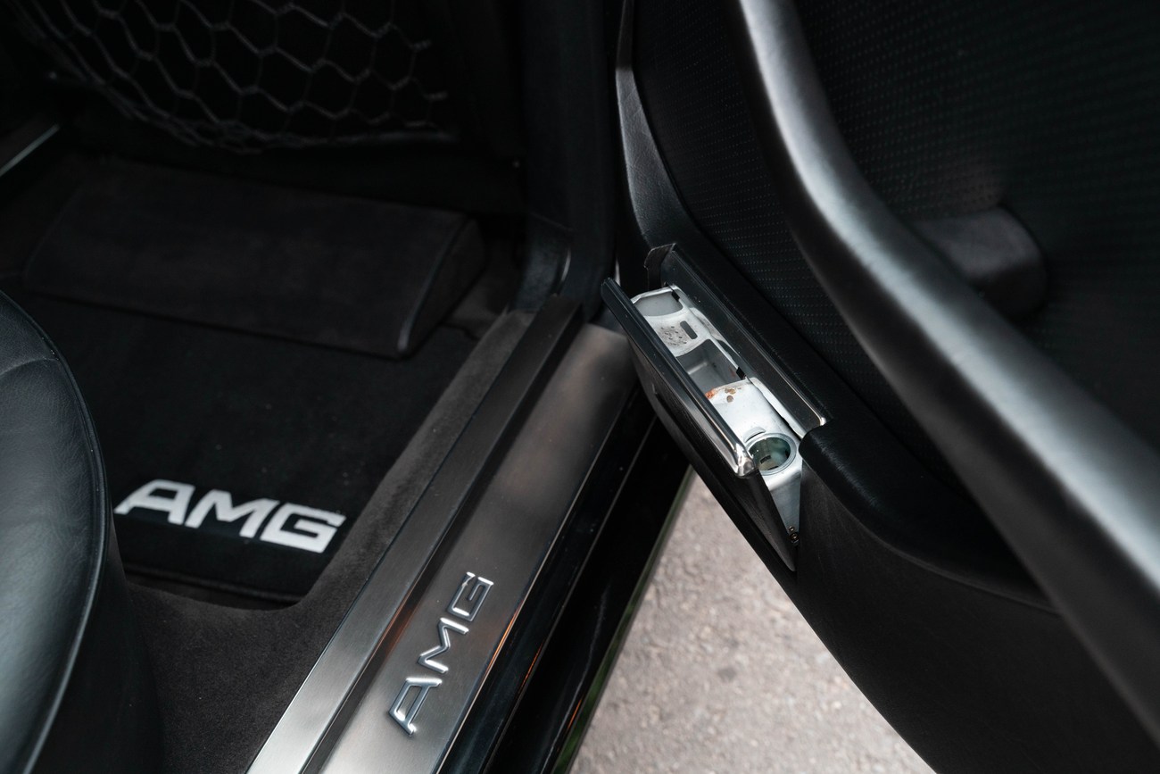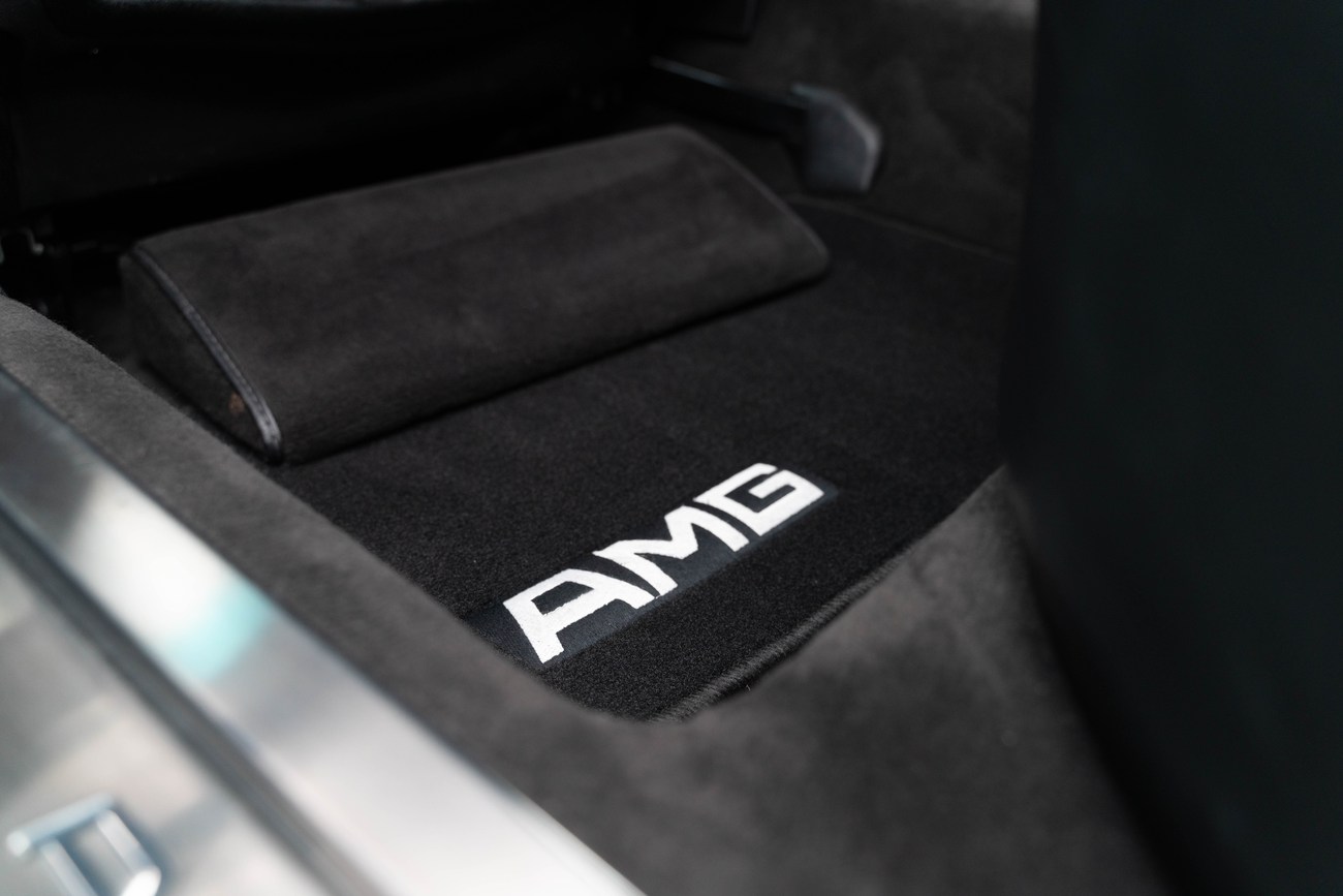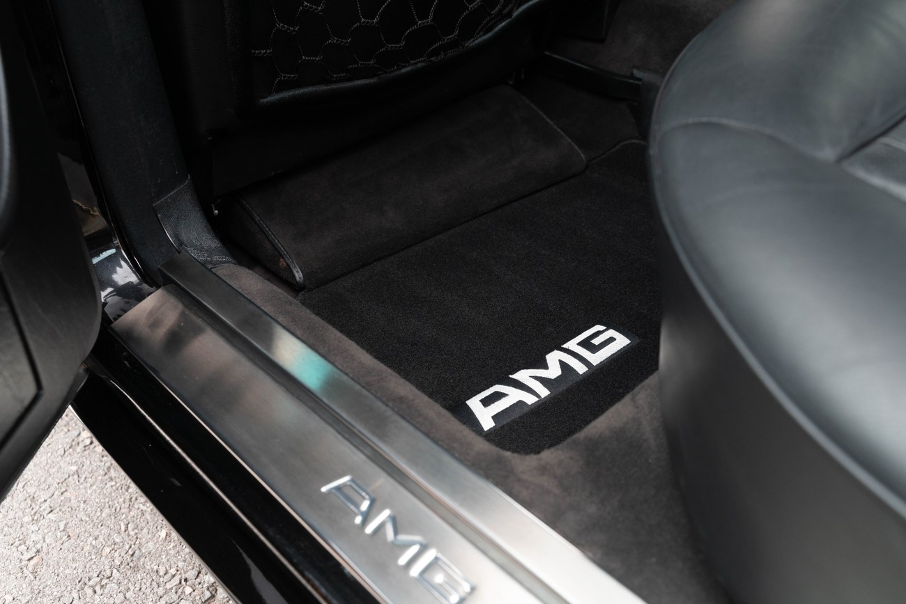 The seating surfaces are upholstered in Black leather (271) with a matching black dashboard, carpets, and doorcards. Burl wood trim accents the center console, shift knob, dashboard, and door panels. Amenities include central locking, automatic climate control, cruise control, dual front airbags, and AMG-labeled carpet floor mats and matching rear passenger footrests. Additionally, the front and rear bench seats are power-adjustable and heated. An Atiwe steering wheel is fitted and the door sills feature the premerger AMG logo.