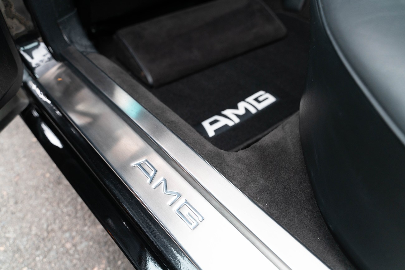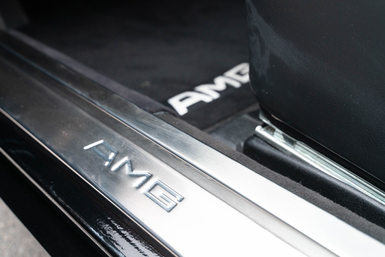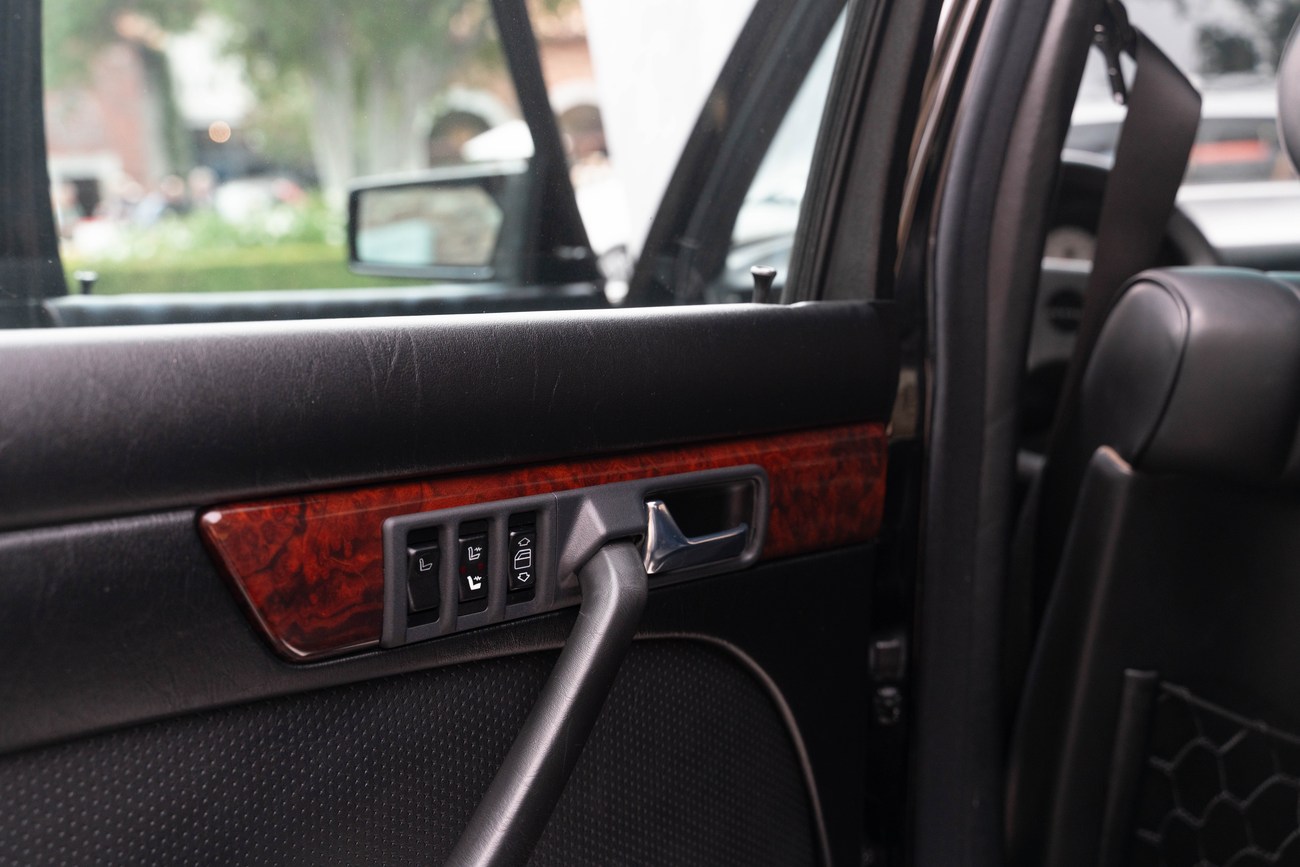 The seating surfaces are upholstered in Black leather (271) with a matching black dashboard, carpets, and doorcards. Burl wood trim accents the center console, shift knob, dashboard, and door panels. Amenities include central locking, automatic climate control, cruise control, dual front airbags, and AMG-labeled carpet floor mats and matching rear passenger footrests. Additionally, the front and rear bench seats are power-adjustable and heated. An Atiwe steering wheel is fitted and the door sills feature the premerger AMG logo.