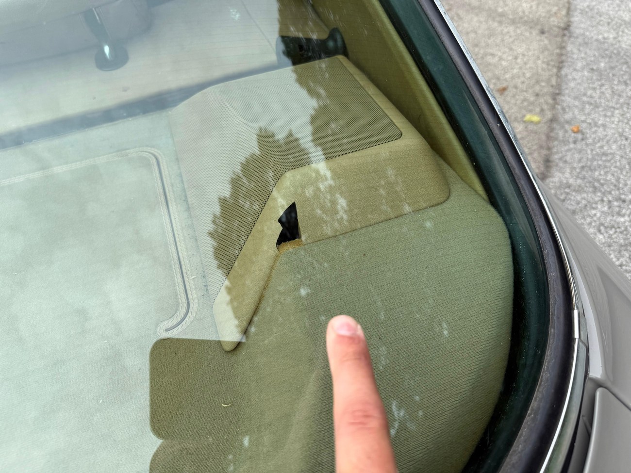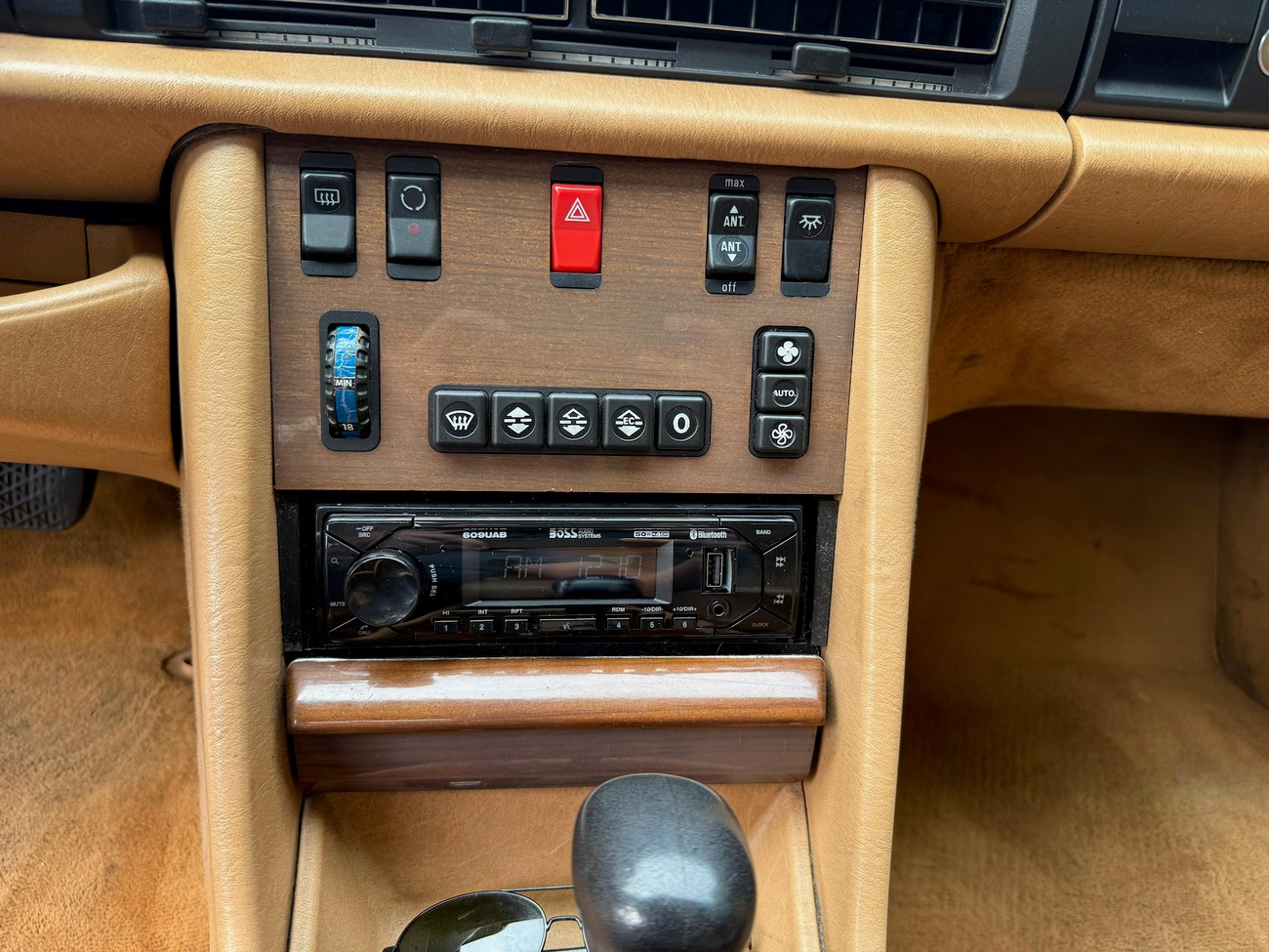 The cabin is trimmed in Palomino Leather (274) with matching carpets, a black dashboard and Zebrano wood trim which lines the center console, dashboard and door panels. The wood trim is in good condition with light fading visible on the upper portions. Both front seats are heated and power adjustable with two-position memory. Interior amenities include automatic climate control, cruise control, a power telescoping steering column, and a Boss head unit with Bluetooth. The leather seating surfaces show some creasing and wear. The seller notes the rear speaker cover and third brake light cover on the rear parcel shelf are cracked.