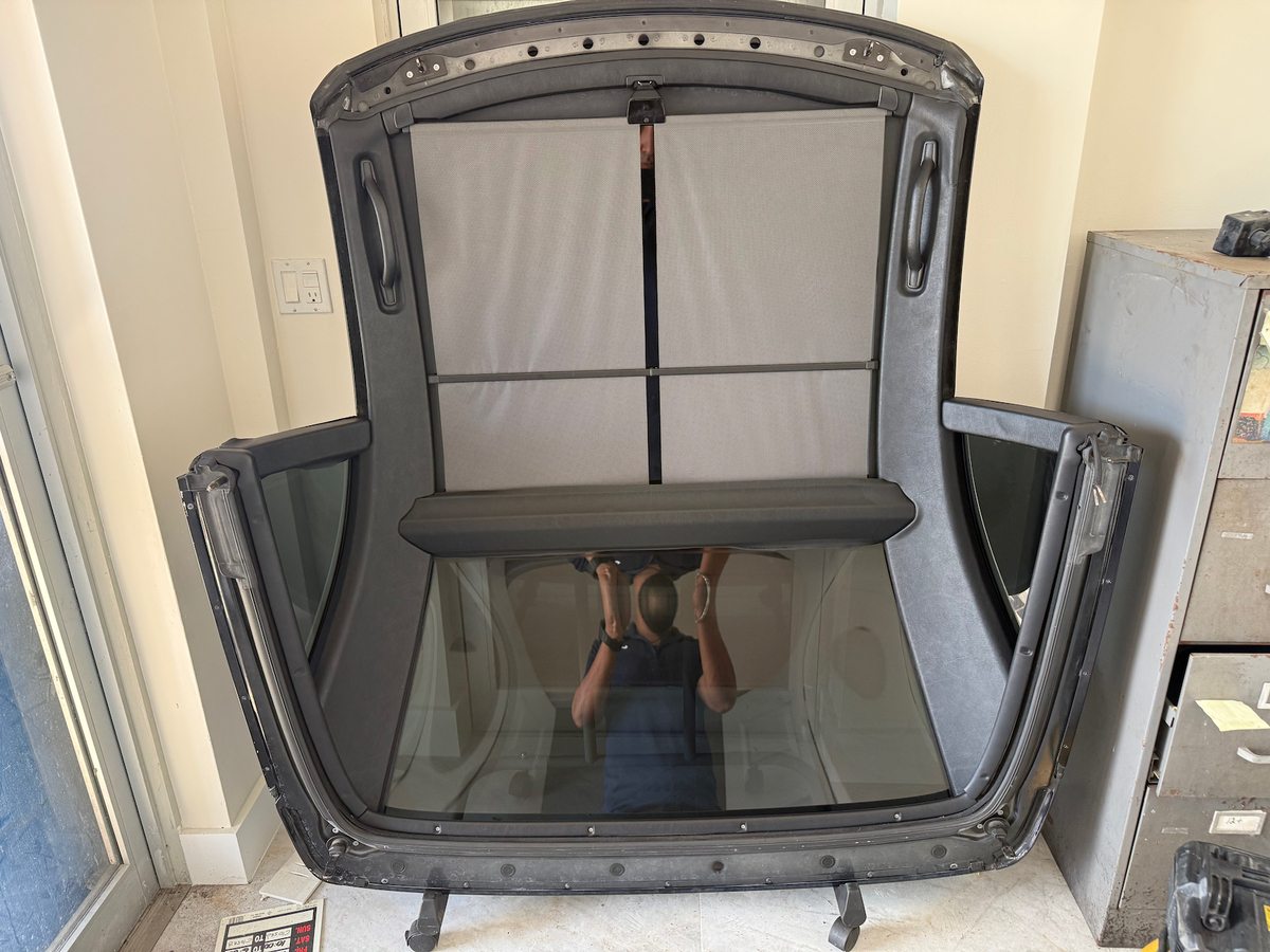 The interior of the top features a retractable sunshade and grab handles on both the driver and passenger sides. The sunshade extends/retracts as designed and the seller notes it is somewhat slow to retract. Photos of the sunshade in both positions are provided in the gallery. The b-pillar vinyl is loose in some areas.