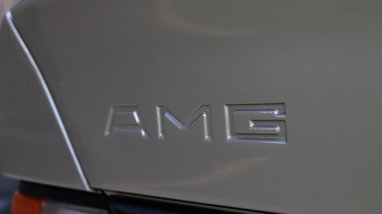 The car is finished in Smoke Silver Metallic (702) under the Midnight Blue Metallic wrap with a full authentic Gen 1 AMG body kit. The body kit consists of both front and rear bumpers, side skirts, and a Westmont molded trunk spoiler, all of which were also used on the AMG Hammer at the time. Additional features include headlight wipers, a painted sunroof with tilt function, and rear antenna. The seller reports there are some blemishes in the paint and the spoiler shows some cracks with pictures provided from the previous listing. The original painted grille has been installed to keep the car period correct and can be seen in photos from the ‘90s with the original owner posting next to his car on the first day of ownership. Richard Buxbaum remembers the client and the car when they built it new. New headlight lenses were installed in 2024.